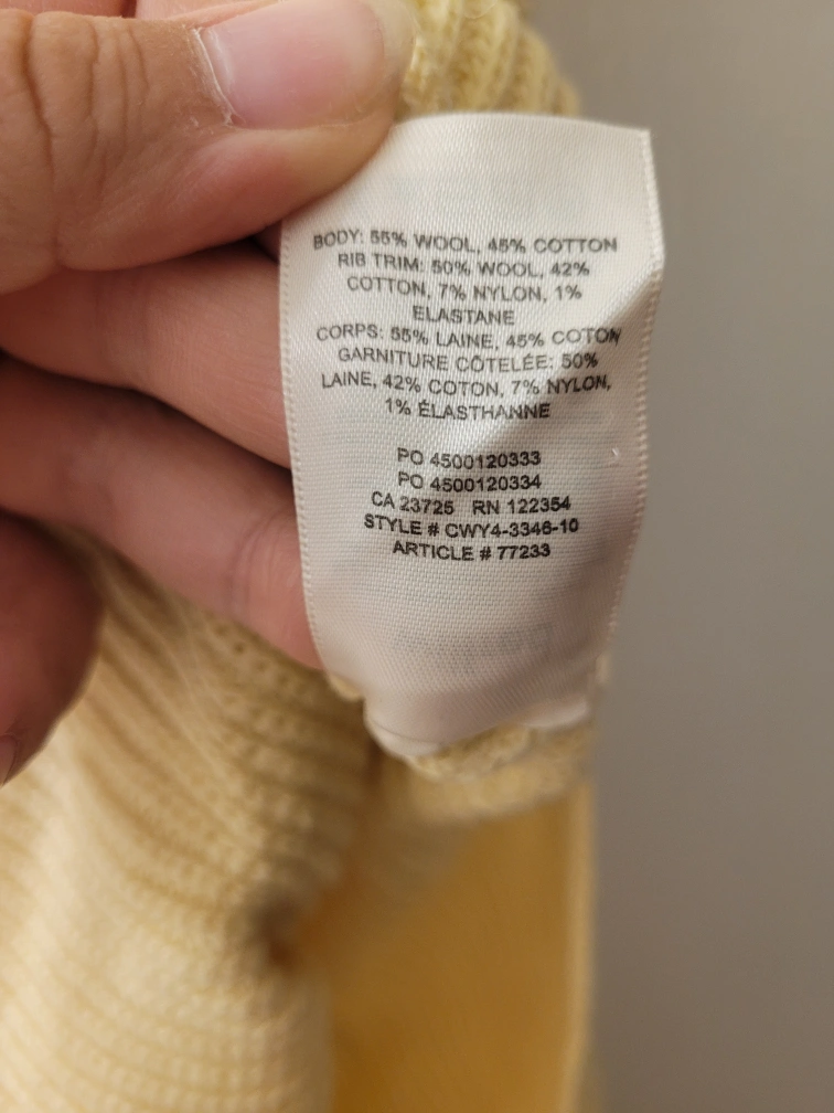 New Wilfred sleeveless knit dress in a soft yellow colour. The body is made of 55% wool and 45% cotton. The rib trim consists of 50% wool, 42% cotton, 7% nylon, and 1% elastane. I remove the tag but never worn it.