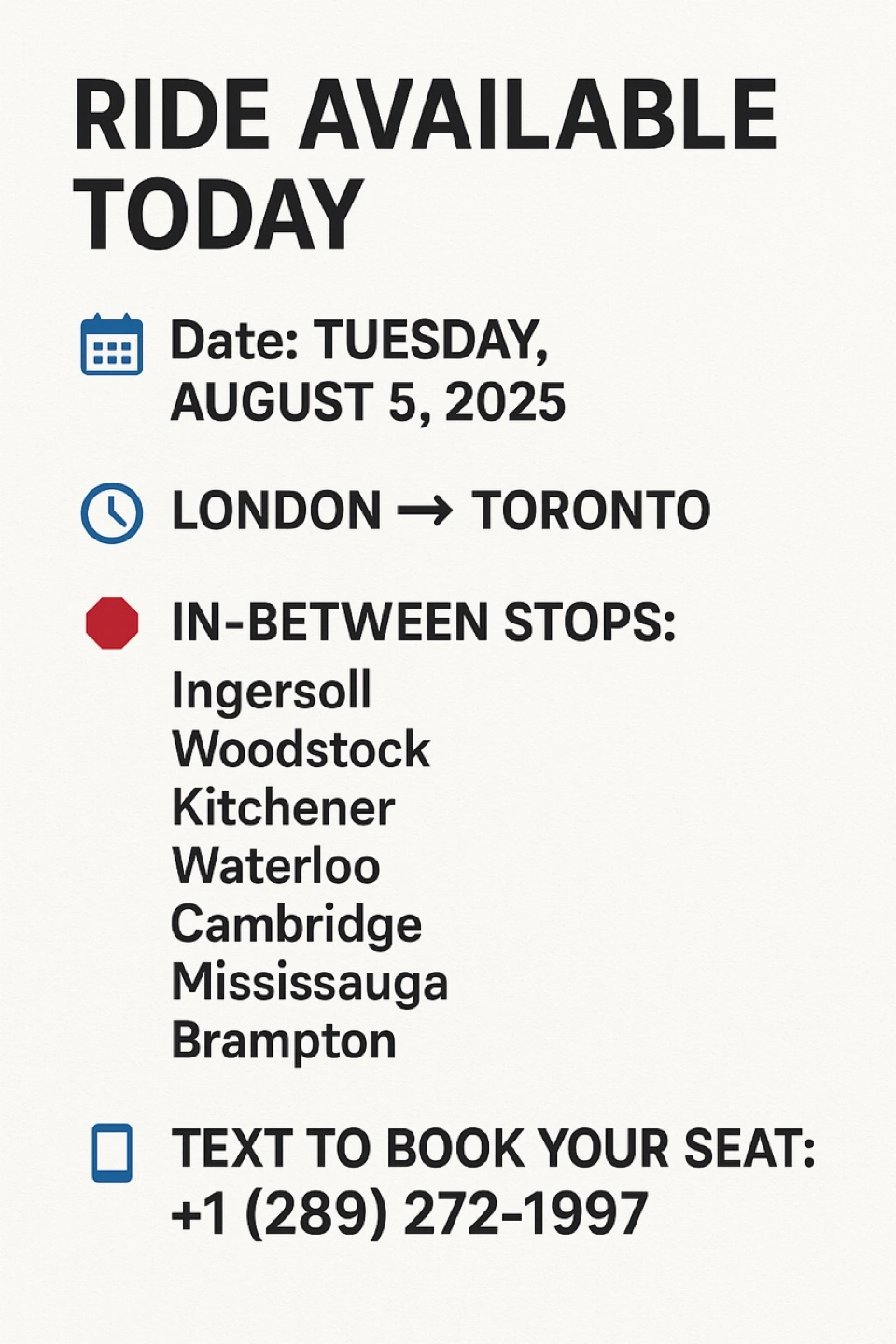 Ride available today, Tuesday, August 5, 2025, from London to Toronto! In-between stops include: Ingersoll, Woodstock, Kitchener, Waterloo, Cambridge, Mississauga, and Brampton. Text +1 (289) 272-1997 to book your seat
