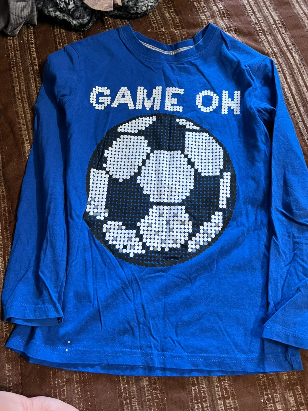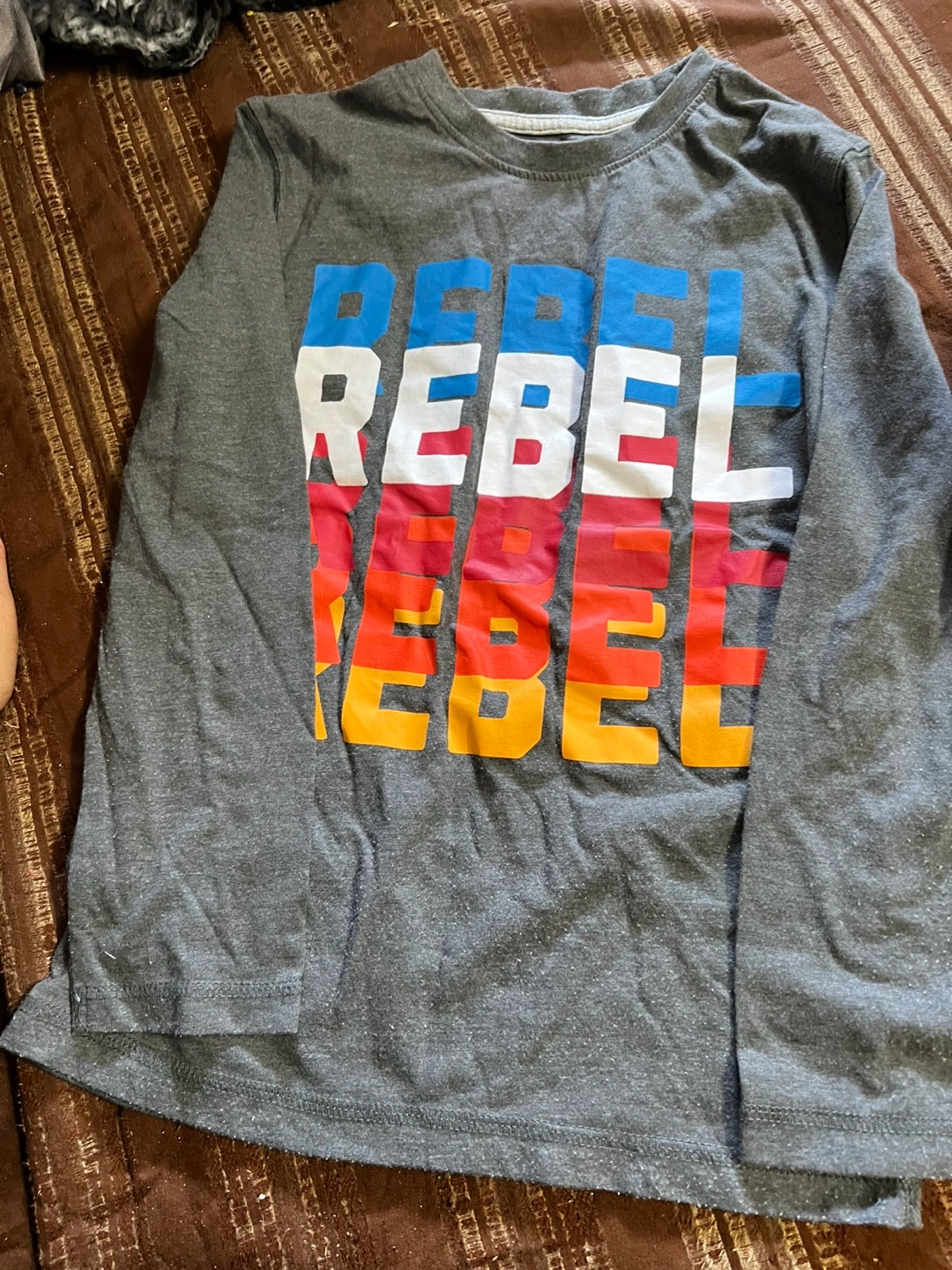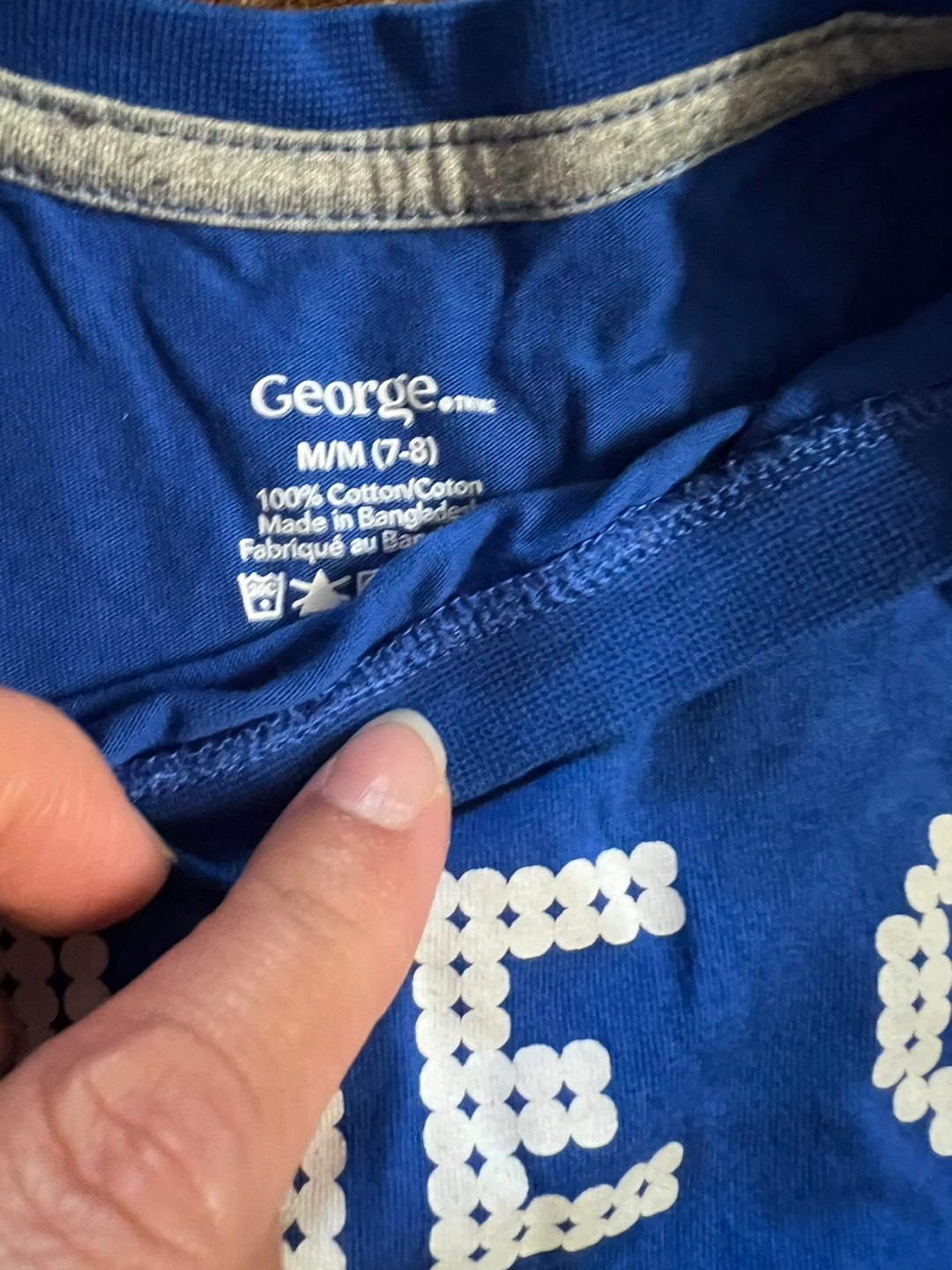Selling a set of George brand gently used long-sleeve (15) fifteen shirts for kids, size M (7-8). There's a grey shirt with a 'Rebel' design, a blue shirt with a soccer ball, and a black shirt with an arcade game design. All shirts are made of 100% cotton