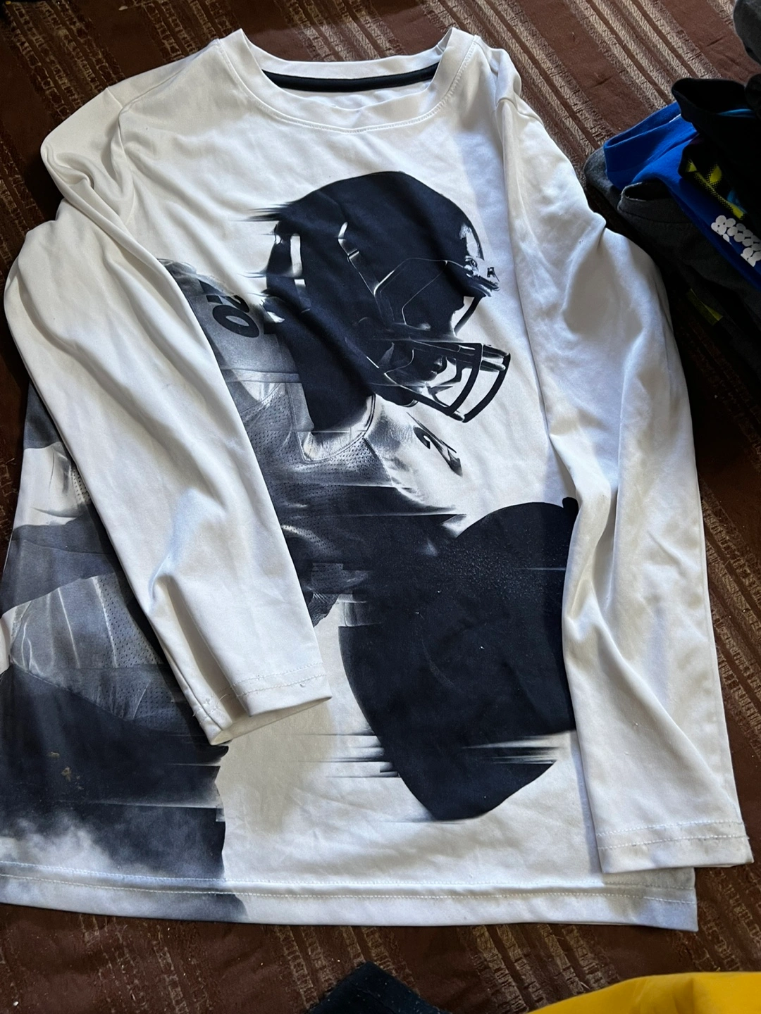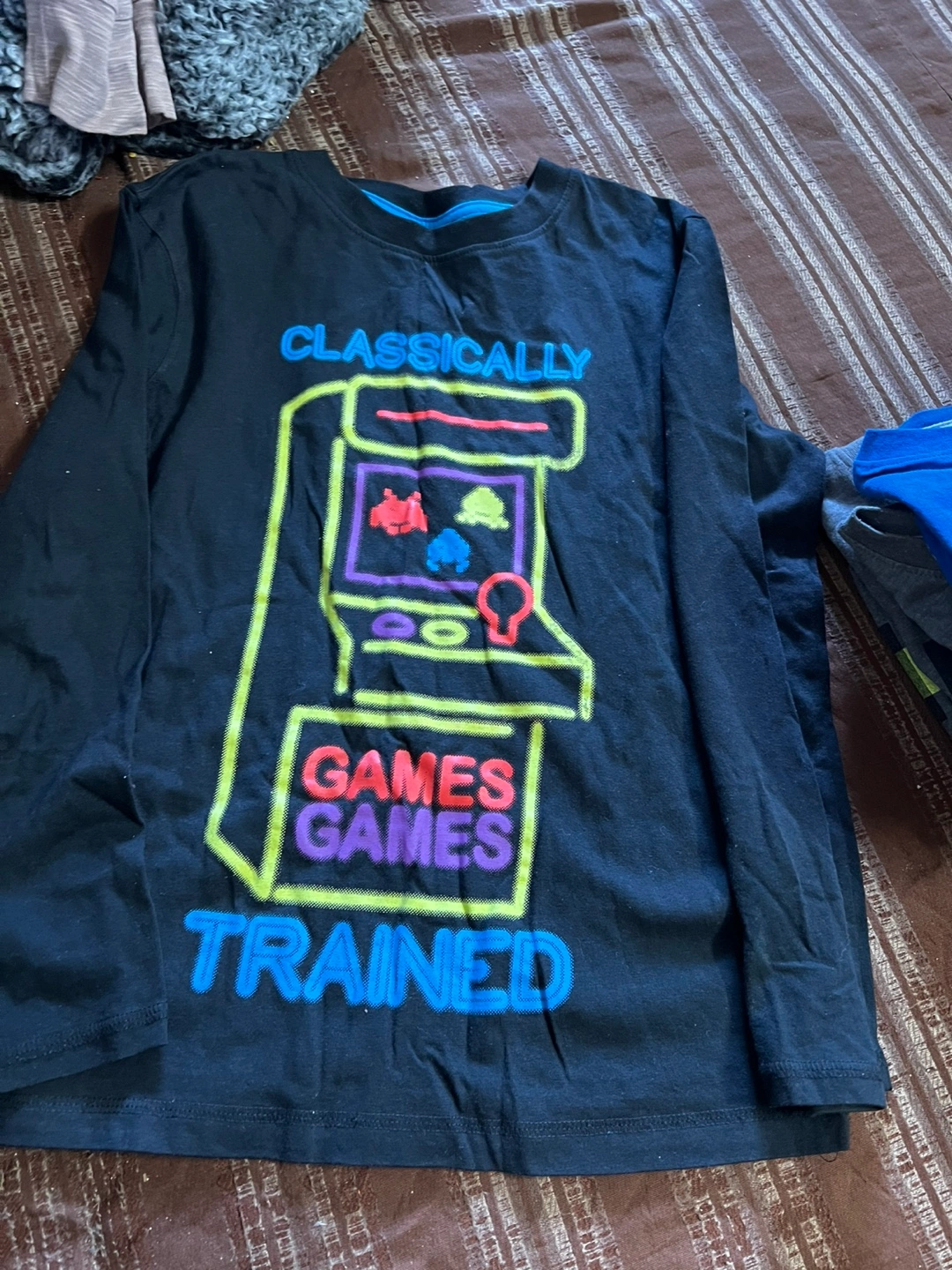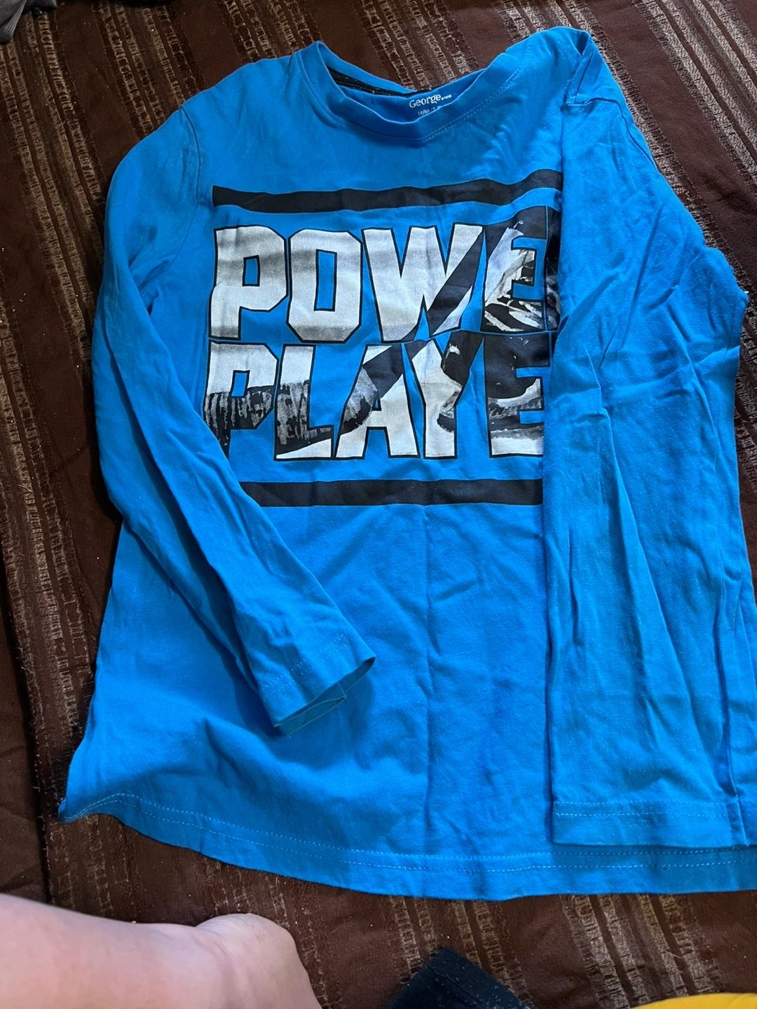 Selling a set of George brand gently used long-sleeve (15) fifteen shirts for kids, size M (7-8). There's a grey shirt with a 'Rebel' design, a blue shirt with a soccer ball, and a black shirt with an arcade game design. All shirts are made of 100% cotton