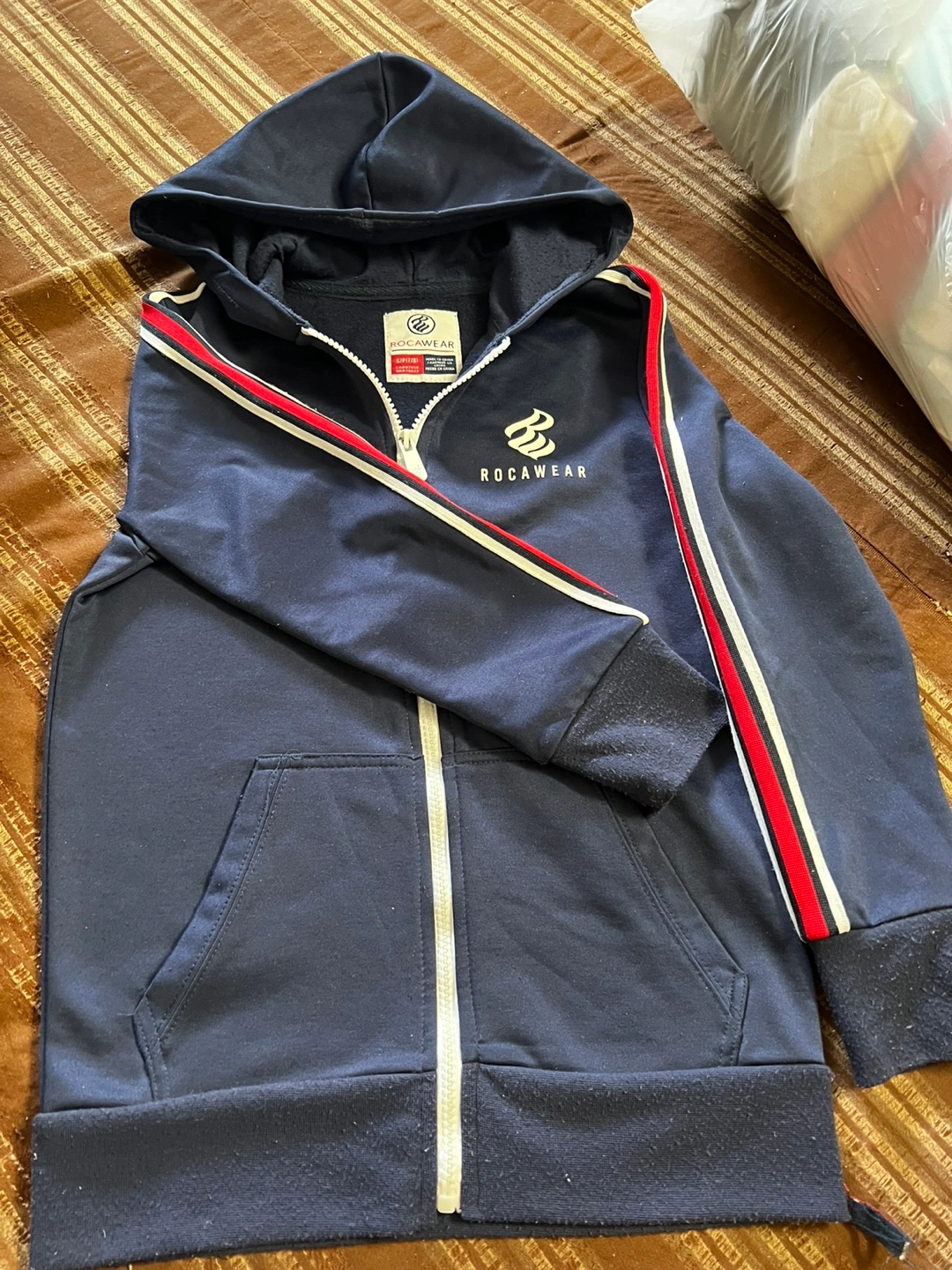 Selling a Rocawear hoodie in size S/P (7/8). It's a navy blue colour with red and white stripes on the sleeves. In good condition!