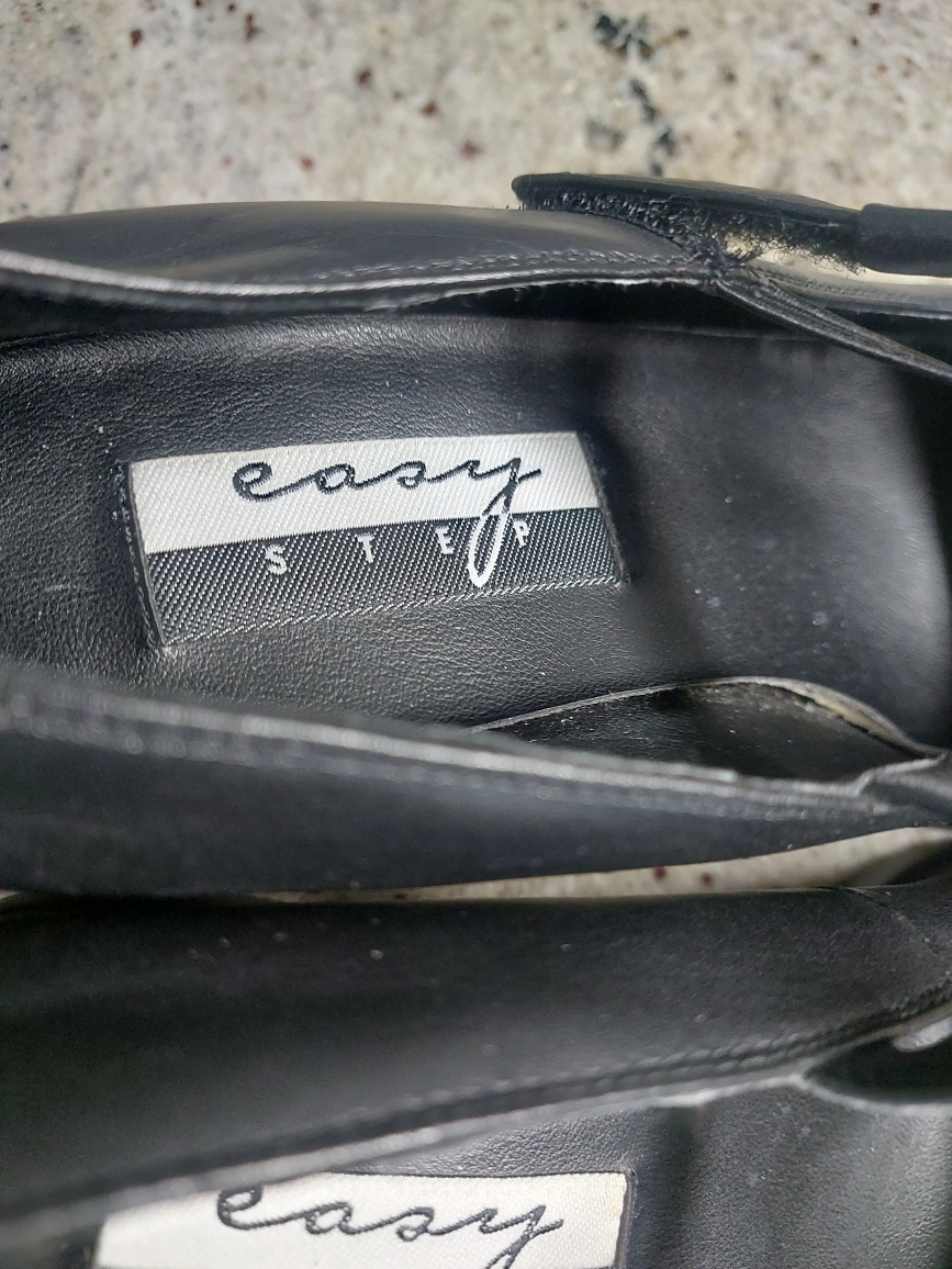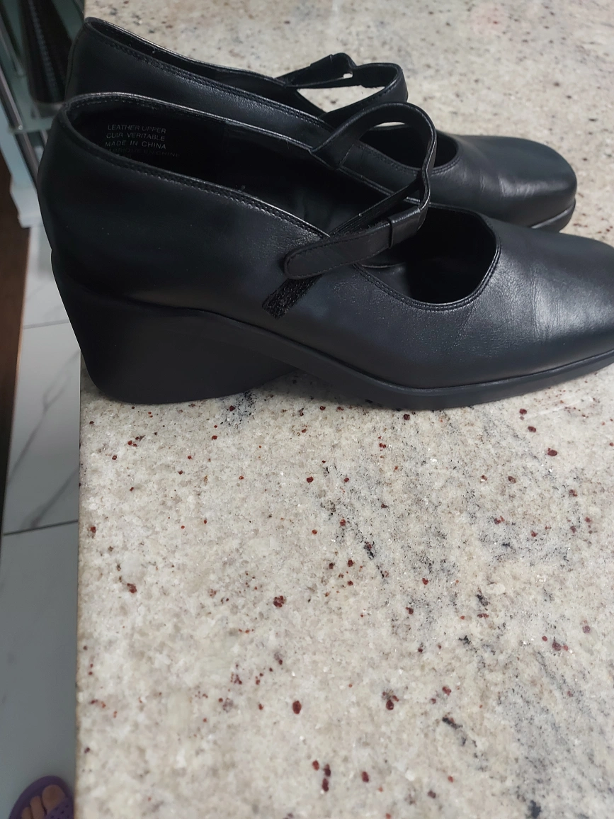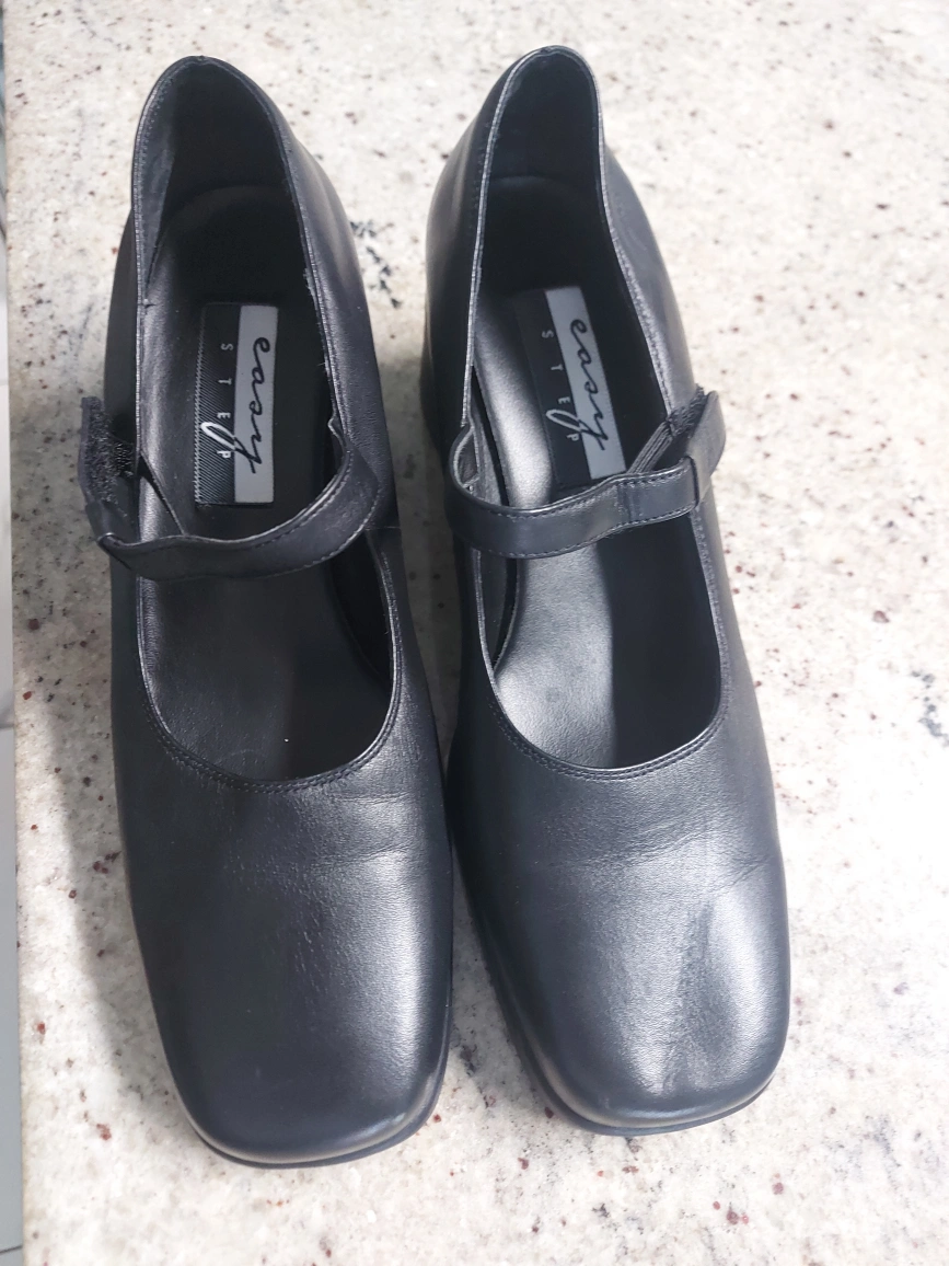 Classic black leather Mary Janes from Easy Step! They have a comfortable, low wedge heel and a strap with a velcro closure. Perfect for work or everyday wear!