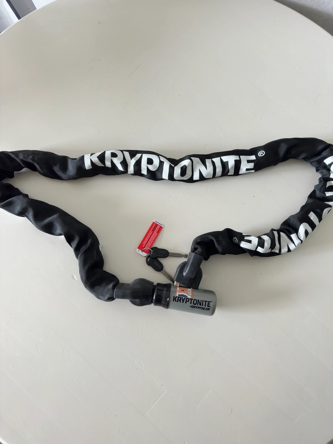 Selling a Kryptonite bike lock with chain! It comes with the keys as shown in the picture. Keep your bike safe and secure with this reliable lock. Extra long chain at 60 inches long.