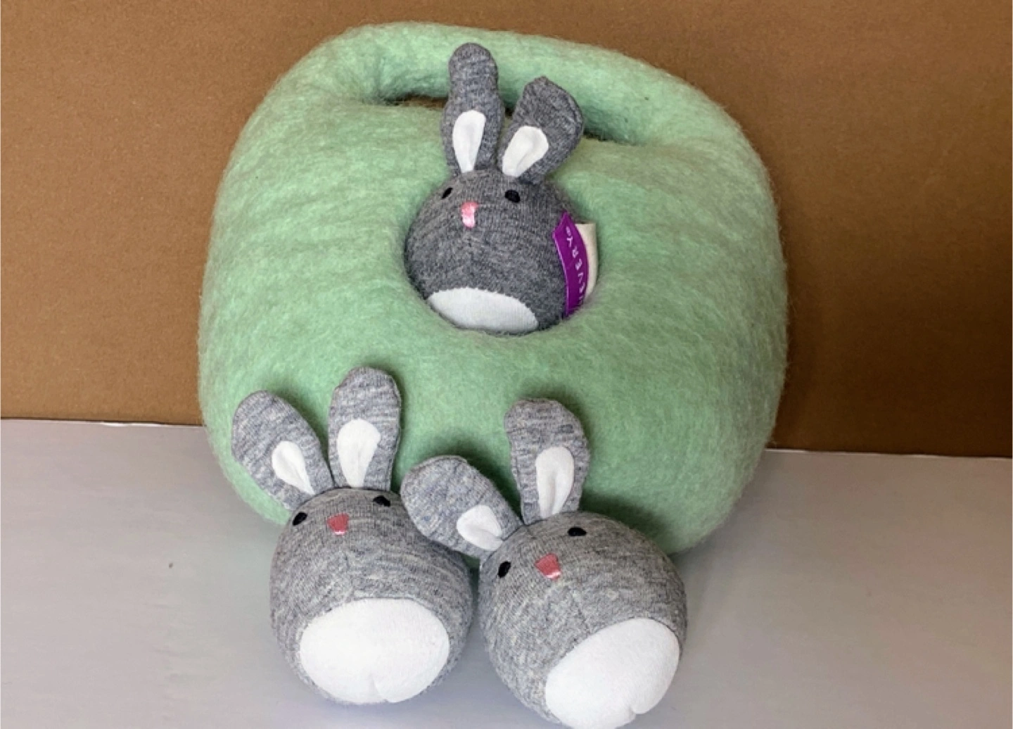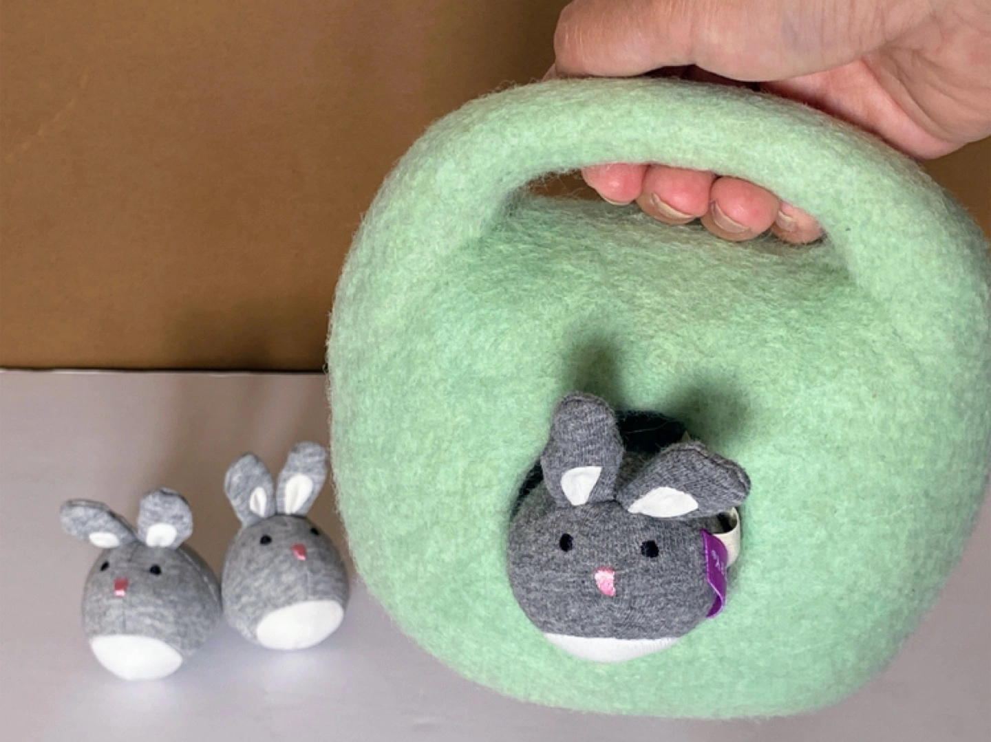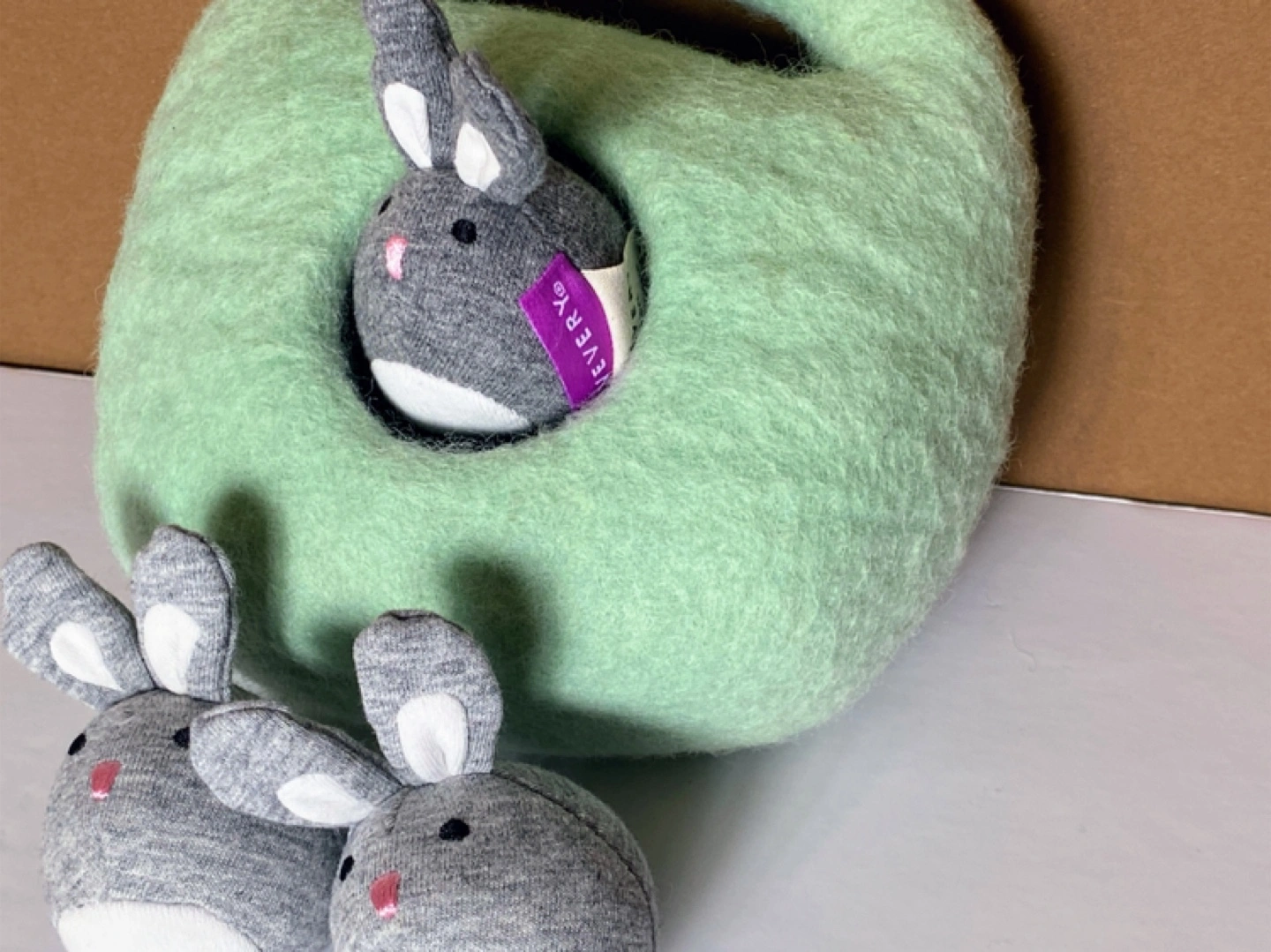 Super cute Lovevery bunny carry nest plush set! This set includes a soft, mint green carry nest and three adorable grey bunny plush toys. Perfect for little ones to snuggle and play with