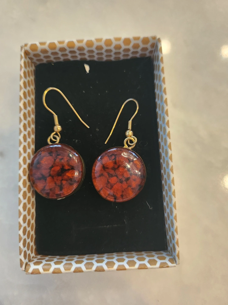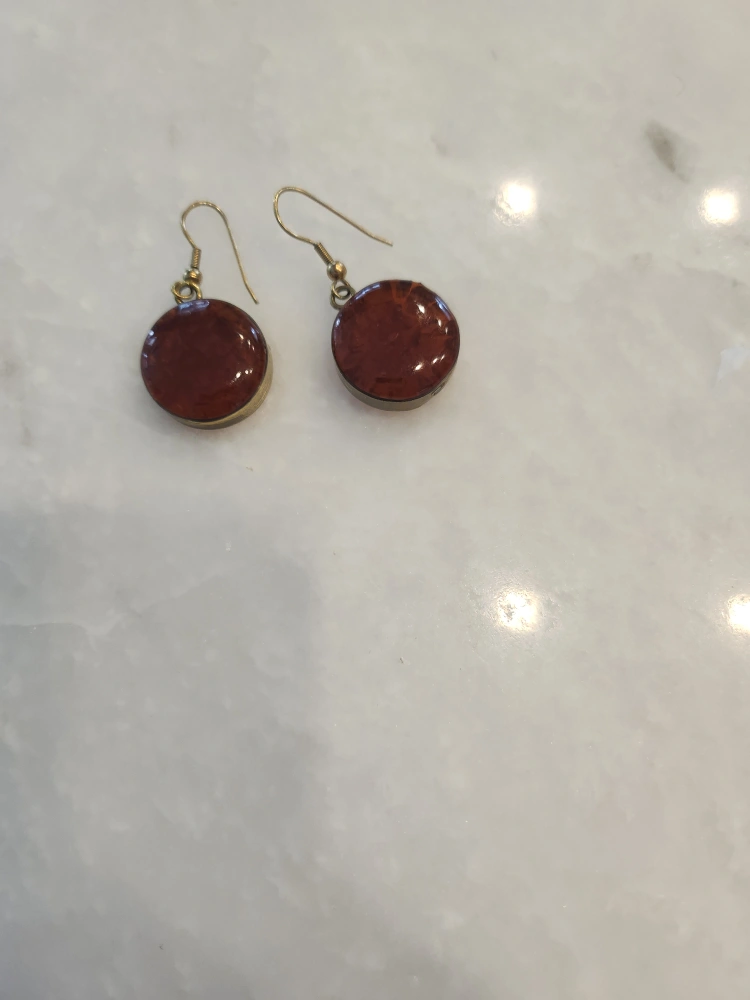 These are a pair of round dangle earrings. They come in a pretty floral box, ready to be gifted or kept safe. The earrings feature a unique design, perfect for adding a touch of charm to any outfit. They're in great condition and looking for a new home
