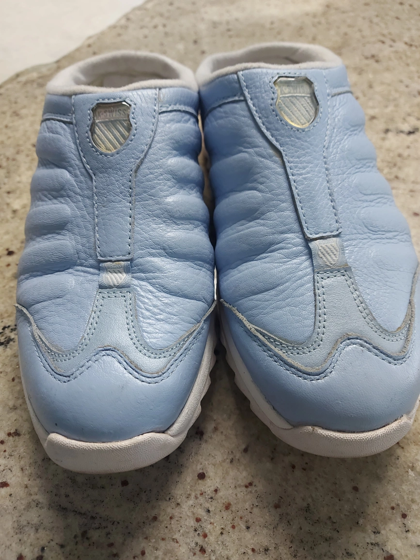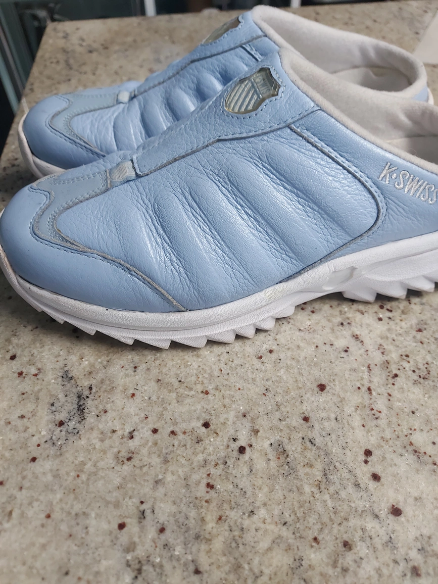 Selling a pair of K-Swiss women's mules in a lovely light blue leather! They're super comfy and easy to slip on. Perfect for running errands or just lounging around the house. They have a sporty look with the classic K-Swiss design.