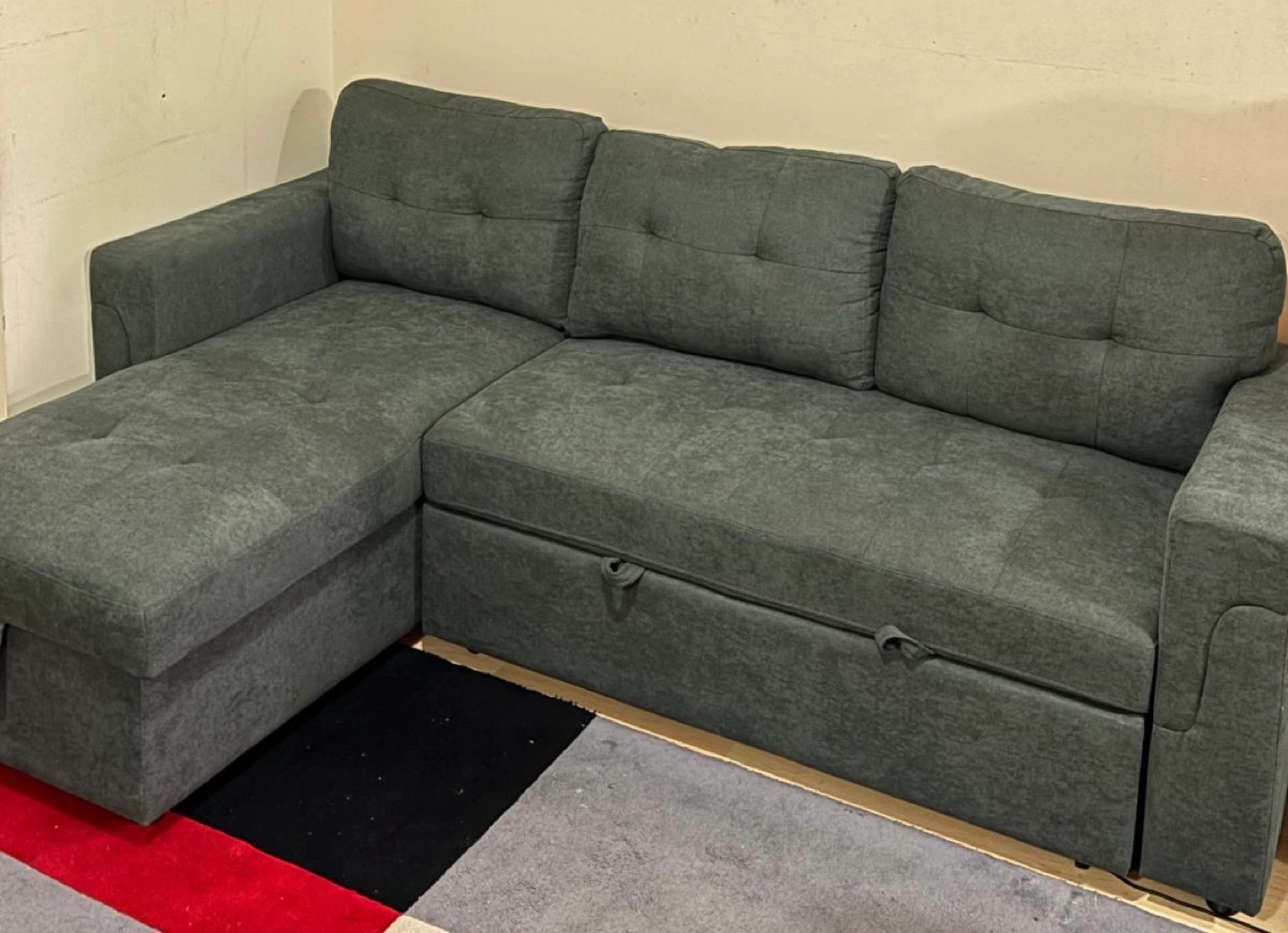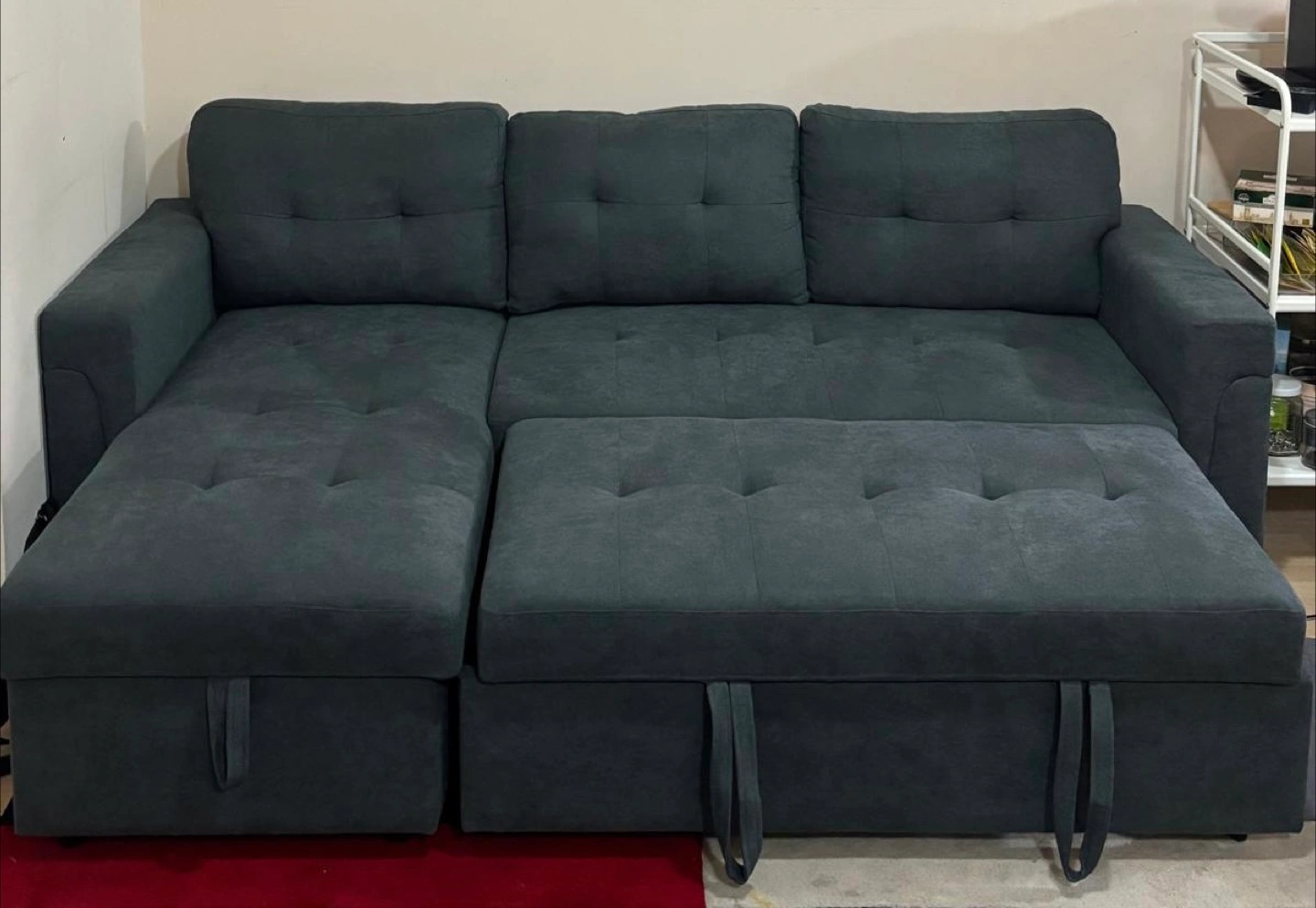 Selling a comfy grey sectional sofa! It is brand new and features a convenient pull-out bed for guests. Perfect for a living room or den, offering both seating and sleeping space. It has a storage underneath the seats.