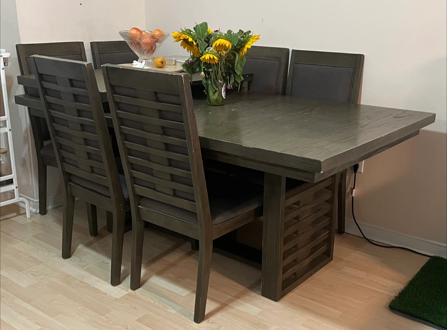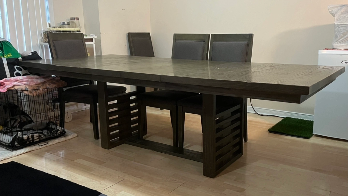 Selling a dining table with six chairs. The set features a dark wood finish. Perfect for family dinners or gatherings! Sturdy dark wood dining table in okay condition with a modern, minimalist design. Comes with six chairs and 2 extra wood inserts to extend the table length. Chairs seat and back are cushioned with minimal stains. Has surface chipping on the top of the table and the sides aswell as the chairs but nothing that affects its function or overall appearance. Perfect for any dining space, and built to last. Priced to sell and open to negotiation — we need it gone quickly!