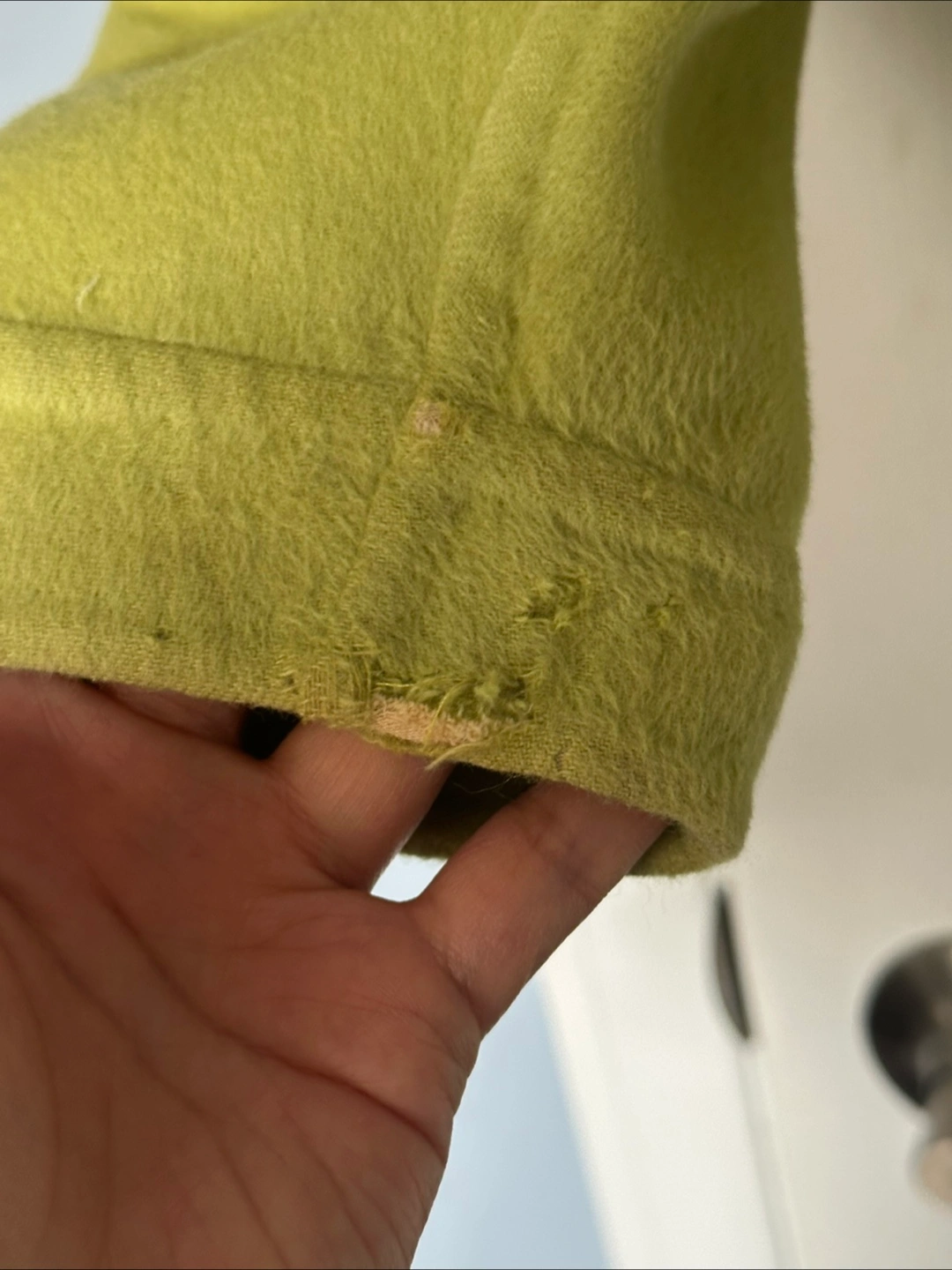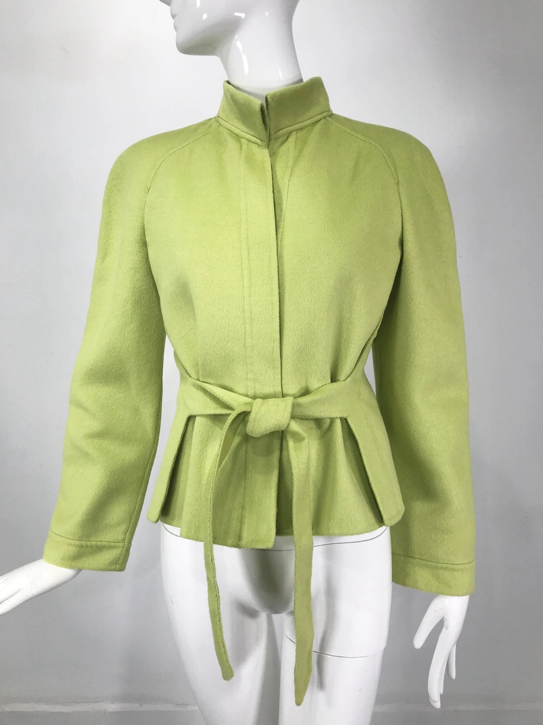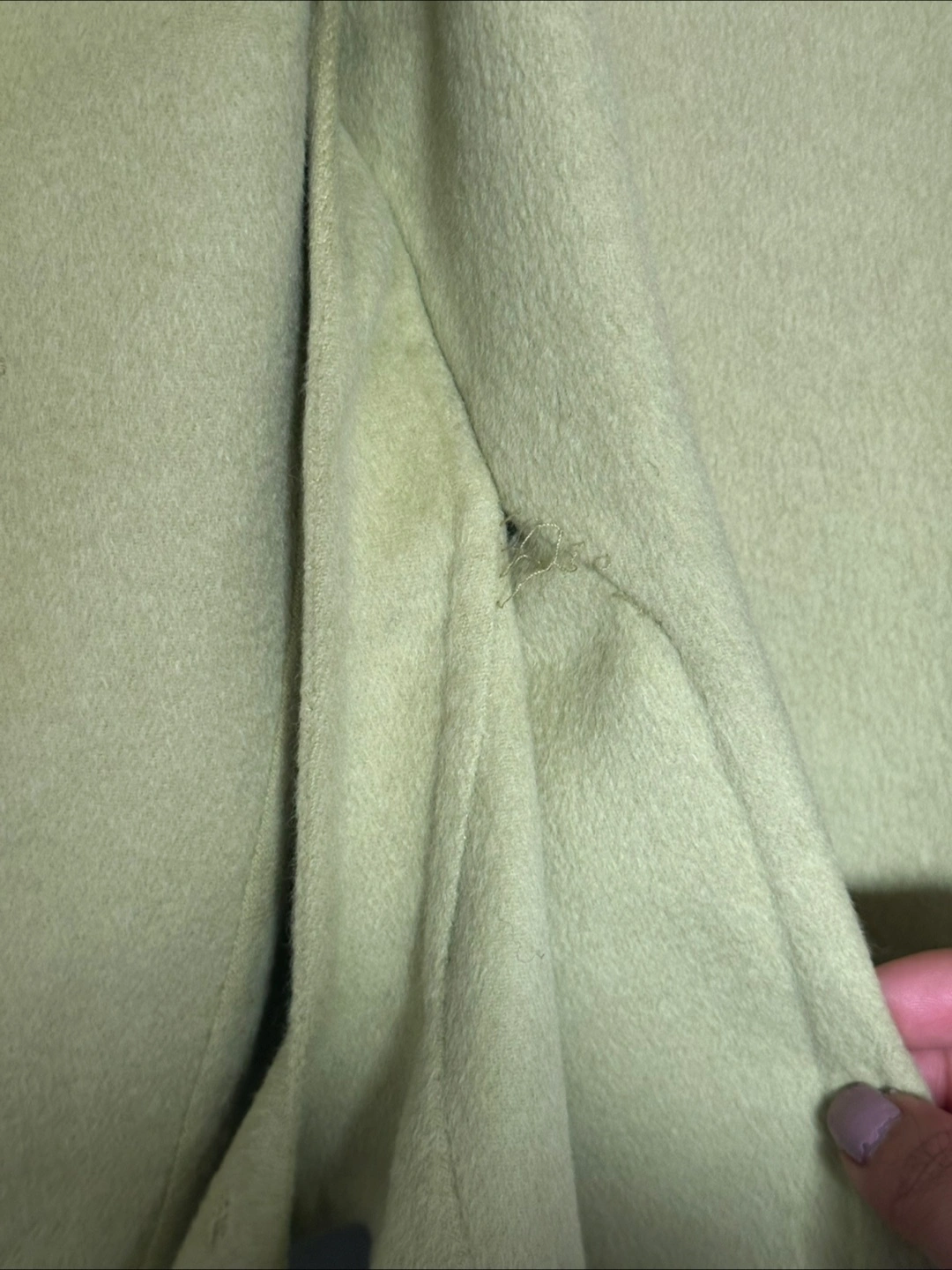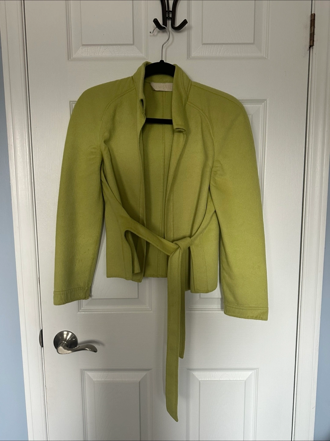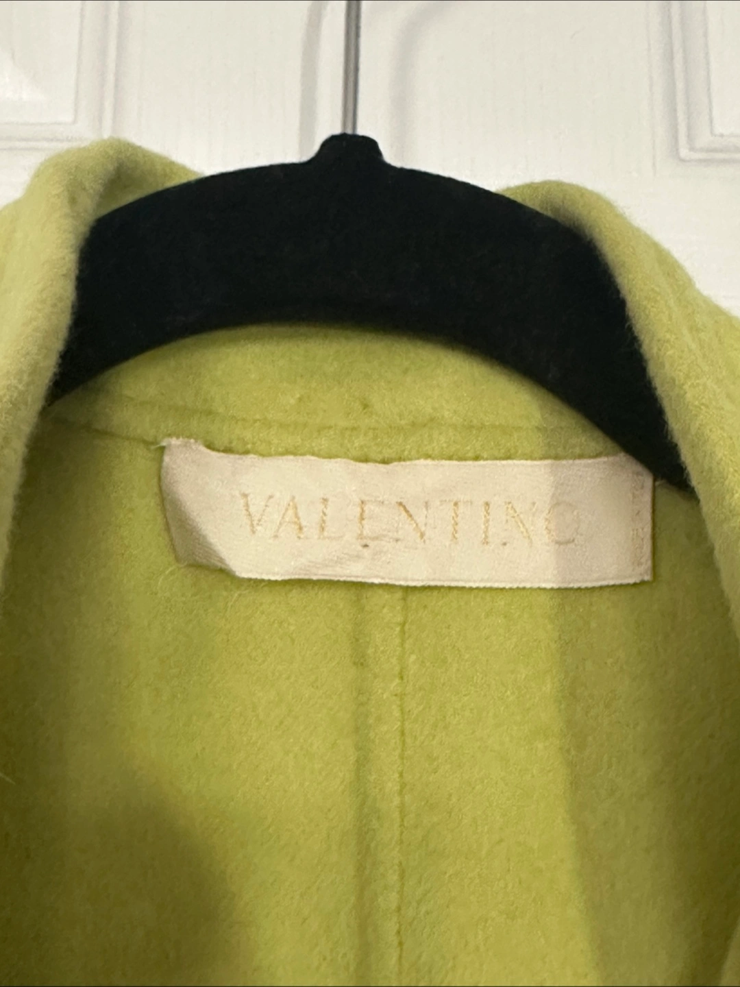 AUTHENTIC one of a kind Vintage Valentino pea green cashmere/wool blend, tie front jacket. Size 6. My mom purchased this jacket at a sample sale years ago. This piece is pre-loved and has visible flaws, but it still has plenty of life left and is priced accordingly for a designer staple. See photos for all details. It just needs a bit of TLC! Note the colour varies by lighting in the photos. The most accurate green can be found in the first picture. Approx measurements (laying flat) Shoulder to hem length: 22.5” Pit to pit: 15.5” Sleeve: 25.5” Double face wool jacket with raglan sleeves, band collar and amazing sewing details. Lightweight, unlined jacket is perfect for fall or spring. Perfect for: Transitional fall/winter wear, classic layering, fans of vintage designer fashion ⸻ #Valentino #DesignerCoat #CashmereCoat #WoolCoat #PeaCoat #LuxuryFashion #FallStyle #VintageValentino #GreenCoat #SageGreen #OuterwearGoals #CozyChic #ClassicStyle #QuietLuxury #MinimalistWardrobe