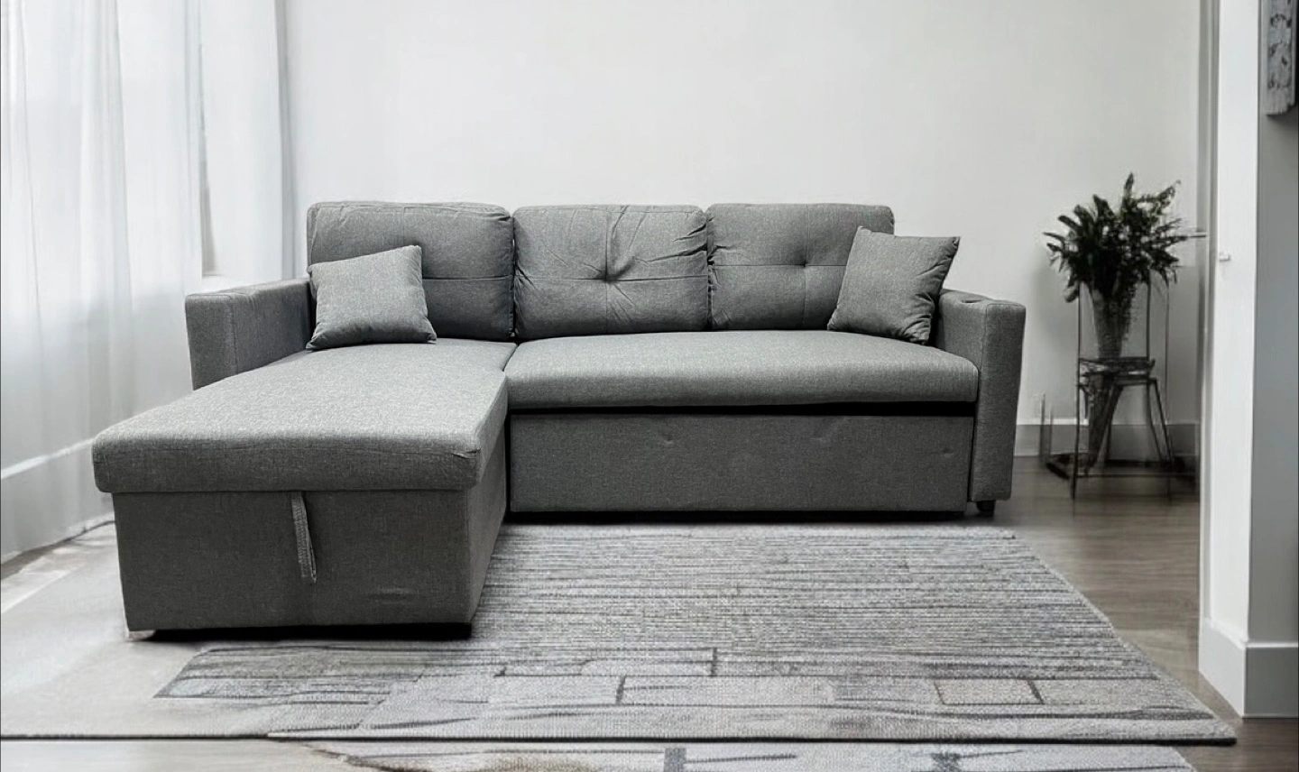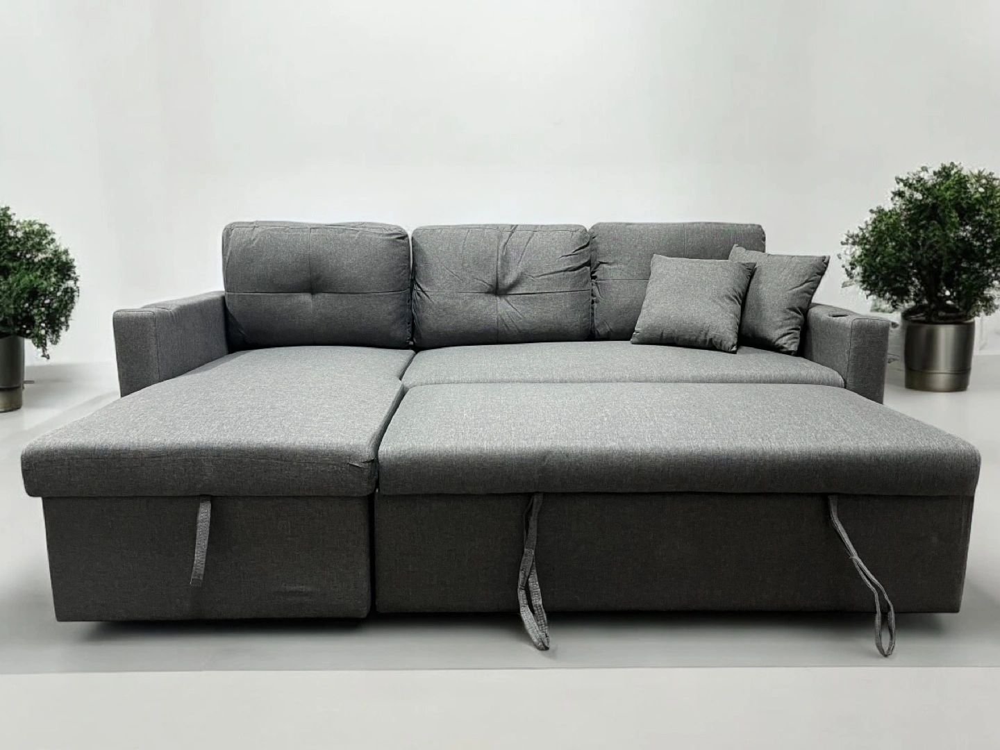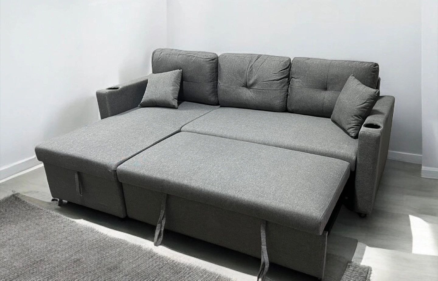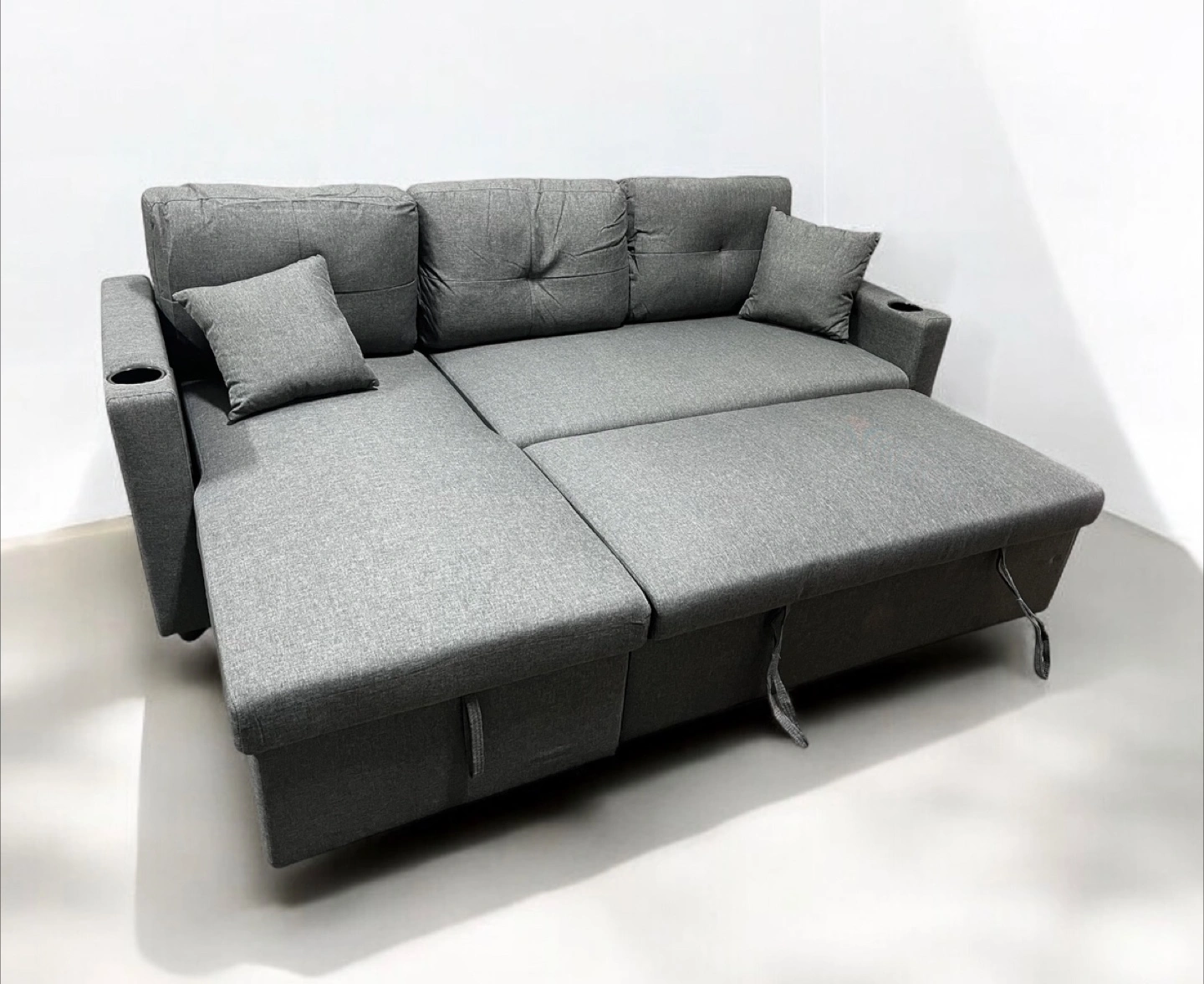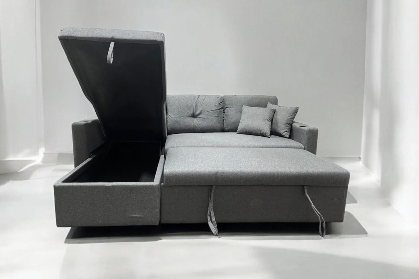 Versatile L-shaped sofa bed with built-in storage. Easily converts from sofa to bed, with generous storage space hidden underneath the L-shape. Perfect for maximizing space in any room. Limited stock. Also comes with a USB port. Get while you can!