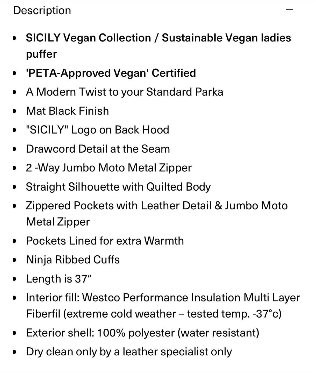 Selling a Mackage Sicily Vegan Collection puffer jacket in size small! It's a sustainable vegan ladies puffer, PETA-Approved Vegan certified. Here are some details: - Straight silhouette with quilted body - 2-Way Jumbo Moto Metal Zipper - Pockets lined for extra warmth - Ninja ribbed cuffs - Length is 37" - Exterior shell: 100% polyester (water resistant) - Interior fill: Westco Performance Insulation Multi Layer Fiberfil (extreme cold weather - tested temp. -37°c) - Dry clean only by a leather specialist only