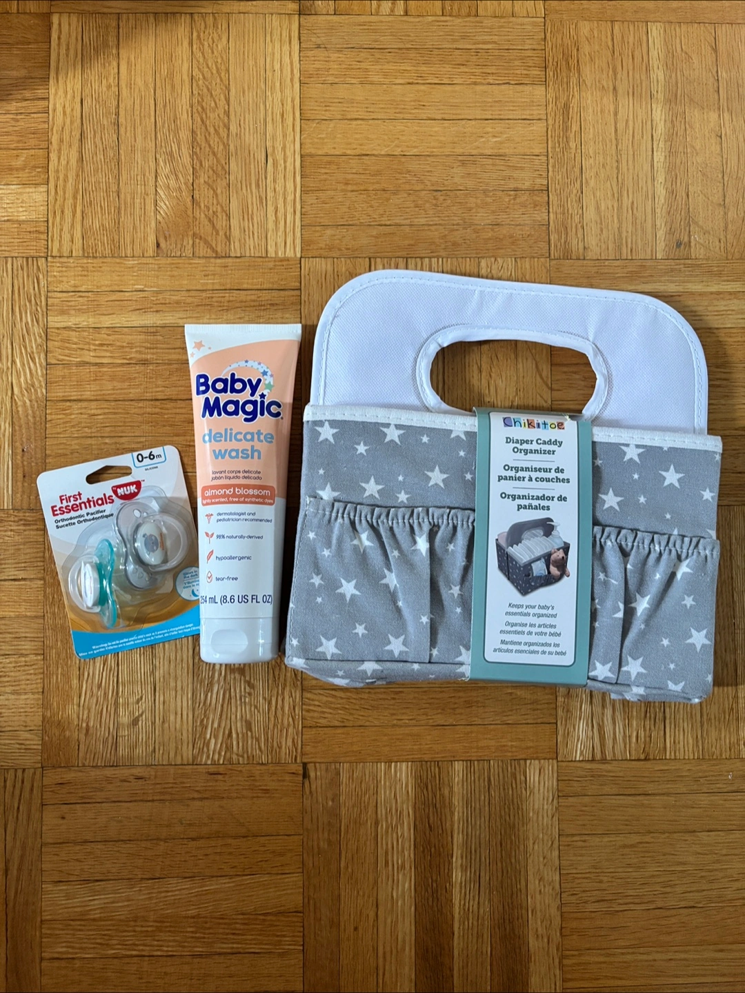 Selling a few baby essentials: - NUK First Essentials Orthodontic Pacifier (0-6m) - Baby Magic Delicate Wash (almond blossom, 254 mL) - Chikitoe Diaper Caddy Organizer