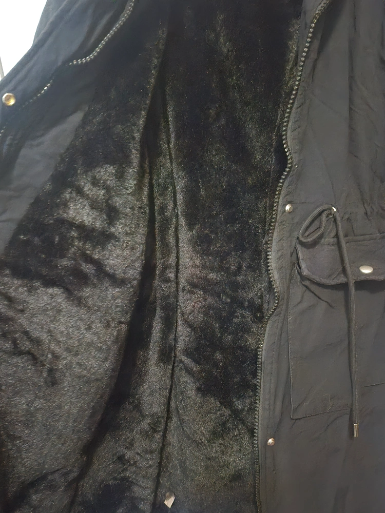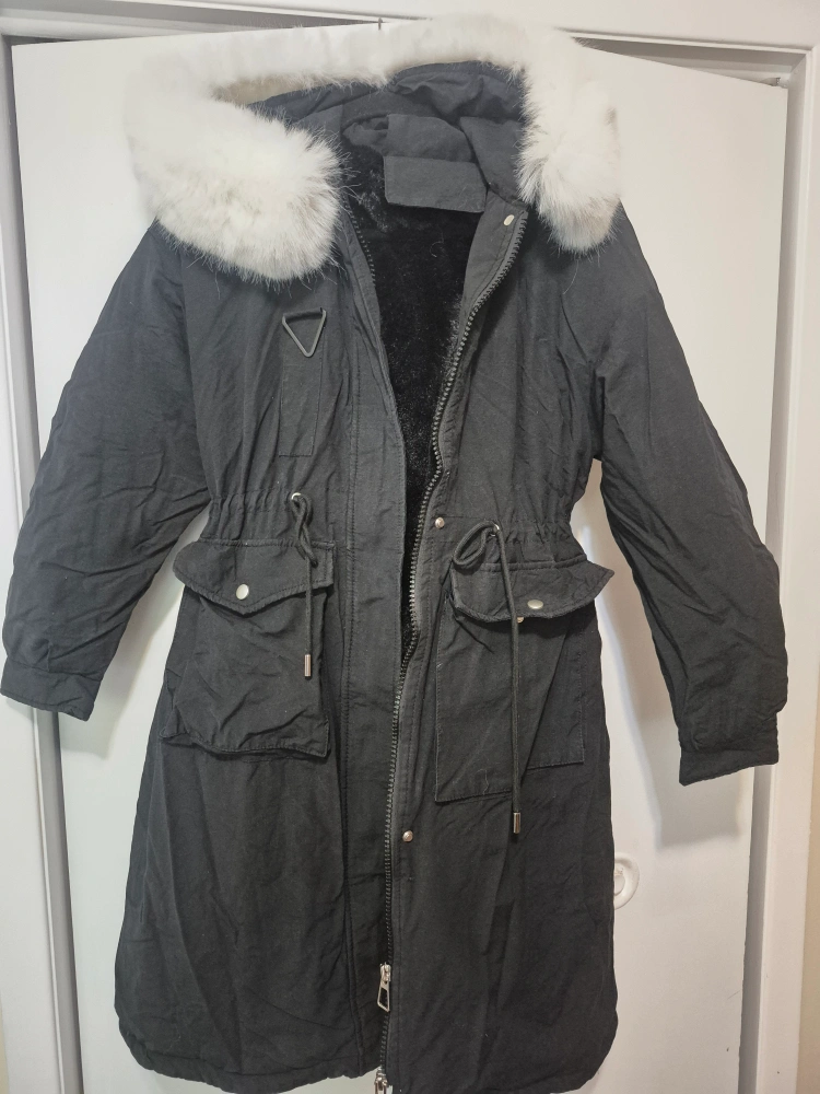 Selling a cozy black winter coat with a soft fur lining to keep you warm during those chilly days! It has a drawstring waist for a flattering fit and a faux fur trimmed hood. Perfect for staying stylish and snug all season long
