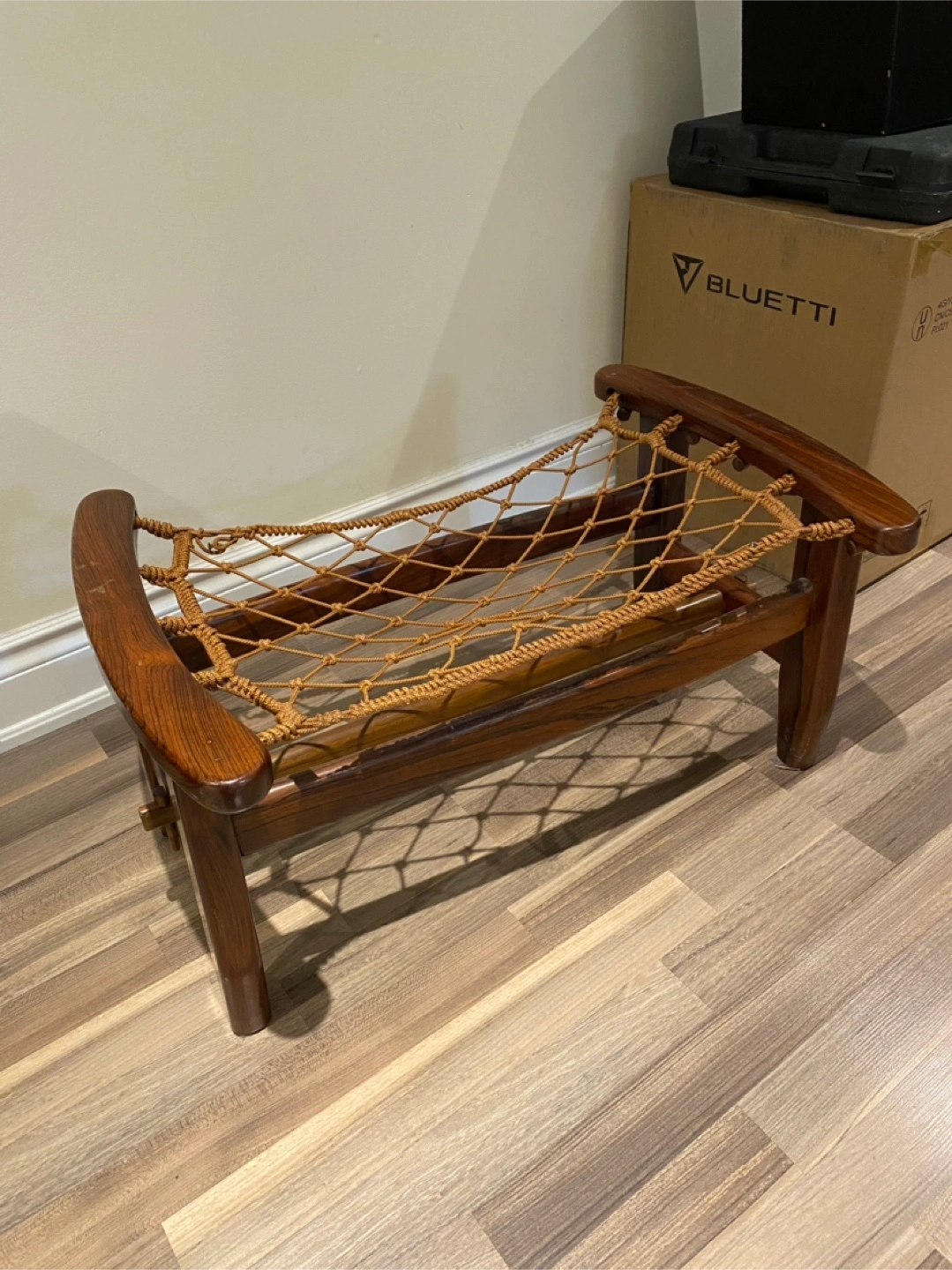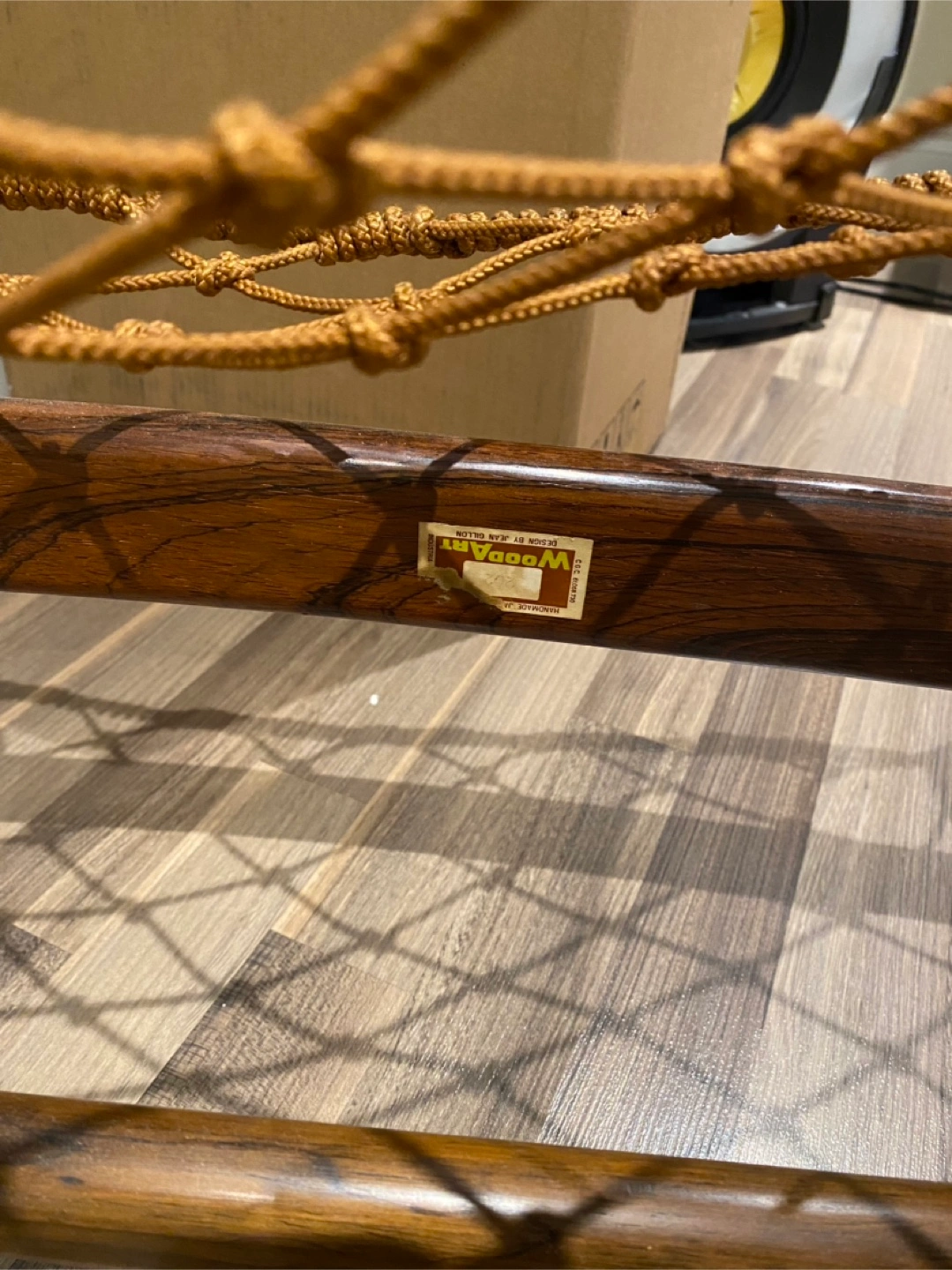 Selling a Woodart stool designed by Jean Gillon. It has a nice wooden frame with a woven rope seat. There are some signs of wear, like a few scratches on the wood, but overall it's in good shape Goes for $800 new