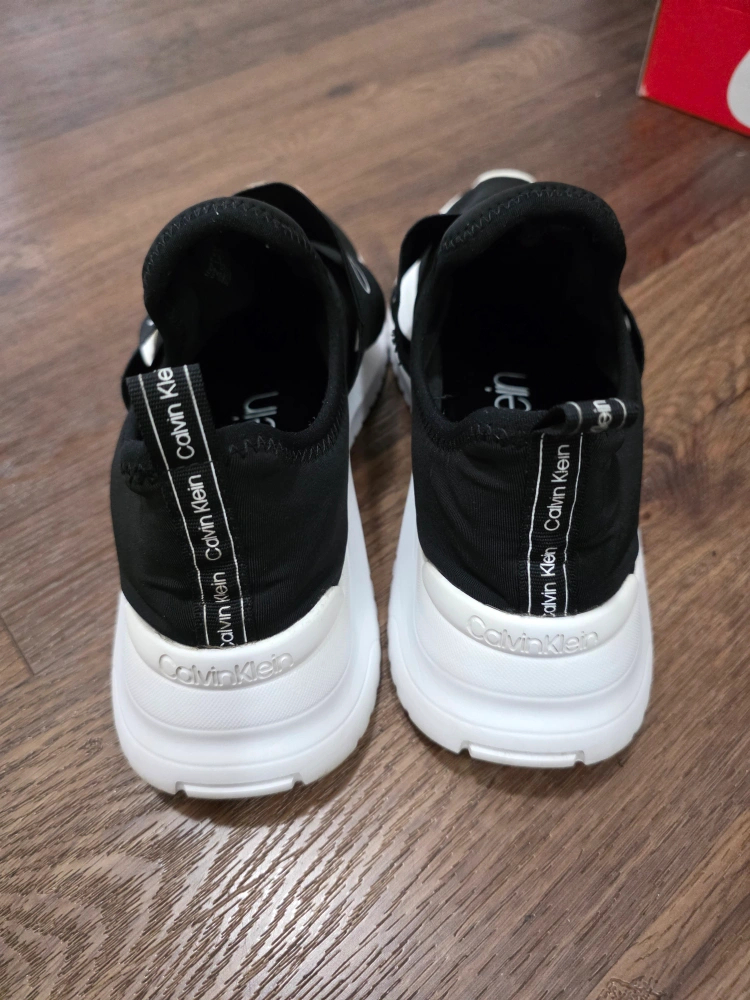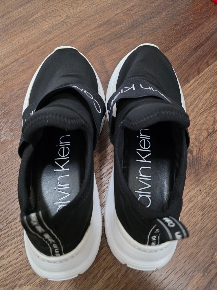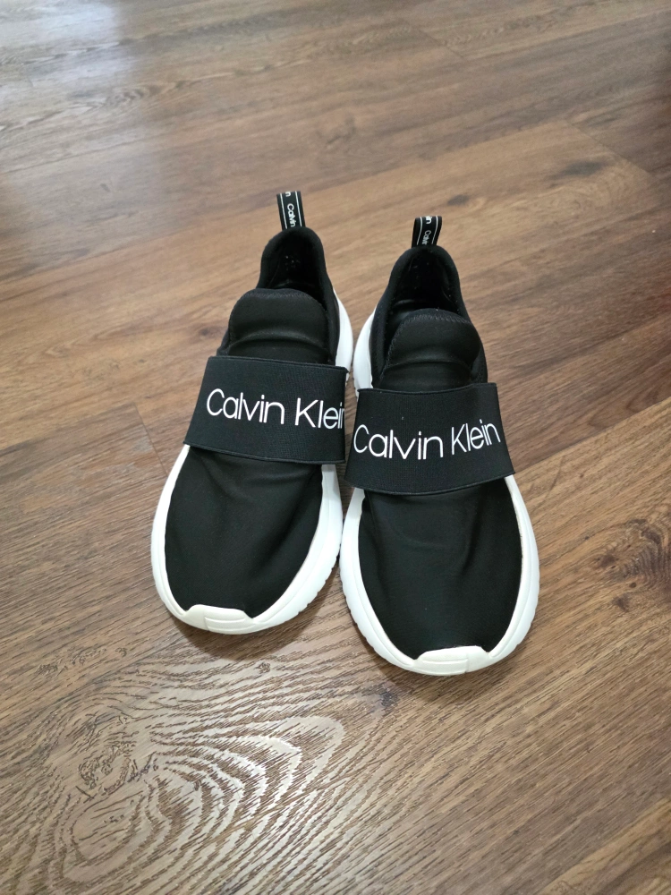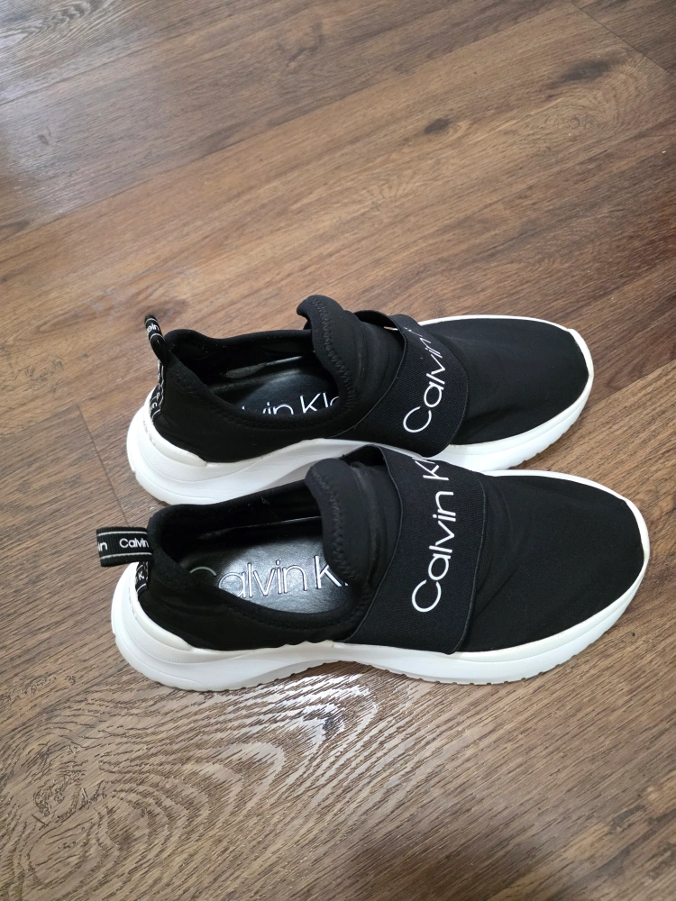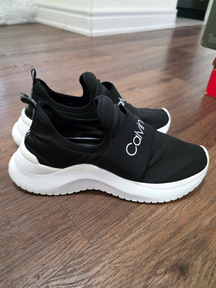 Selling a pair of Calvin Klein slip-on sneakers! They're black with white soles and have the Calvin Klein logo on the strap and soles. Super comfy and easy to wear! Excellent condition, not worn much. Selling because downsizing my shoes collection. Size US 8 - EU 38 - Retail price was $70 Can include a shoe box for storage