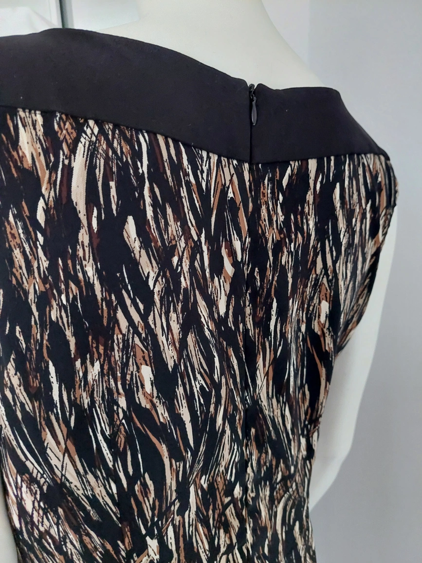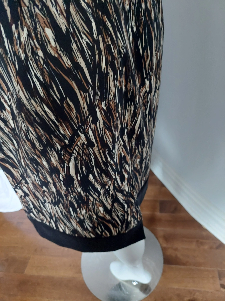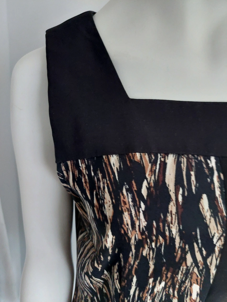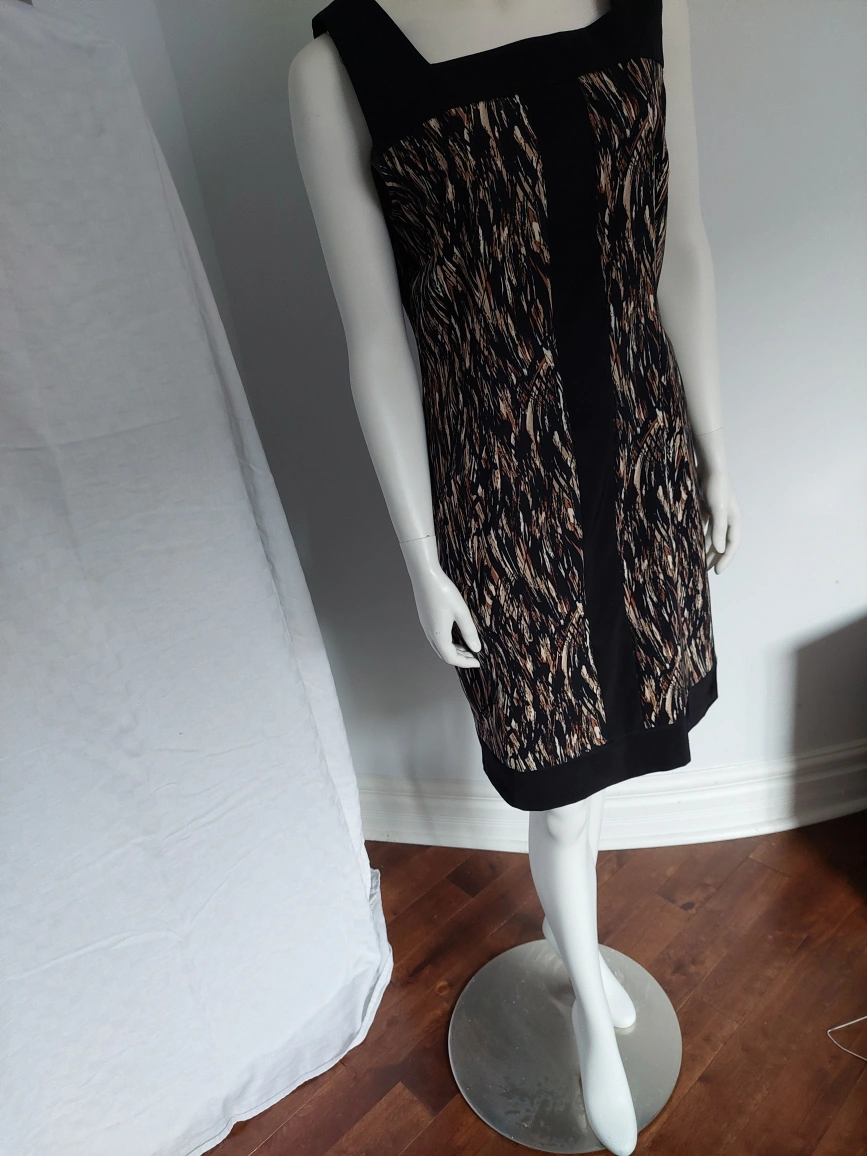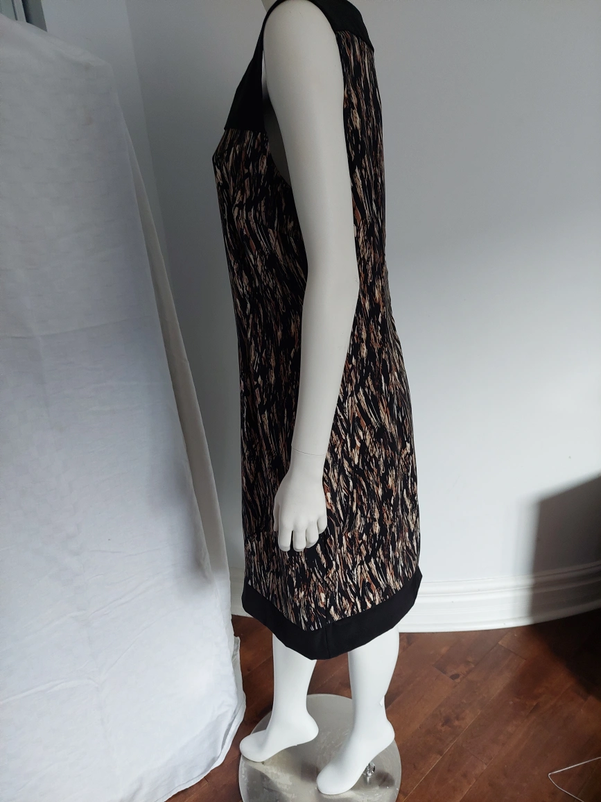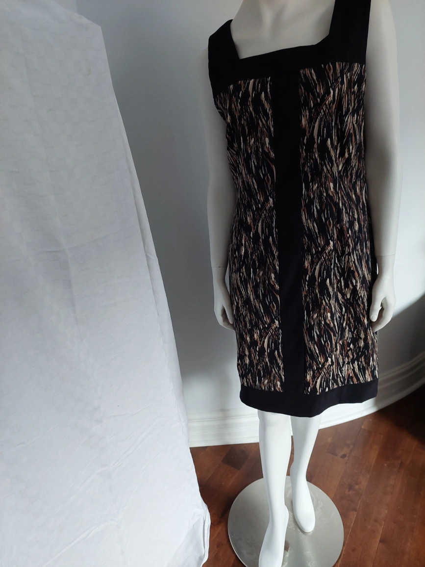 A stylish sleeveless dress featuring a unique black and brown pattern. It's in great condition and perfect for any occasion. Looks great over black ,tan ,or white shirt. Add to bundling for an additional discount. Thank you for visiting my inventory. 🤝☺️
