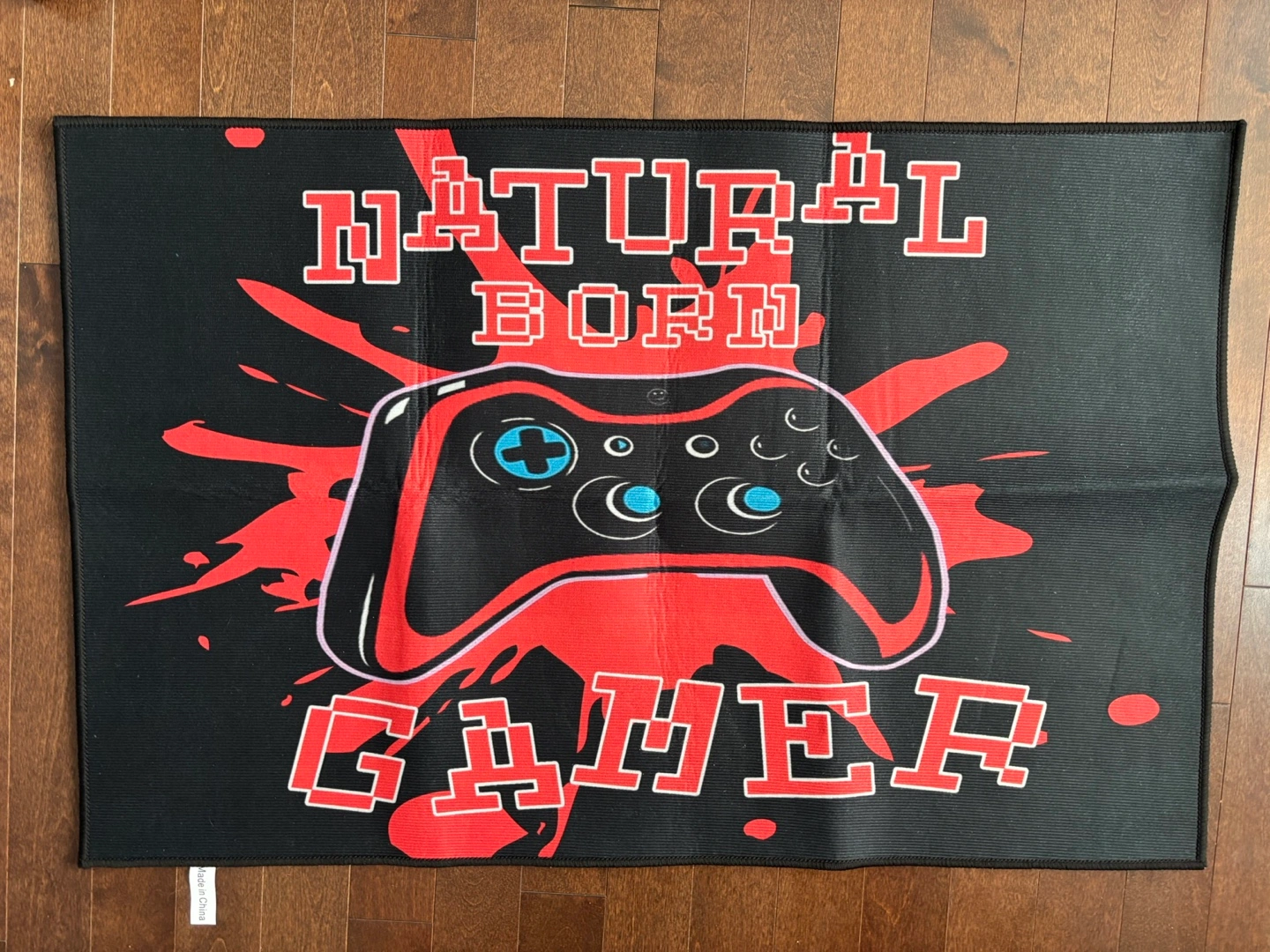 Here's a fun desk mat with a "Natural Born Gamer" design! It's black with red accents and features a cool controller graphic. The mat measures approximately 3 feet by 2 feet.