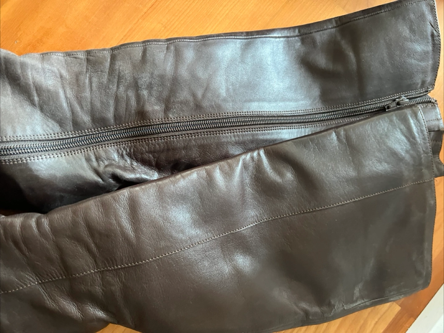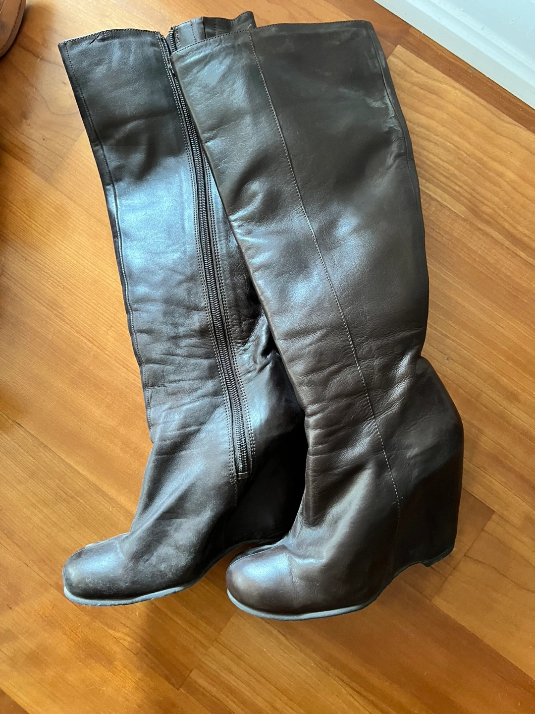 Selling a pair of brown leather knee-high wedge boots. They're a size 7 and feature a zipper closure. Perfect for adding a bit of height and style to your outfit!