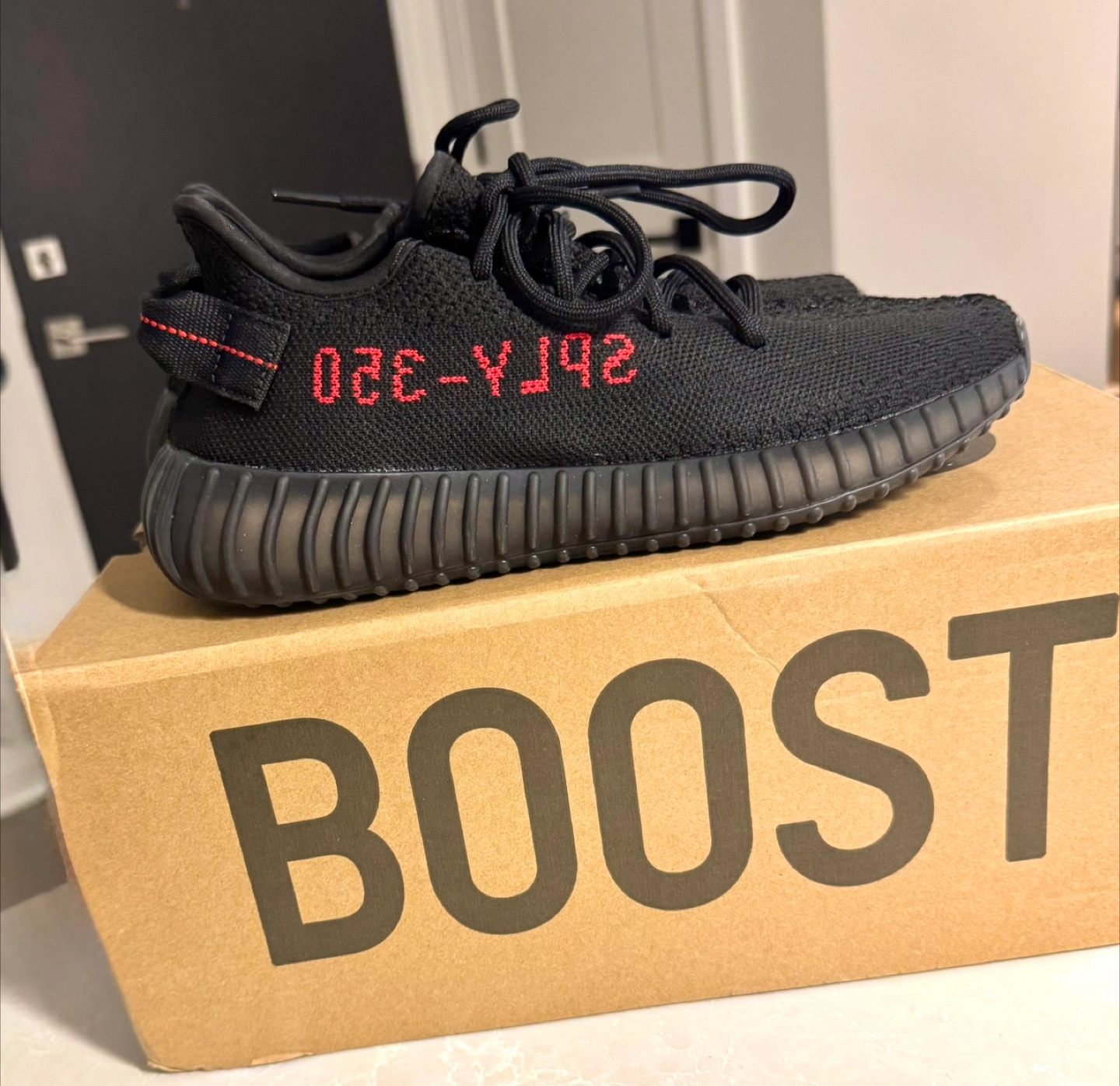 Selling a pair of Adidas Yeezy Boost 350 V2 in Black & Red. (Authentic) These come with the original box, it was slightly damaged during my move but other than that, they're in perfect condition and have only been worn once. They are a size Youth: 6.5 but fit a Women’s: 7-7.5. I’m a W8 and they are slightly too small for me which is why I’m selling them. I unfortunately don’t have the receipt as I got them as a gift but the box is original.