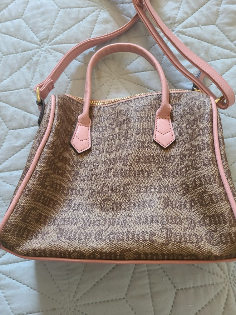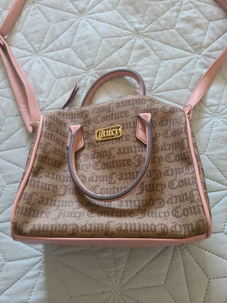 Selling a cute Juicy Couture satchel! It's a brown bag with light pink accents and the Juicy Couture logo printed all over. Perfect for adding a bit of fun to your outfit