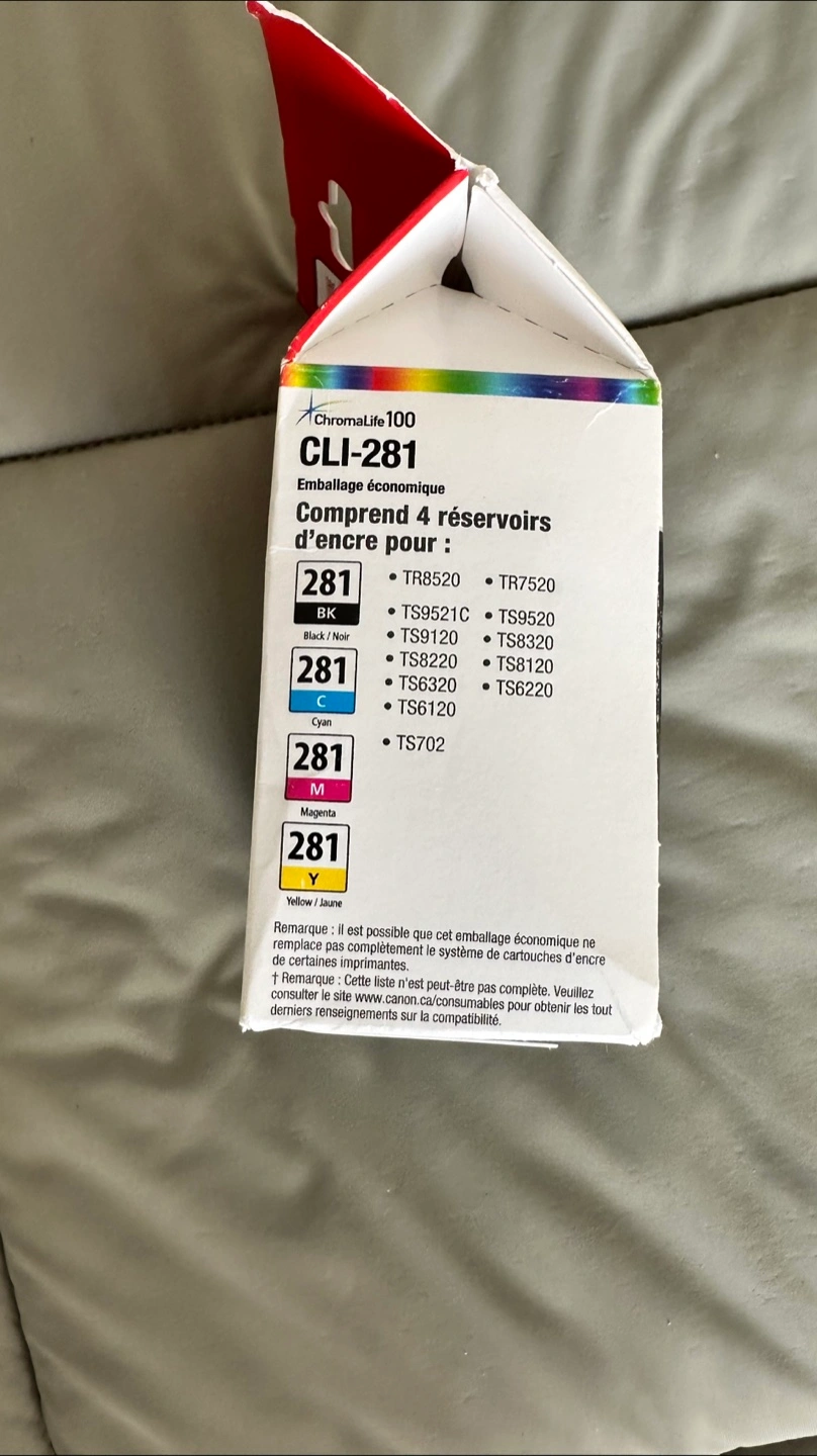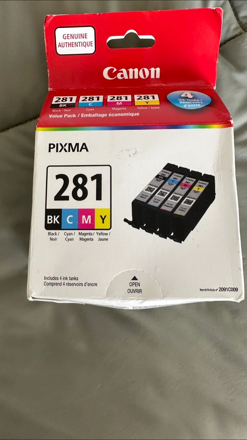 Selling a Canon PIXMA 281 ink cartridge value pack. It includes 4 ink tanks: black, cyan, magenta, and yellow. Compatible with various printer models including TR8520, TS9521C, TS9120, TS8220, TS6120, TS7520, TS9520, TS8120, and TS6220