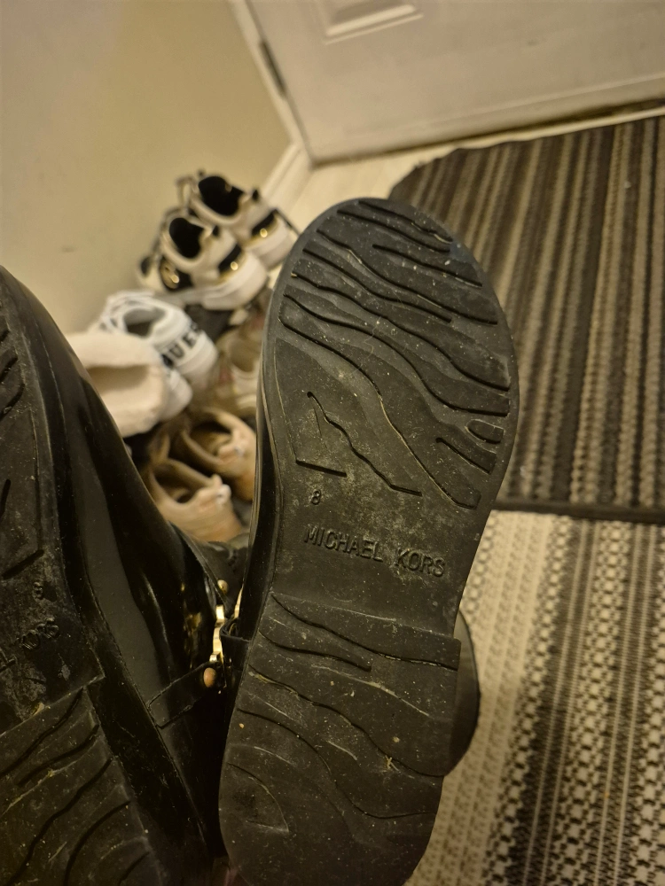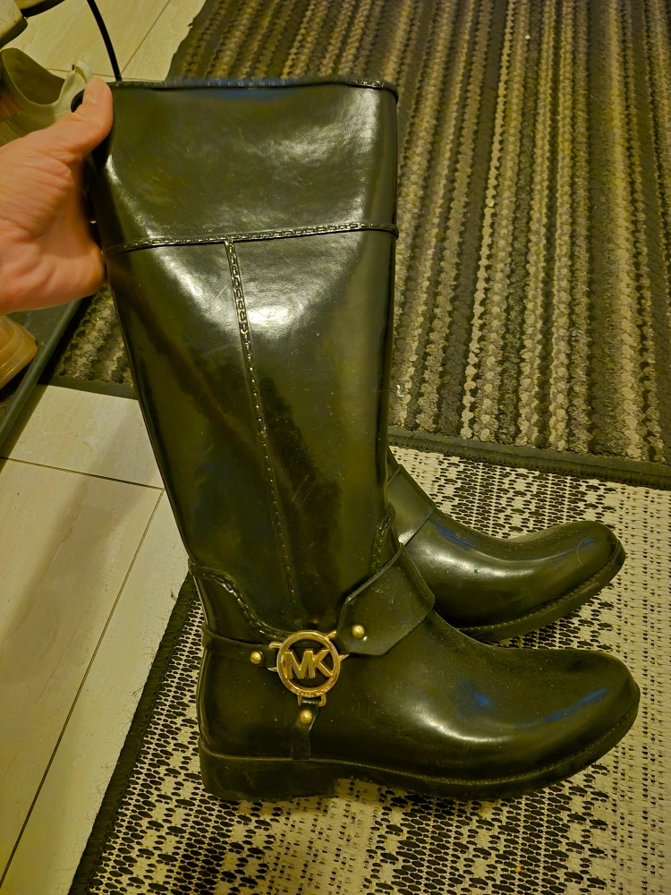 Selling a pair of Michael Kors black rain boots in size 8. They're in good condition and perfect for rainy days! The boots feature the MK logo on the side. Please take a look at the pictures for details