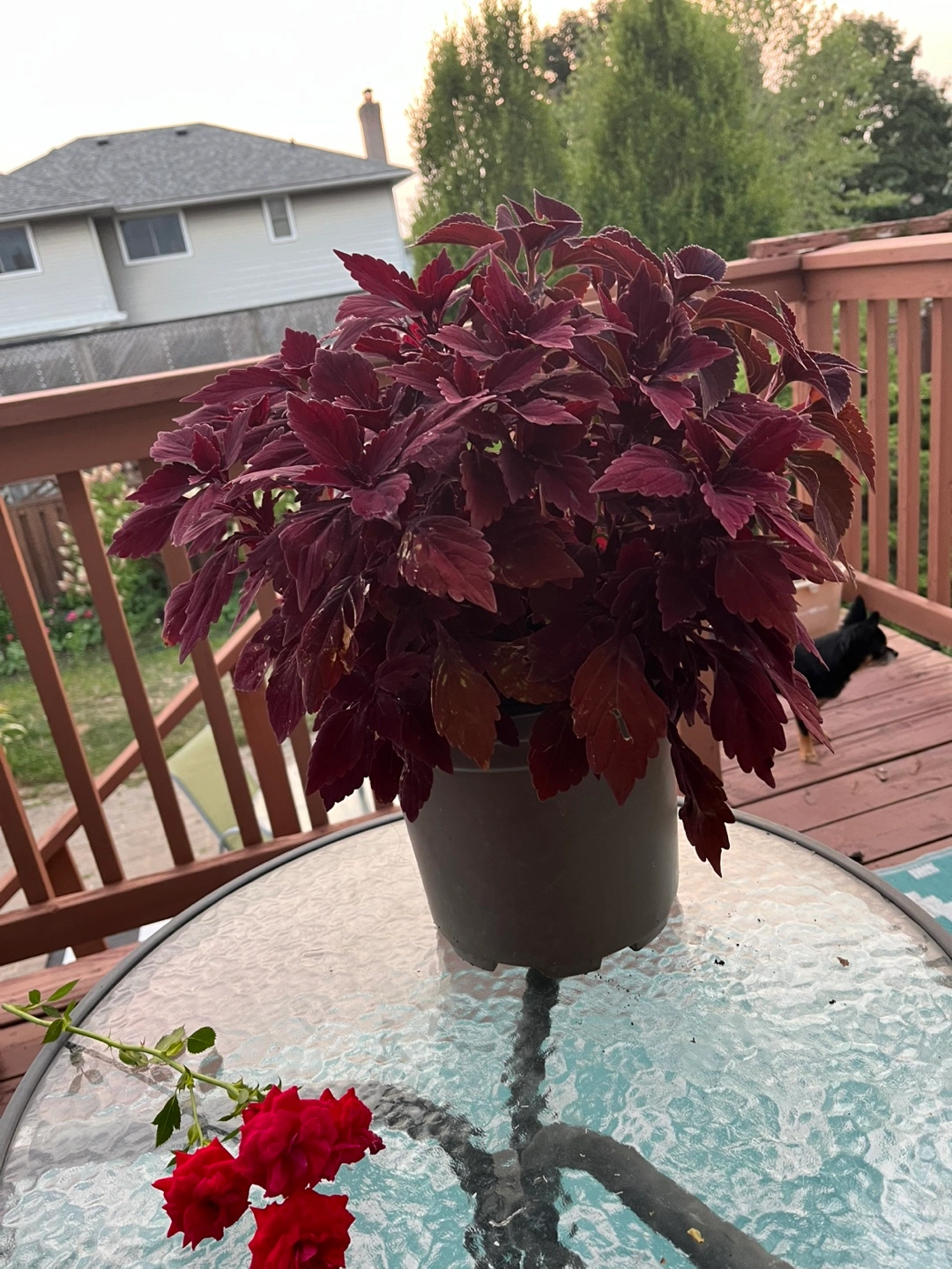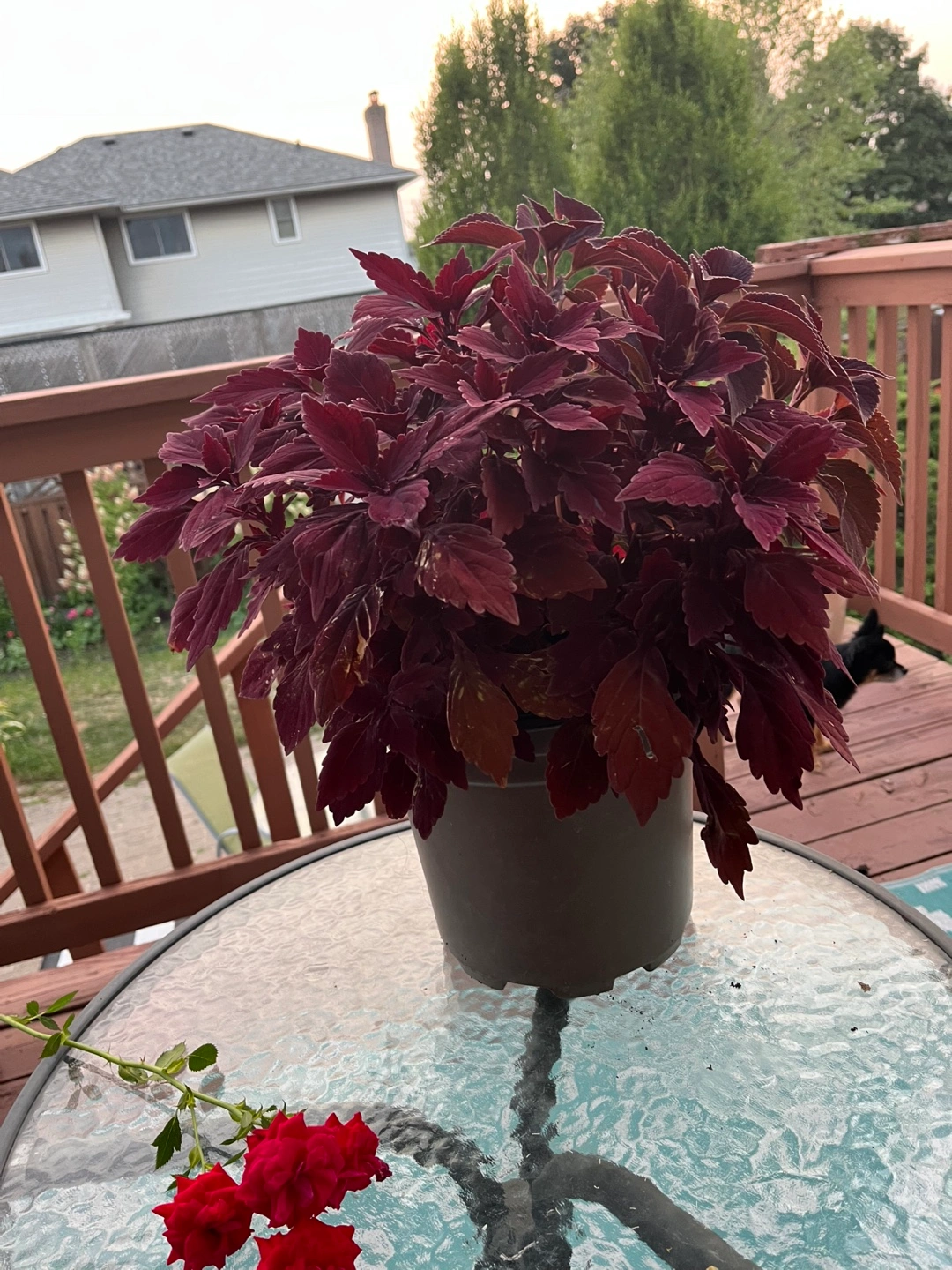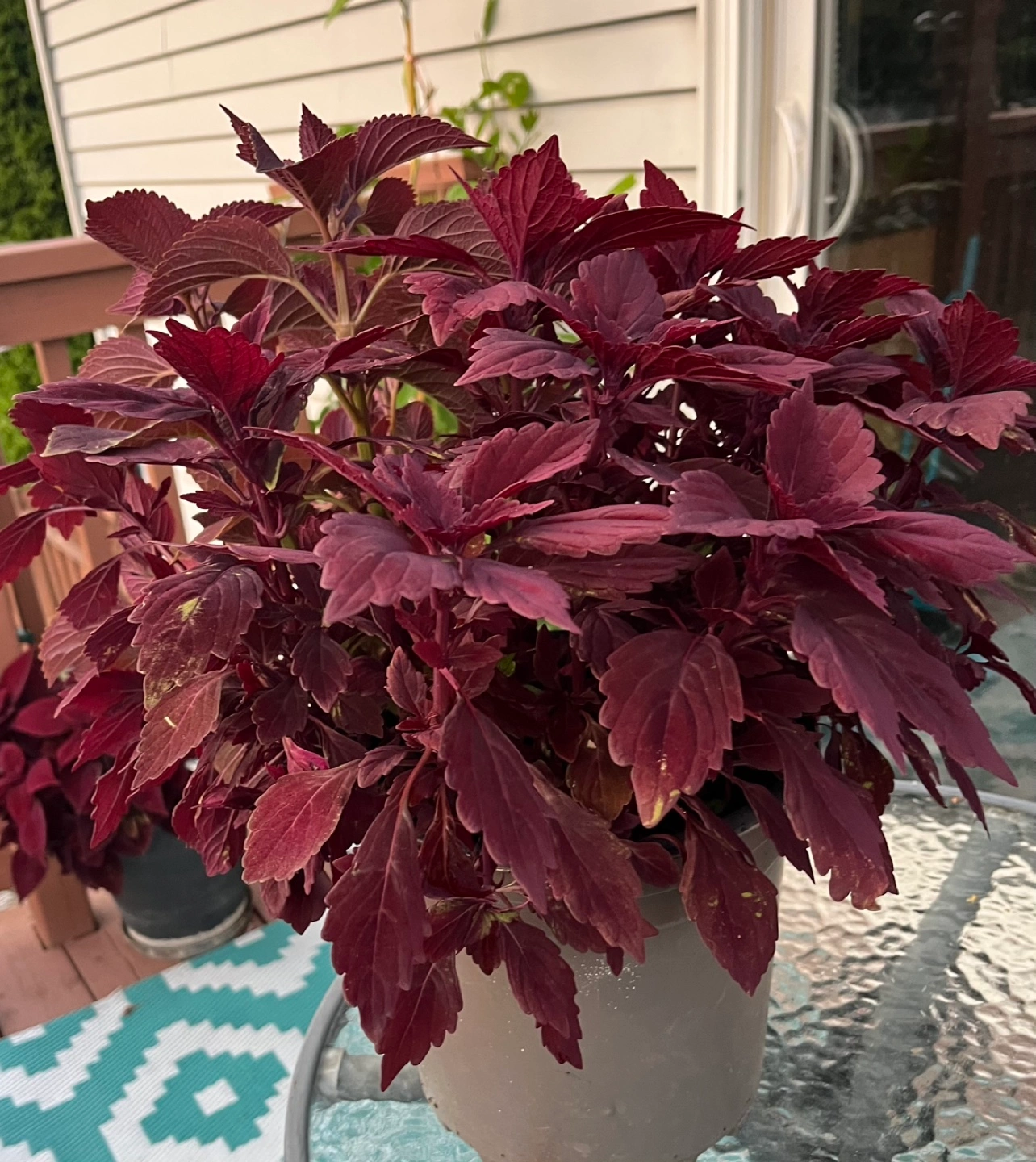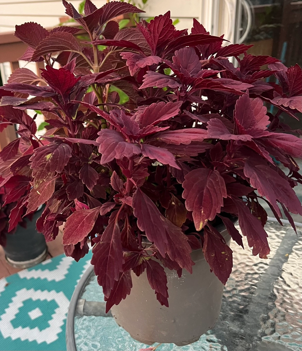 Beautiful burgundy coleus plant! It's in a grey pot and would look great on a patio or balcony