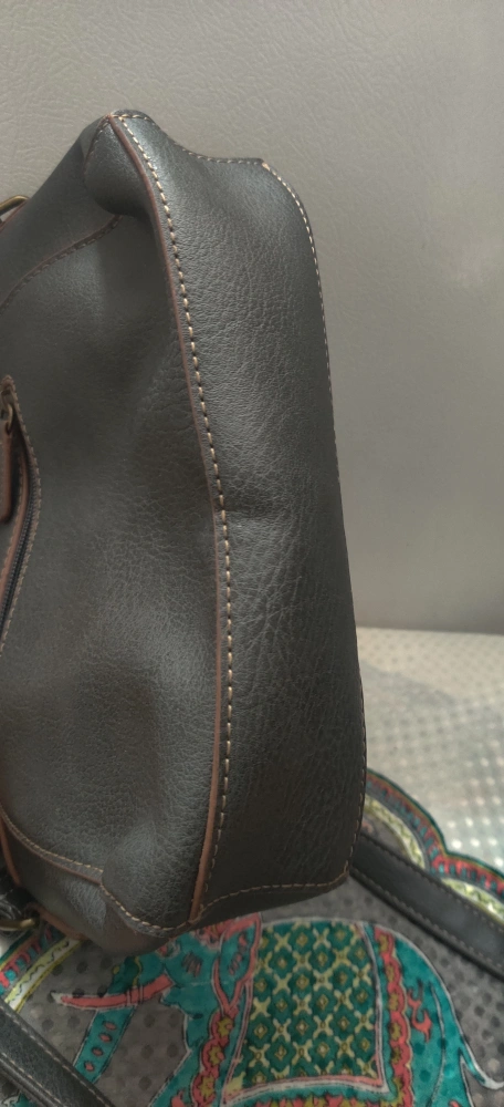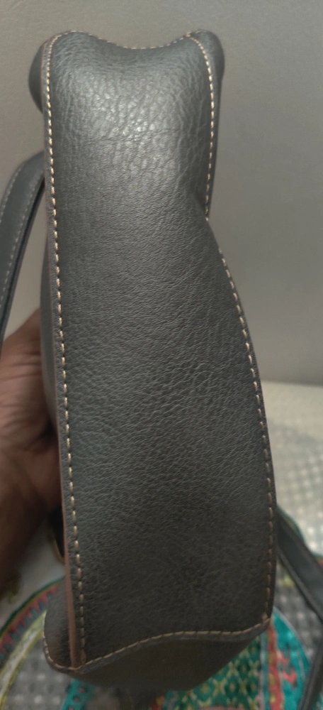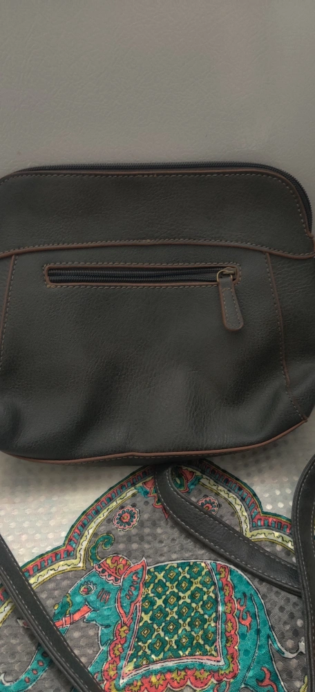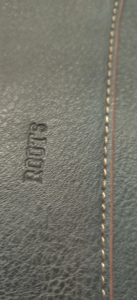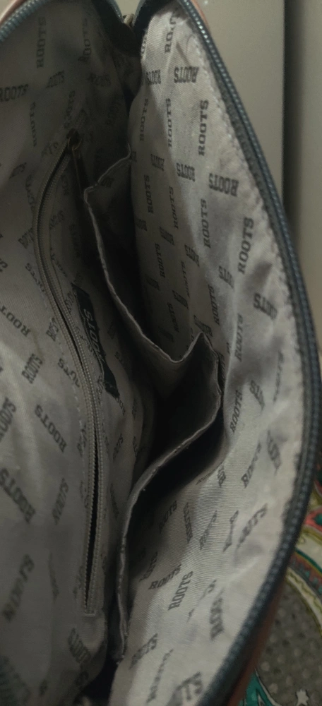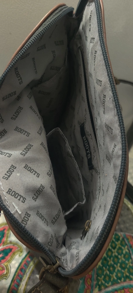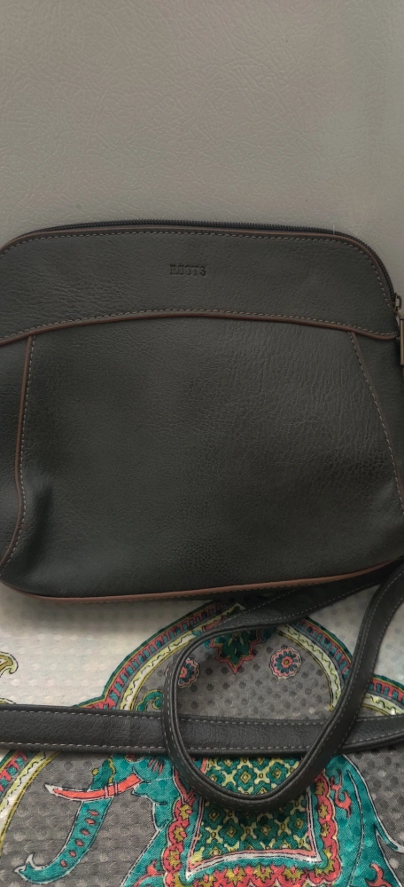 Here's a stylish Roots crossbody bag in dark grey. It's in great condition and perfect for everyday use! The interior lining features the Roots logo. It has a zipper closure and an adjustable strap with 3 large inside pockets