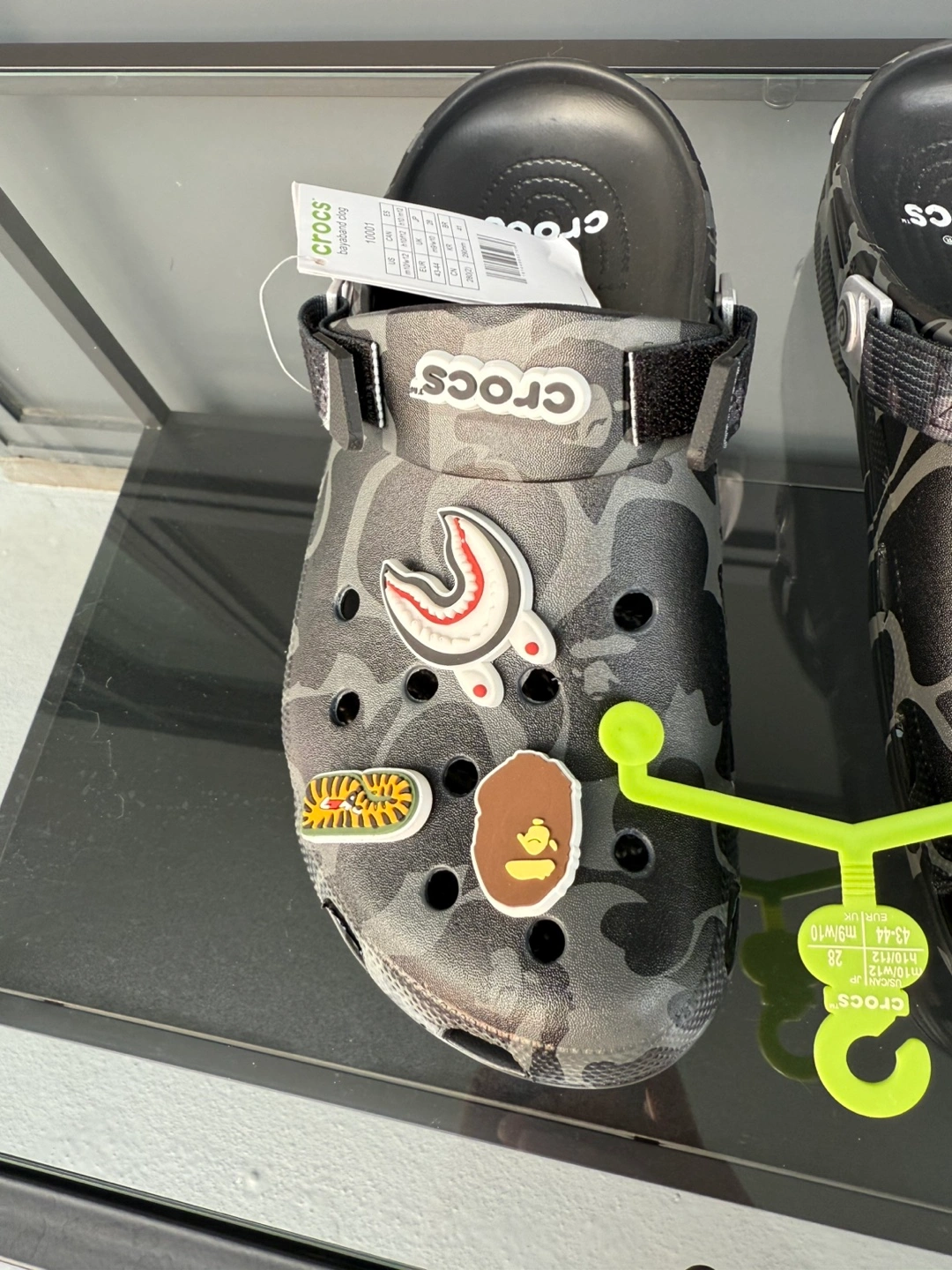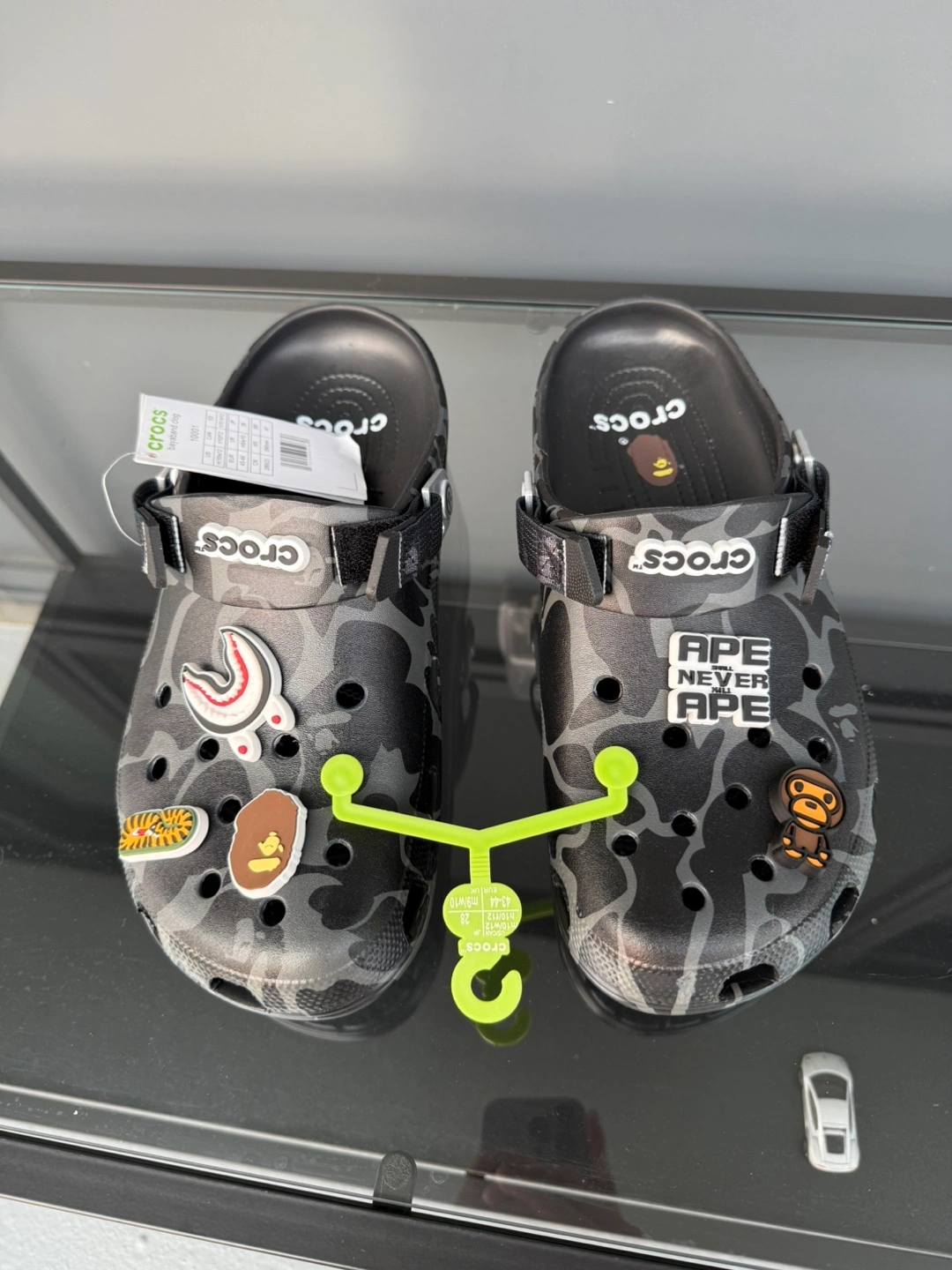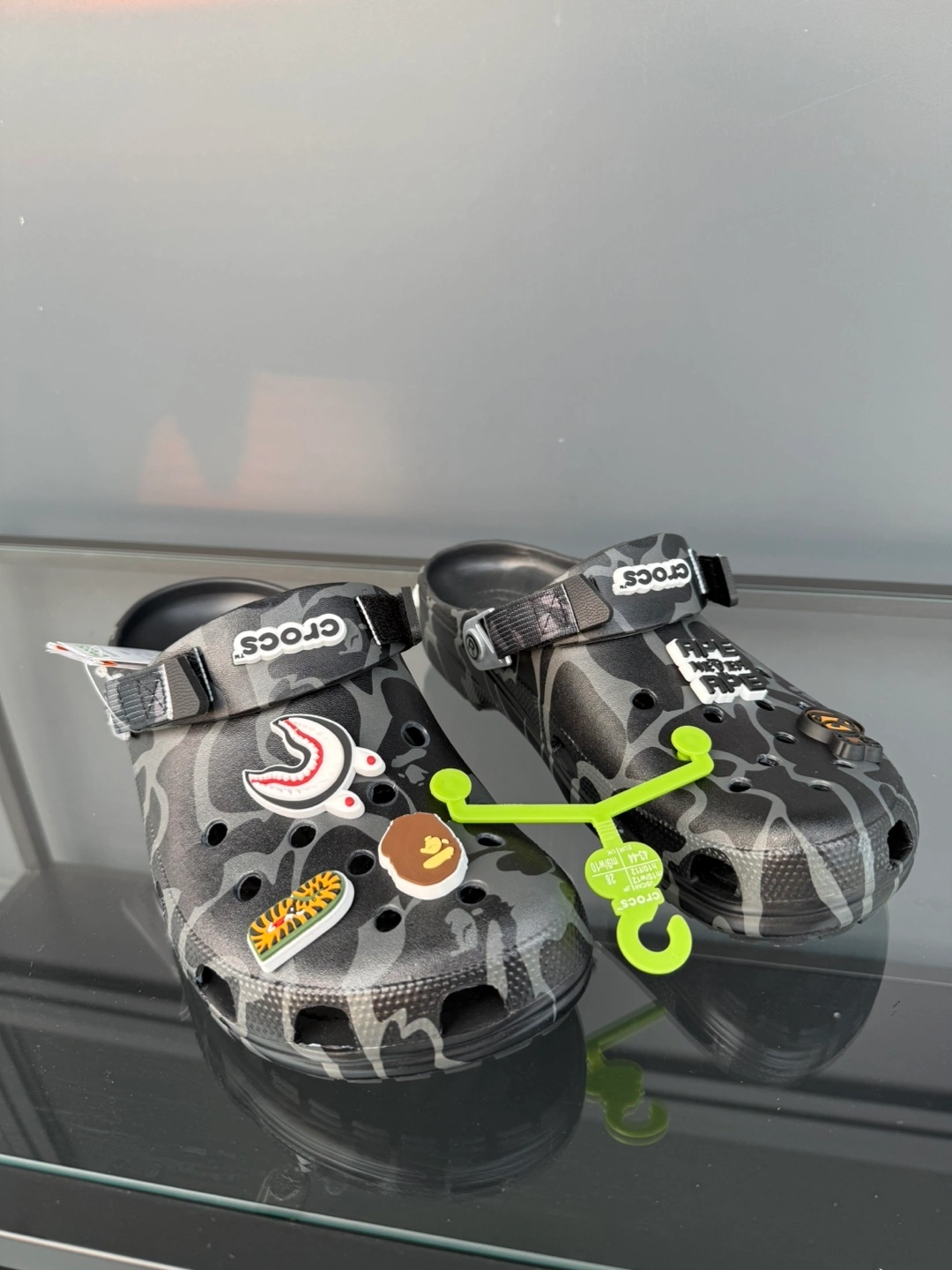 Selling a pair of Crocs in collaboration with BAPE! These feature a cool camo pattern and some fun BAPE-themed Jibbitz. They're in great condition and ready for a new home. Size US 10