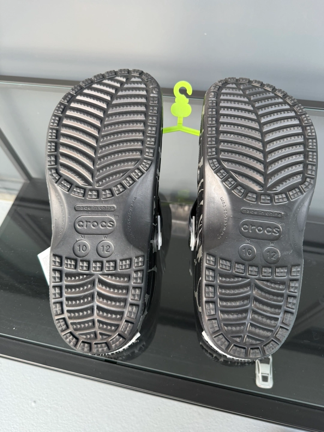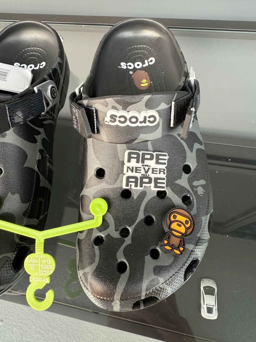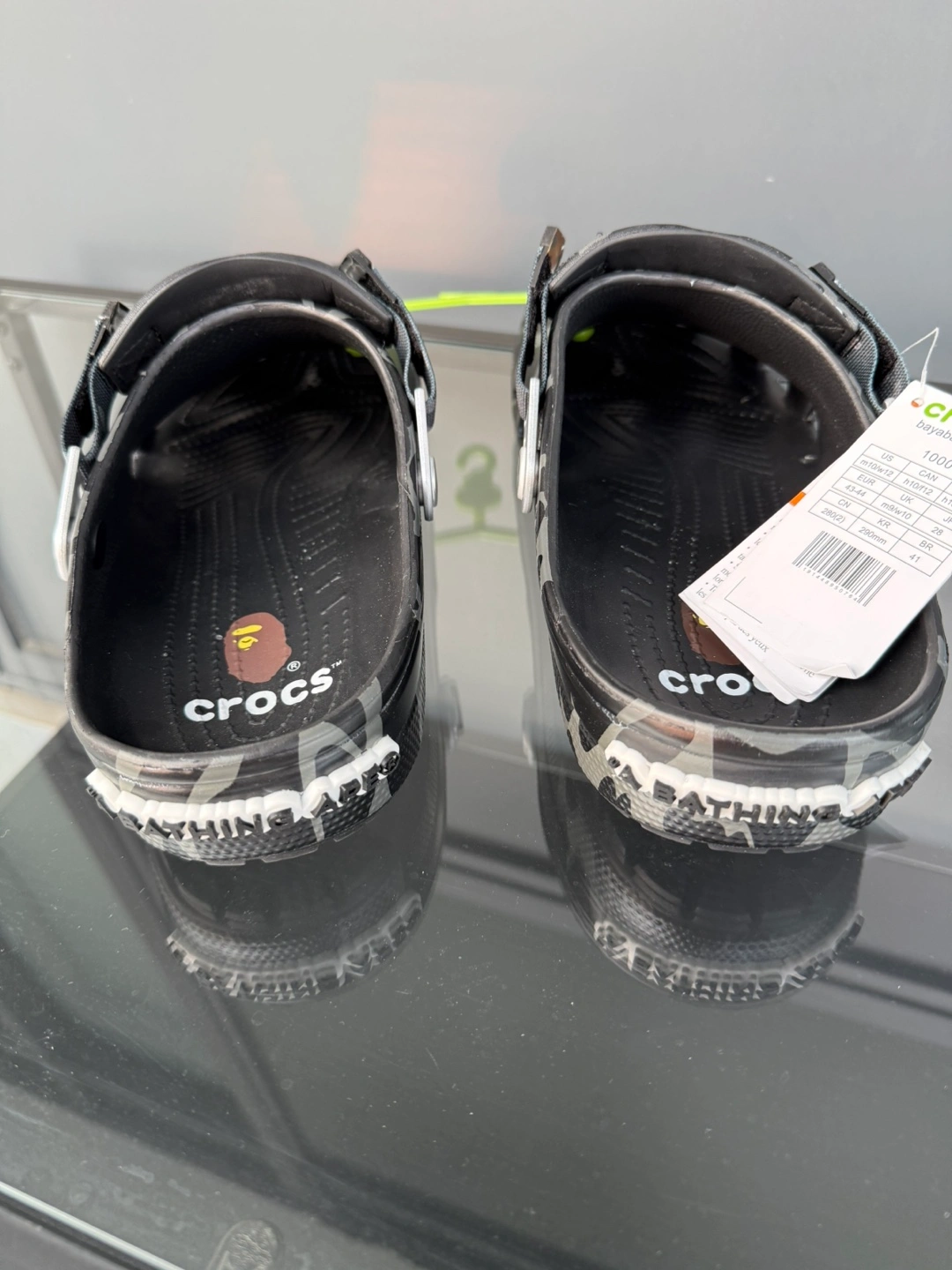 Selling a pair of Crocs in collaboration with BAPE! These feature a cool camo pattern and some fun BAPE-themed Jibbitz. They're in great condition and ready for a new home. Size US 10