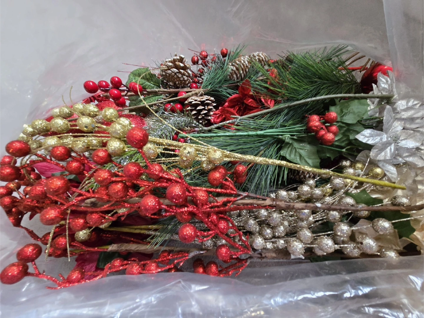 Selling a collection of Christmas decorations. Includes tinsel and assorted decorative floral and berry sprigs. Great for adding some holiday cheer to your home! Pick up in Orléans
