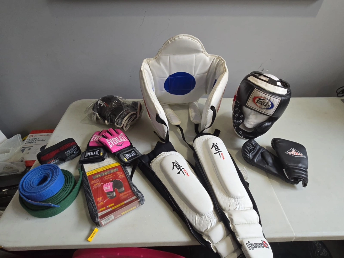 Selling a set of mixed martial arts gear! Includes: - Everlast gloves (pink and black) - Fairtex head gear (black and white) - Ikusa shin guards (white) - Other assorted gloves and wraps Pick up in Orléans