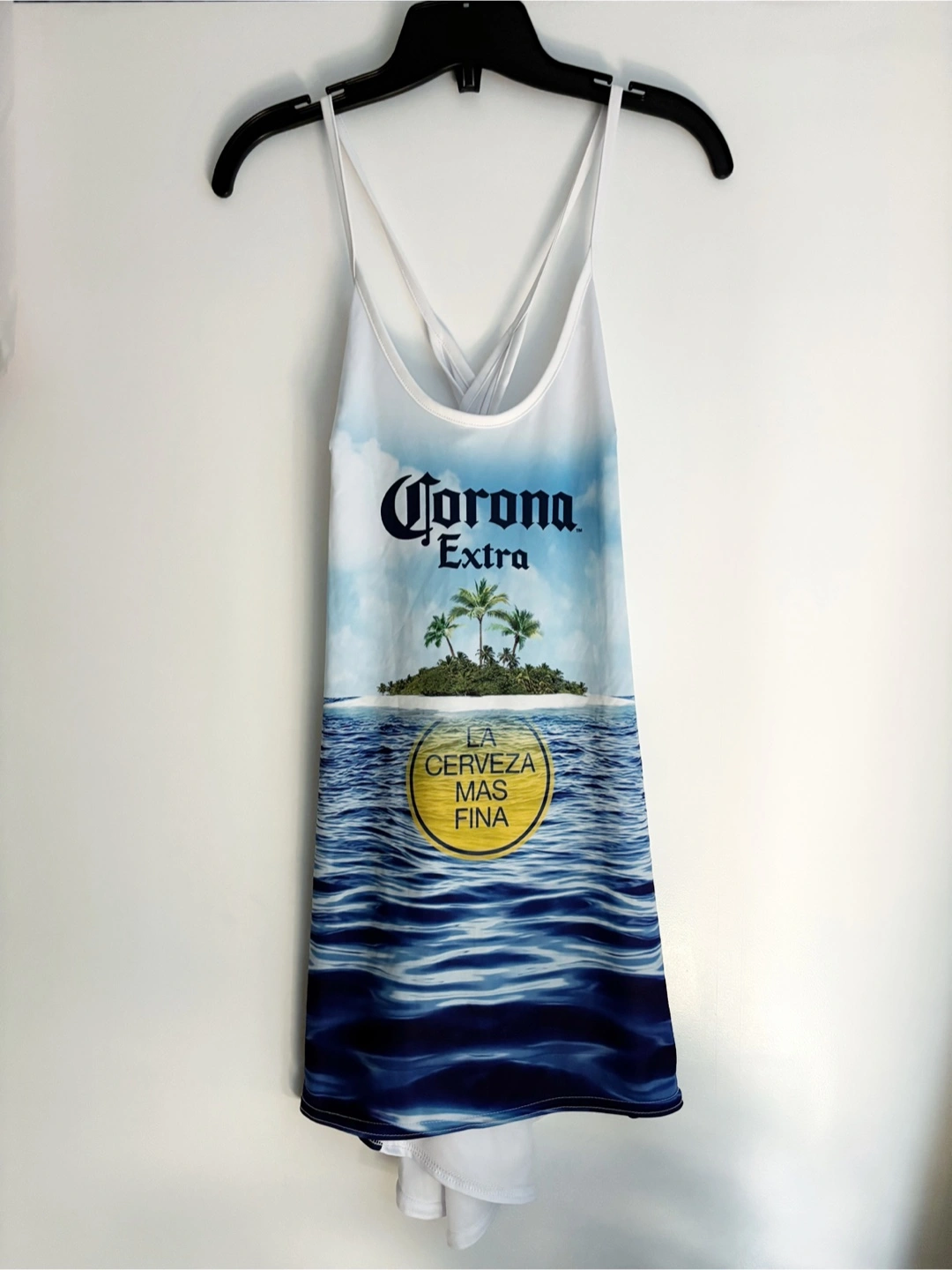 A Corona Extra themed - a summer dress but can be a long tank top! Keyhole opening in the back. Perfect for a beach day, a vacation, a themed party, or a casual day out.