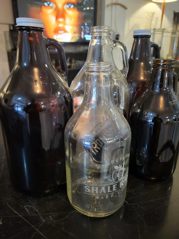 Selling a collection of 5 glass growlers in various sizes and styles! Perfect for homebrewing or storing your favourite beverages. There are clear and amber-coloured ones available. Check out the photos for details!
