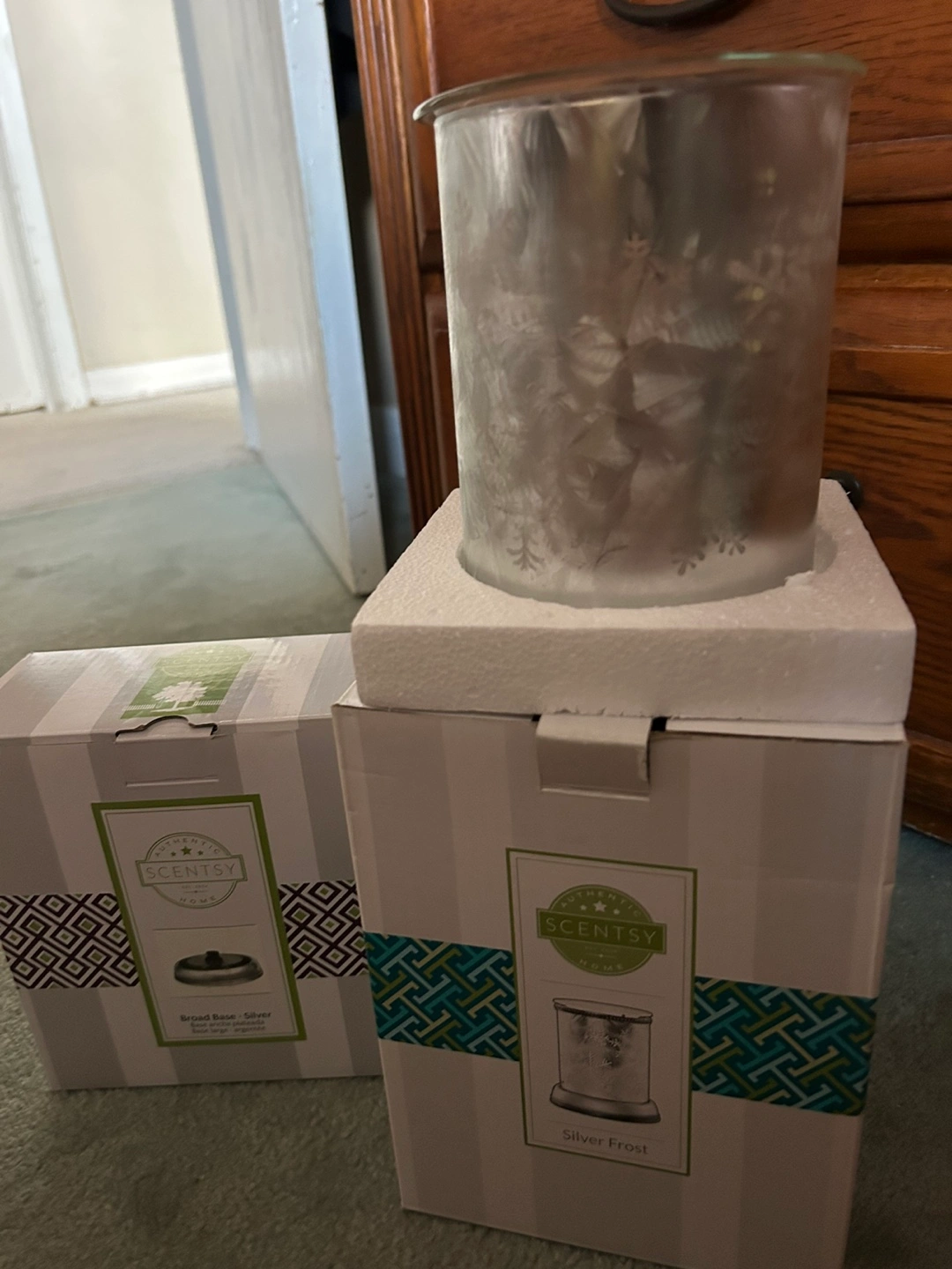 Selling a practically brand new Scentsy Silver Frost Warmer! It's still in its original box. This warmer adds a touch of elegance to any room with its frosted design. Perfect for creating a cozy atmosphere in your home! The box is included. Pick up only please.