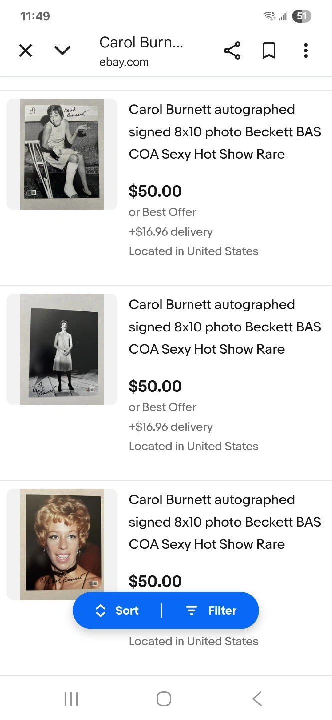 Carol Burnett authentic autograph. On glossy b&w 4"x6" glossy photo. Does have smudge from being in envelope. Obtained via mail from her Beverly Hills office. Located King St W and Dufferin St. See my other listings.