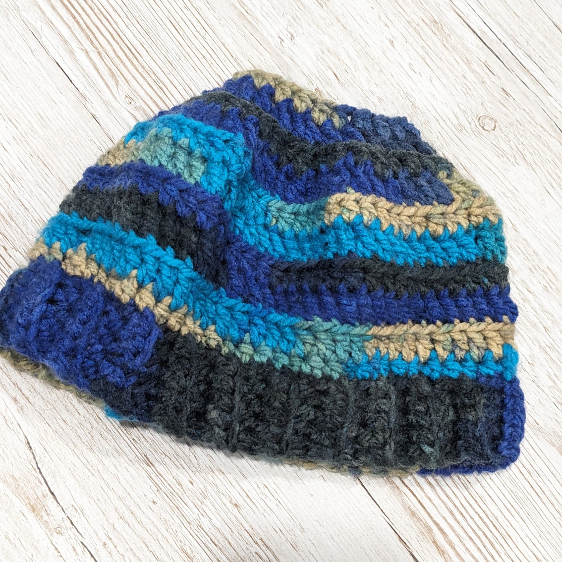 A handmade crochet beanie It's called "messy Bun beanie" as you can wear this with your hair up. Gifted but never used. The beanie features a unique striped pattern and a comfortable, stretchy fit, making it a stylish and practical addition to your winter wardrobe