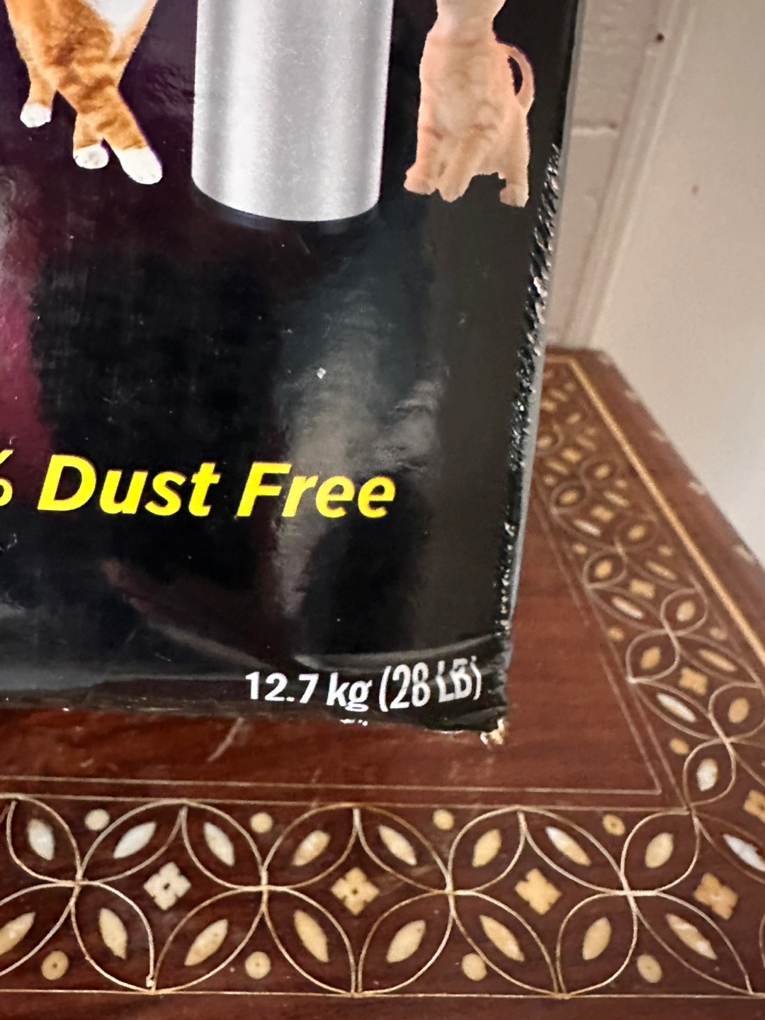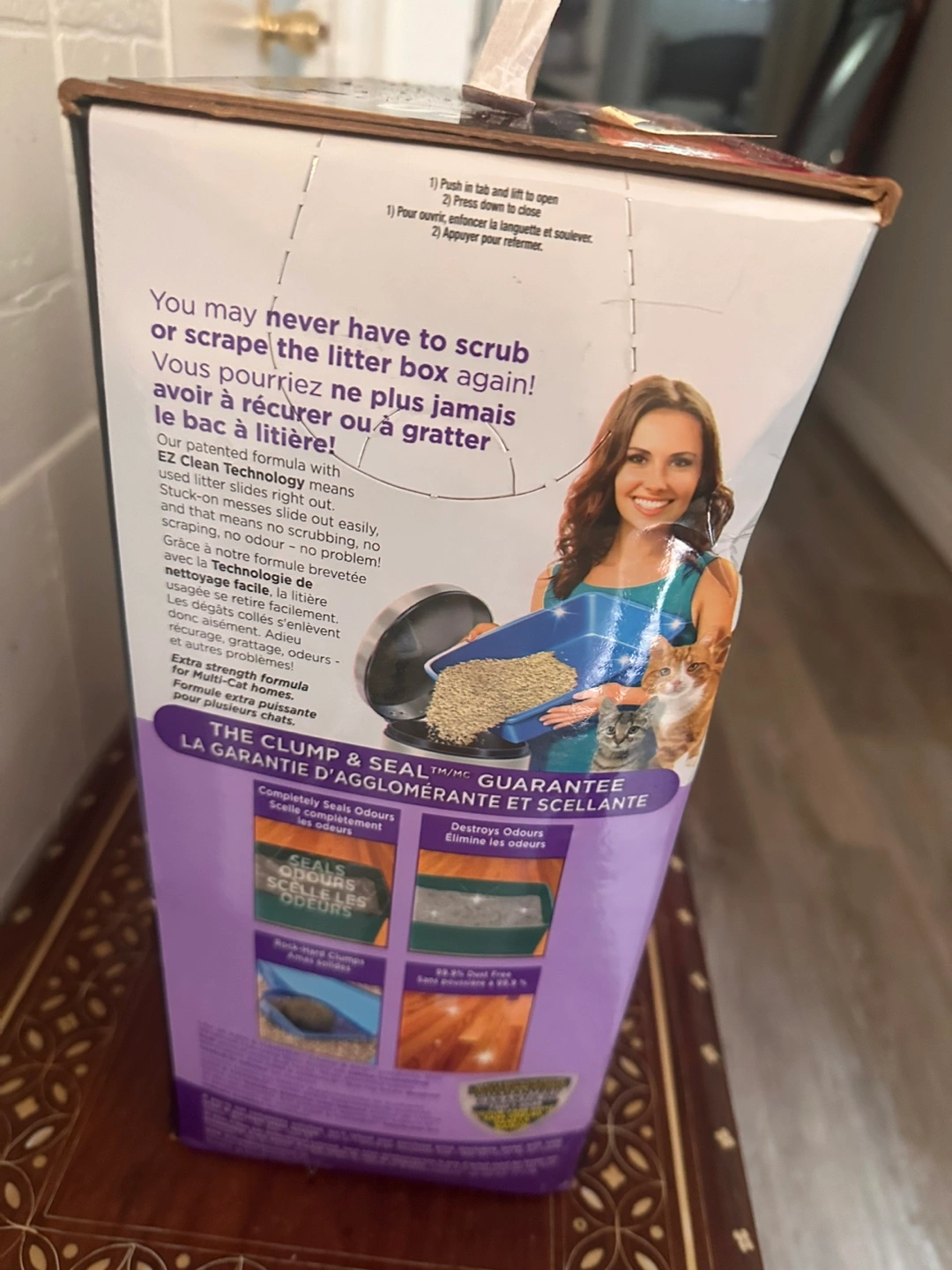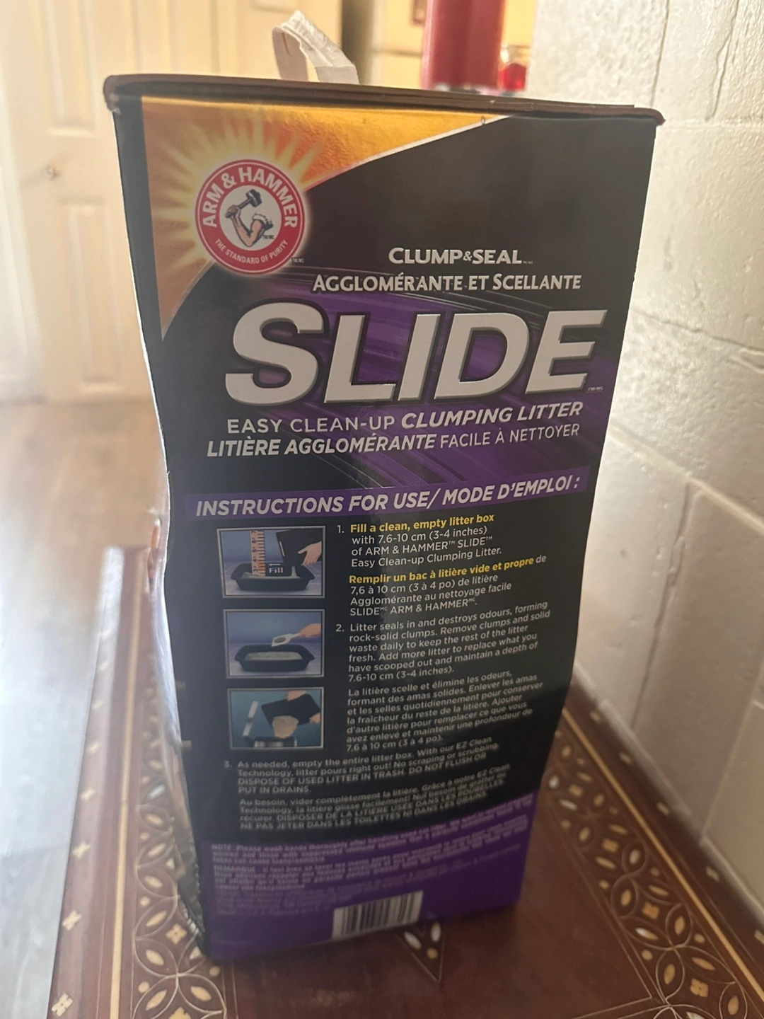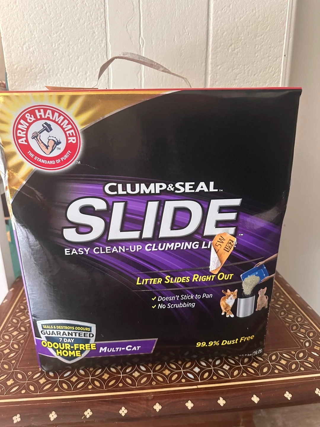 Arm & Hammer Clump & Seal Slide Easy Clean-Up Clumping Litter. This litter is multi-cat and 99.9% dust free. The box is 12.7 kg (28 lb). It seals and destroys odours, guaranteed for 7 days