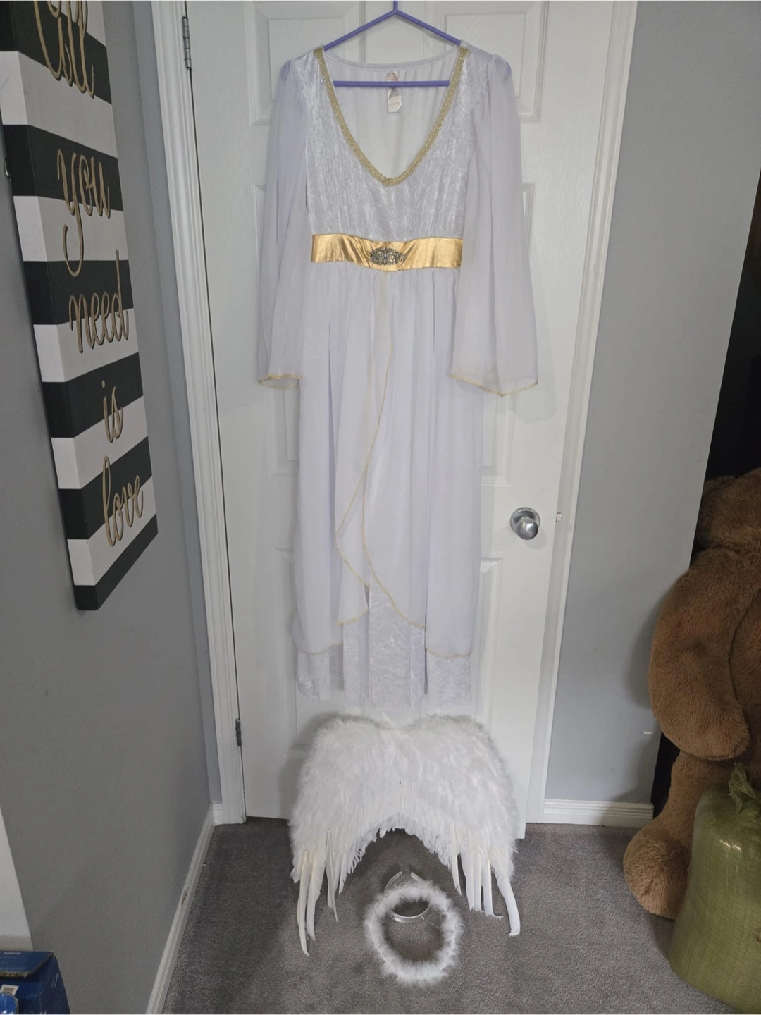Selling an angel costume, complete with the dress, wings, and halo! It's a beautiful white colour with gold accents. Perfect for Halloween or any dress-up occasion. Pick up in Orléans