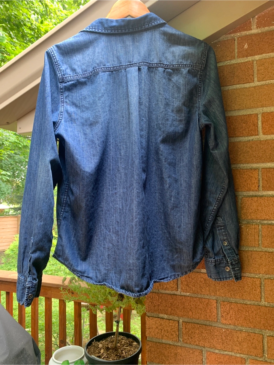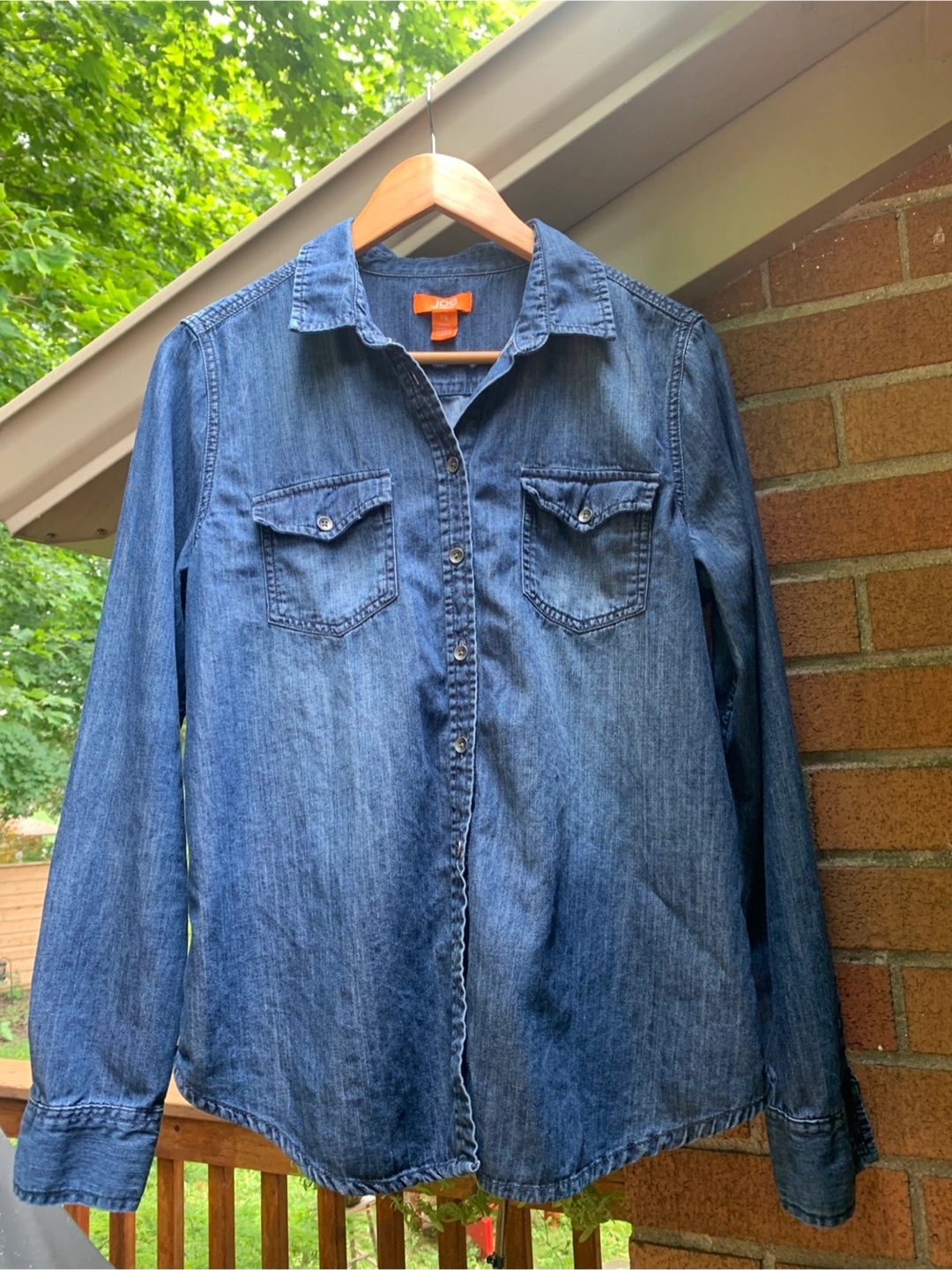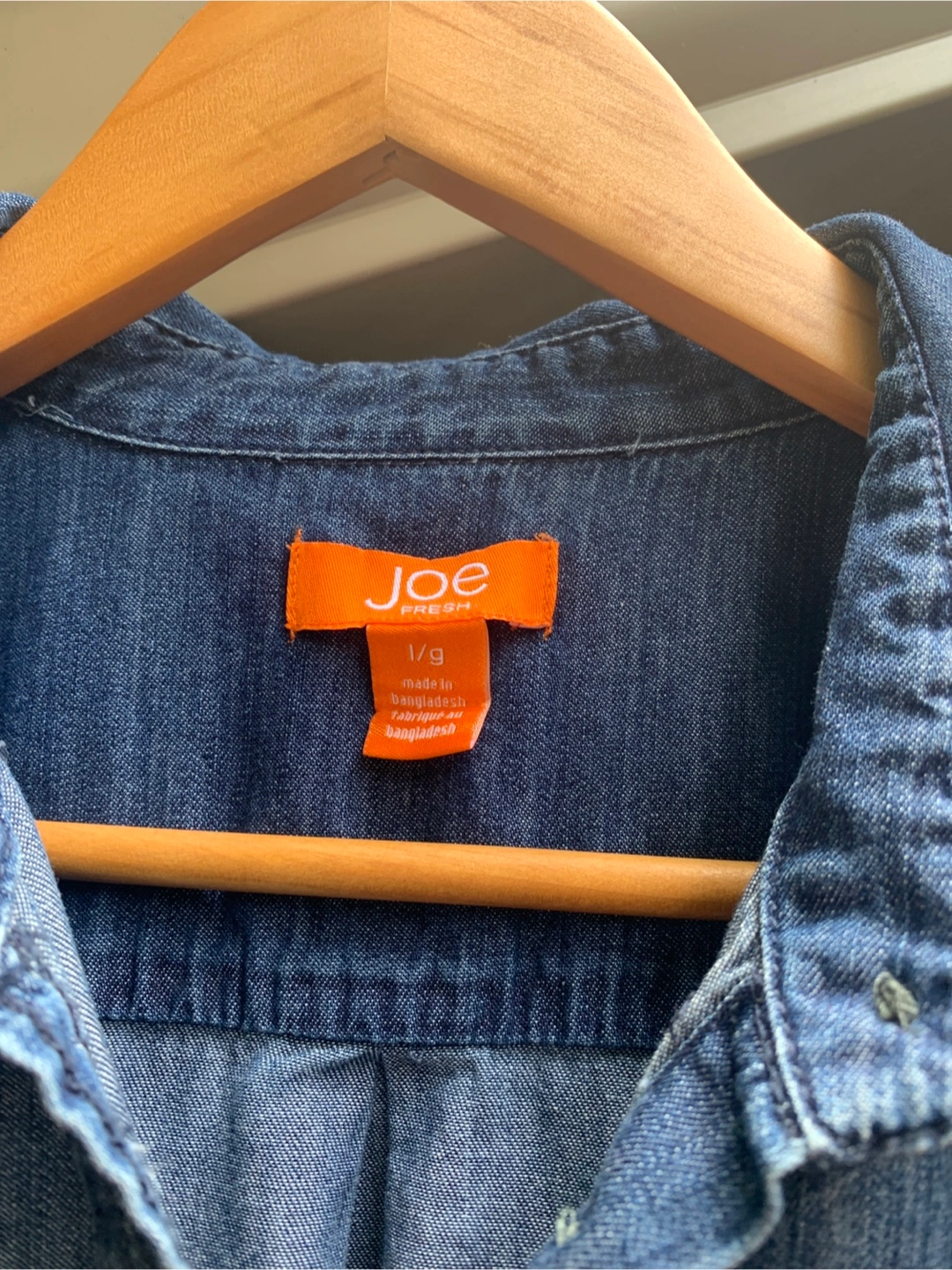 Here's a Joe Fresh super soft and comfy denim shirt in size large! It has two front pockets, button front and two buttons on the wrists so you can roll up the sleeves for a more relaxed look. It's made of 100% cotton, for all those natural fabric girlies. Freshly washed and ready to wear. Perfect for a casual look! Cash only please.