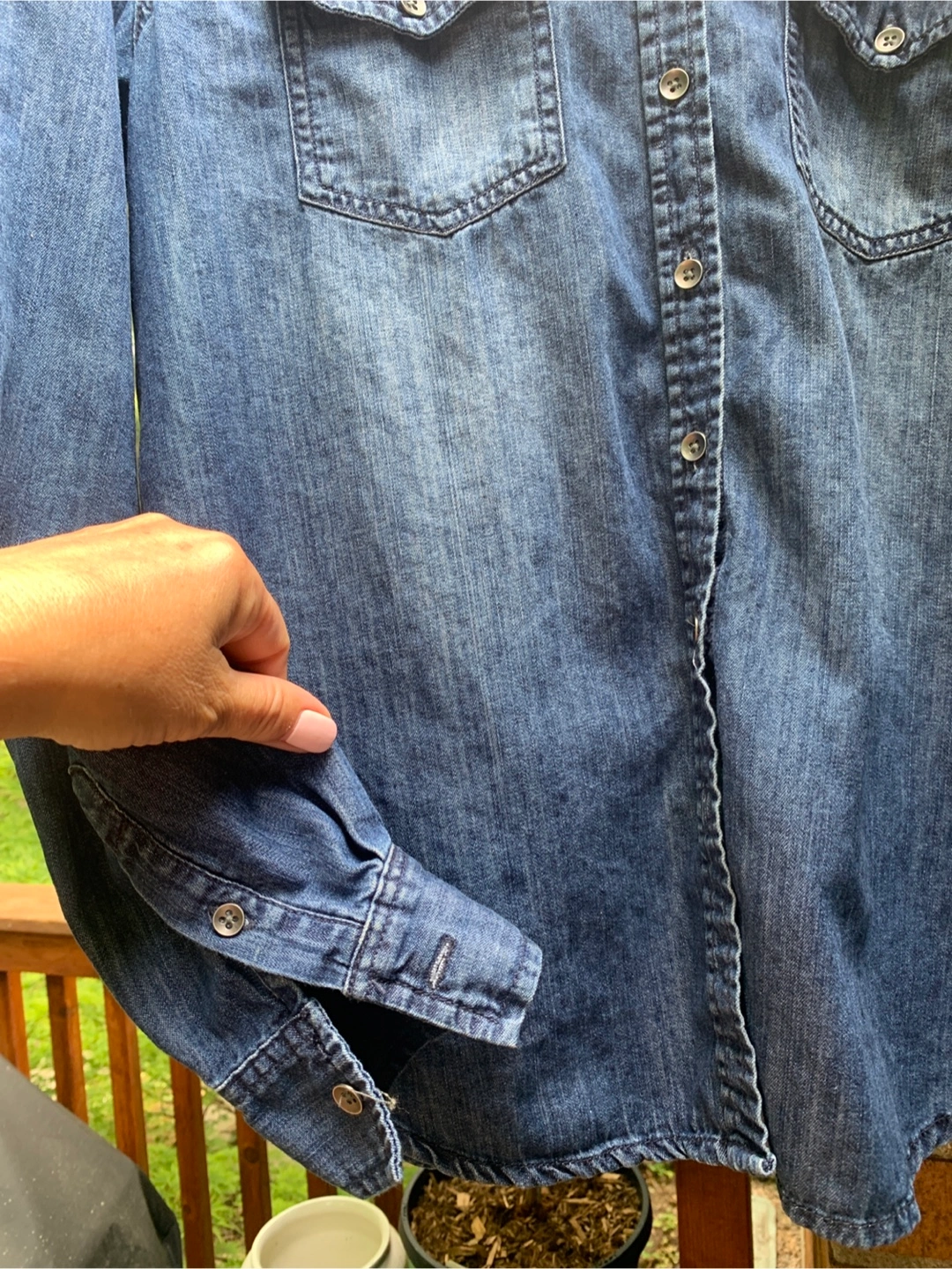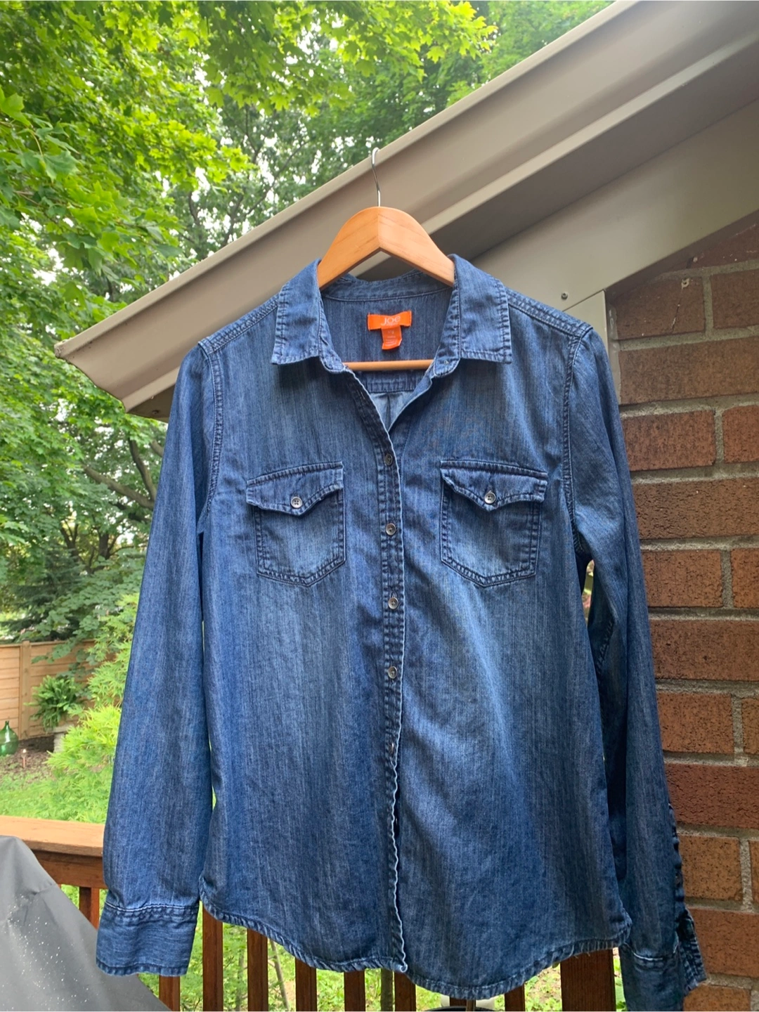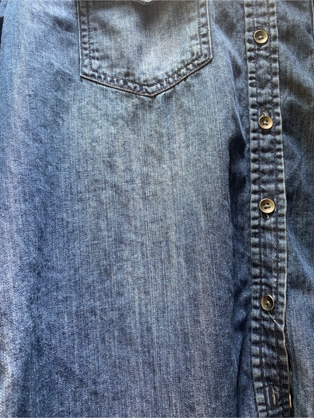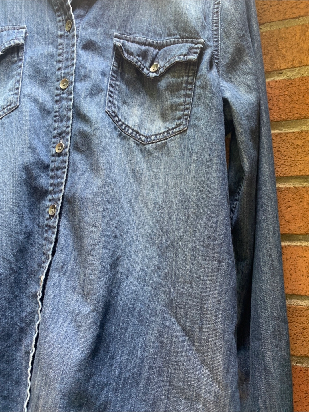 Here's a Joe Fresh super soft and comfy denim shirt in size large! It has two front pockets, button front and two buttons on the wrists so you can roll up the sleeves for a more relaxed look. It's made of 100% cotton, for all those natural fabric girlies. Freshly washed and ready to wear. Perfect for a casual look! Cash only please.
