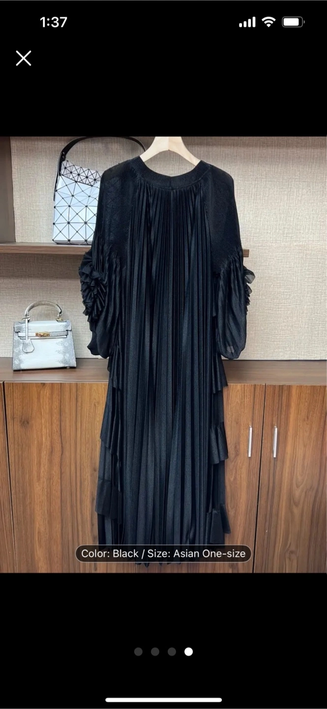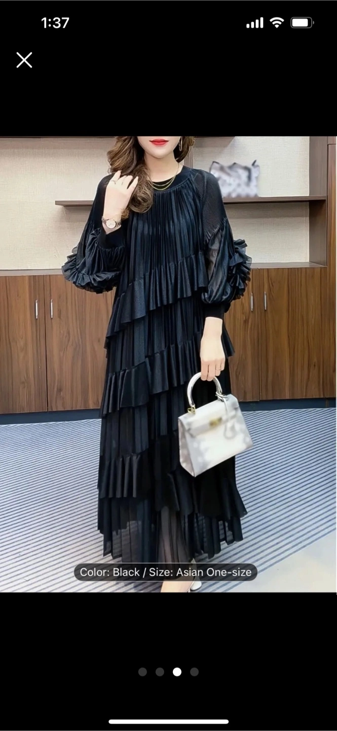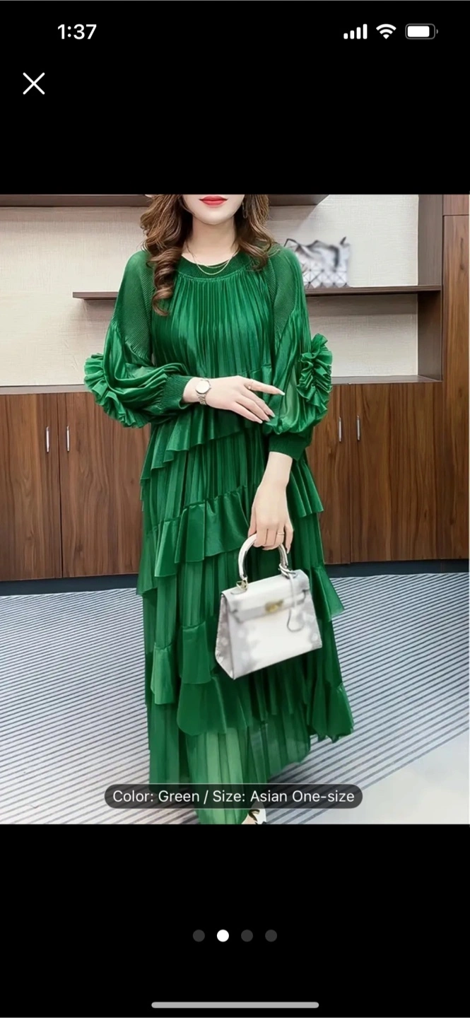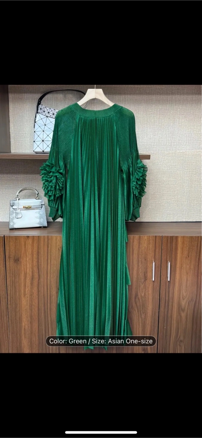 Check out this stylish pleated dress with ruffle sleeves! It's a one-size-fits-all and comes in a sleek black & green color. Perfect for adding a touch of elegance to your wardrobe