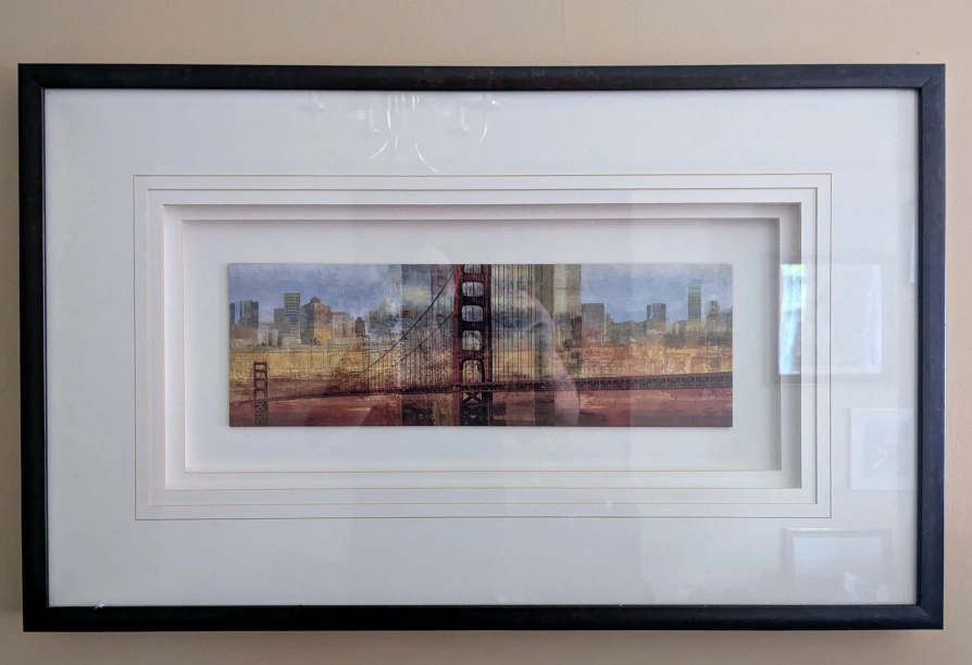 Here's a framed print featuring the Golden Gate Bridge and a cityscape. The frame is black with a white matte border. It's in great shape and ready to hang in your home!