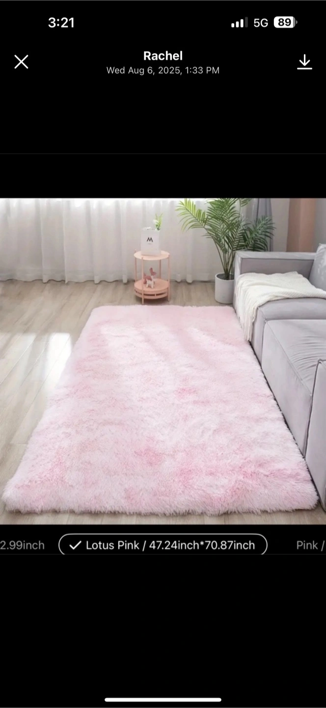 Selling a soft and fluffy area rug in a beautiful lotus pink colour! It's a rectangle shape and measures approximately 47.24 inches by 70.87 inches, perfect for adding a cozy touch to any room