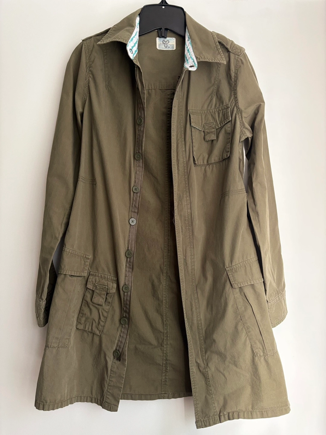 Selling a TNA jacket in olive/military green. It's a size XS and good for layering. It is in a military style and is quite thin. Lots of pockets. There are both zippers and buttons. Perfect for upcoming early fall weather.