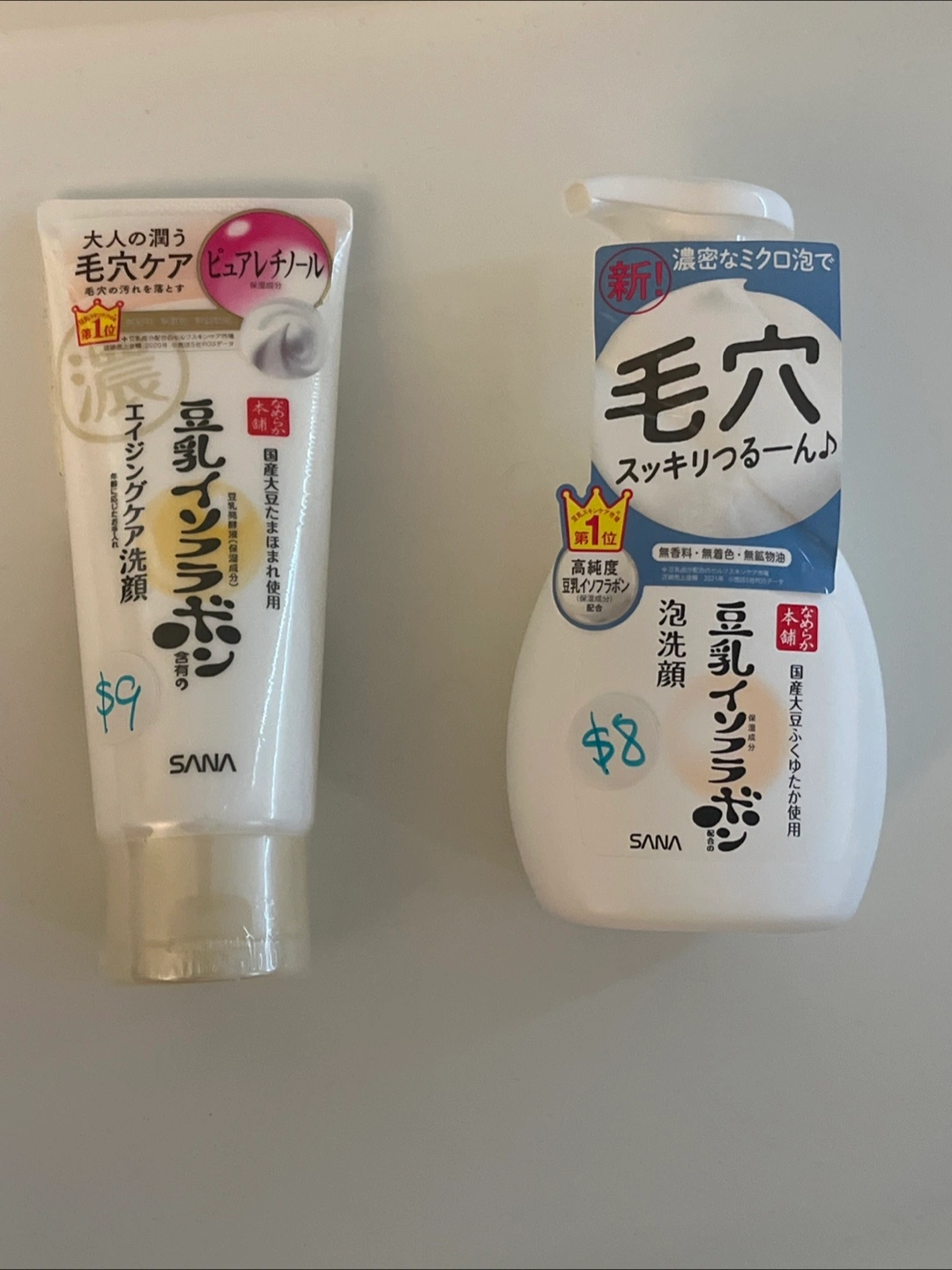 Selling a set of SANA Soy Milk Isoflavone face washes. One is the Aging Care version, and the other is a foaming face wash. They're both designed to help with pores and use soy milk isoflavones. The Aging Care wash is $9, and the foaming wash is $8.