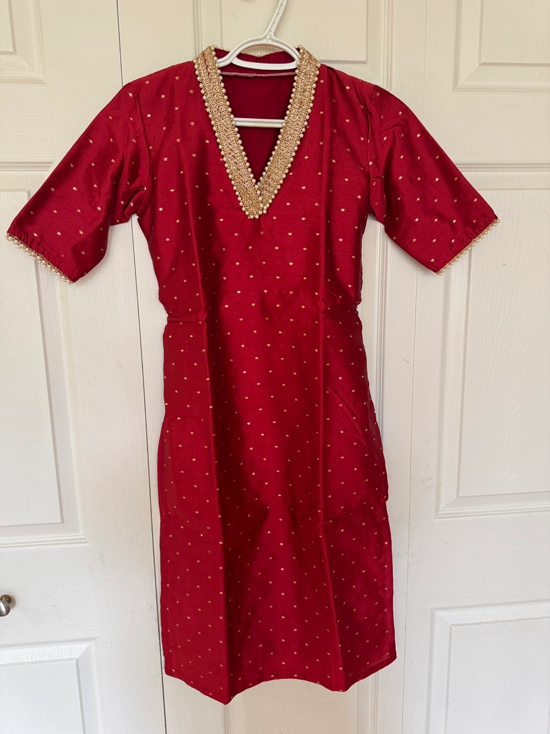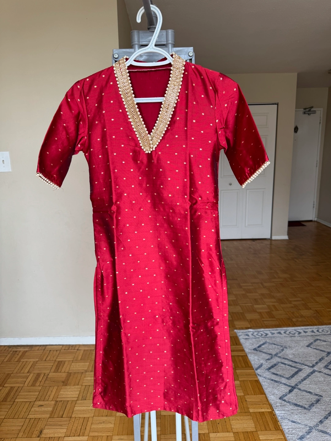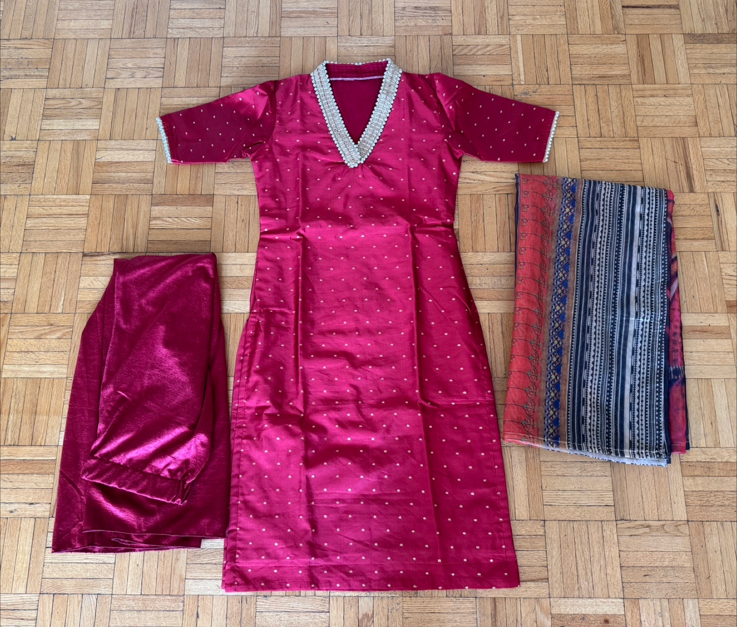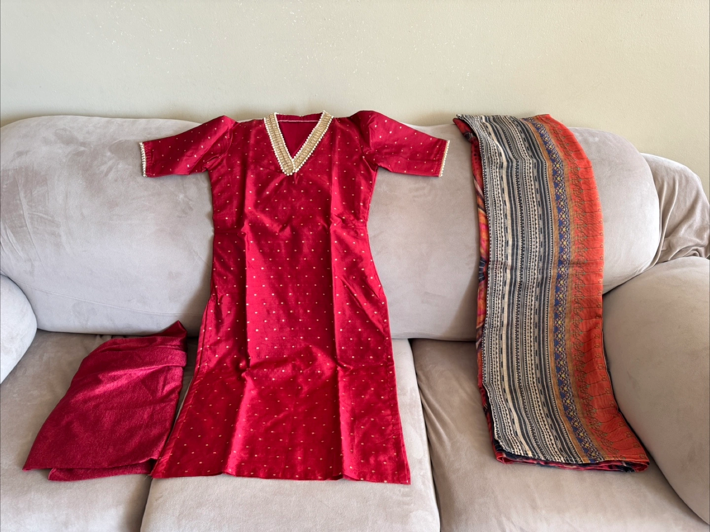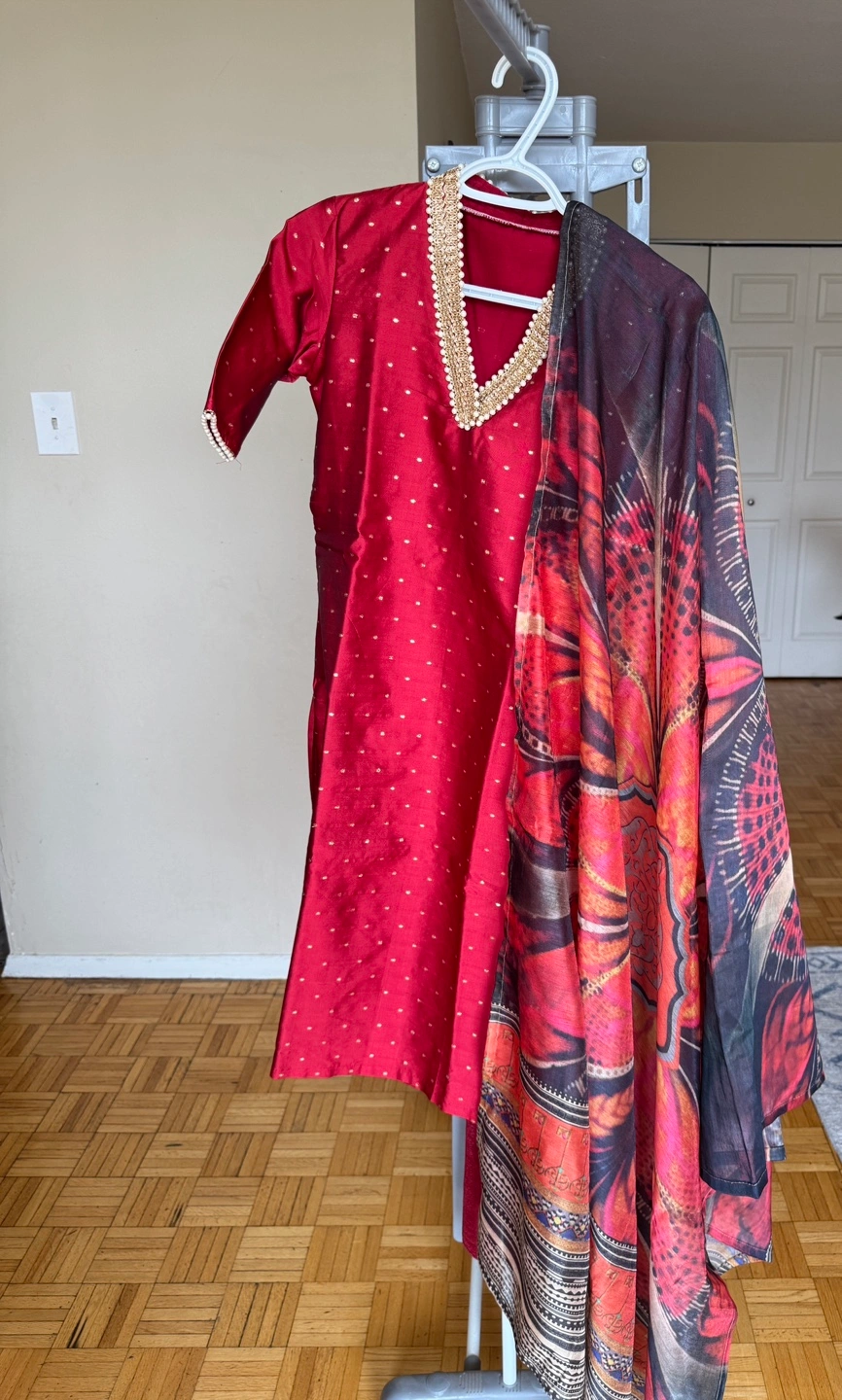 A beautiful red salwar kameez suit with a matching dupatta. This outfit is perfect for special occasions or everyday wear. The suit features a lovely design and comfortable fabric. It is brand new .Pickup near Dixie and Bloor