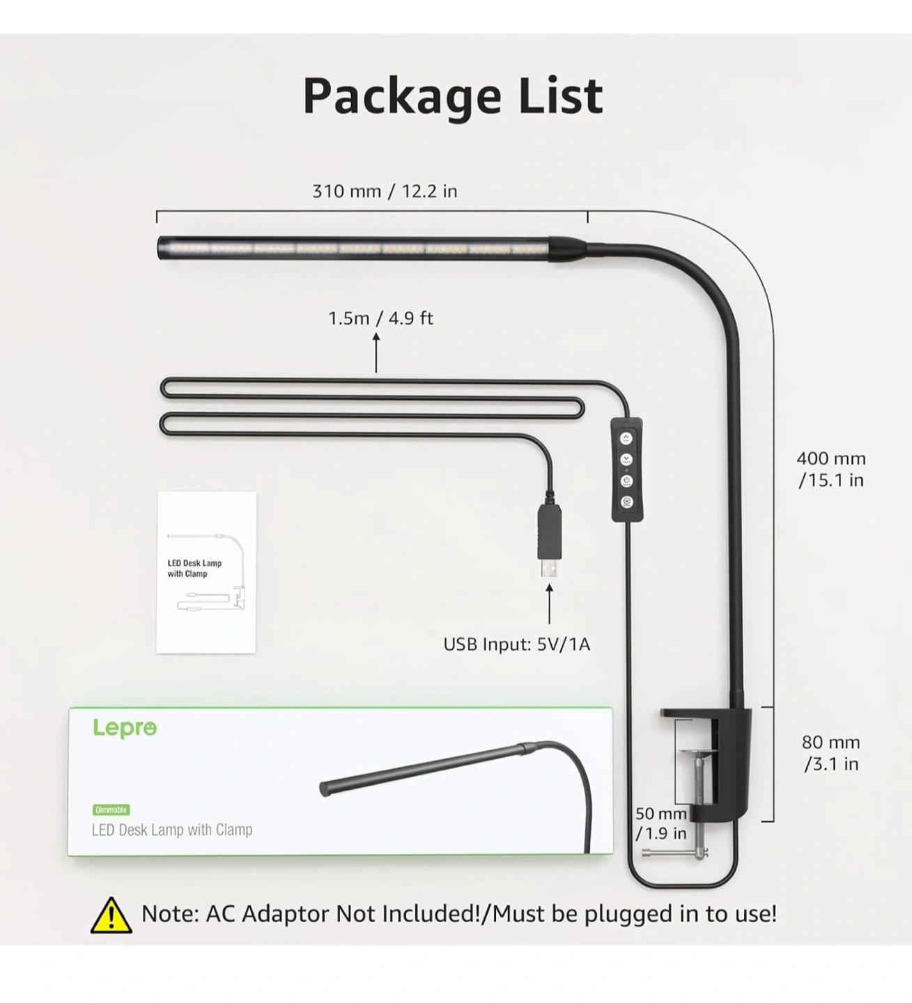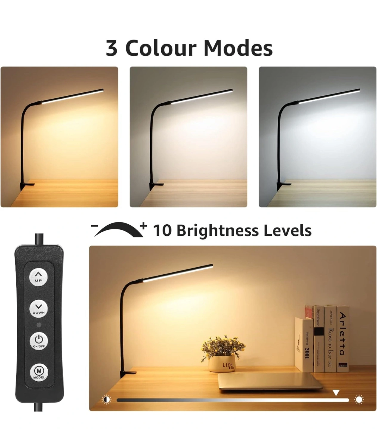 This Lepro LED desk lamp comes with a clamp for easy attachment to desks or headboards. It features: - 3 colour modes - 10 brightness levels - Eye-caring soft lights to help reduce eye strain Note that the AC adaptor is not included and the lamp must be plugged in to use