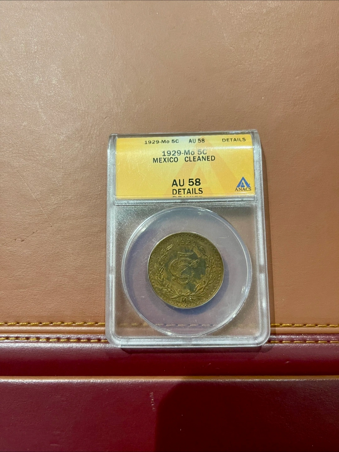 Selling a 1929 Mexico 5c coin, graded AU 58 Details by ANACS. The coin is encapsulated and authenticated. A great item for coin collectors