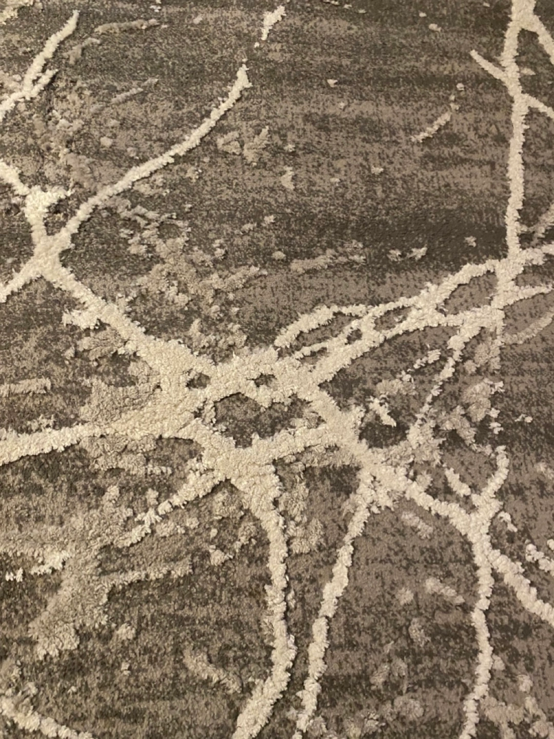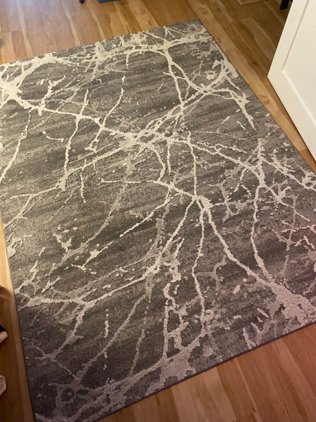 Selling a grey area rug with an abstract white pattern. It's in great condition and would look lovely in any room. The neutral colours make it easy to match with existing decor